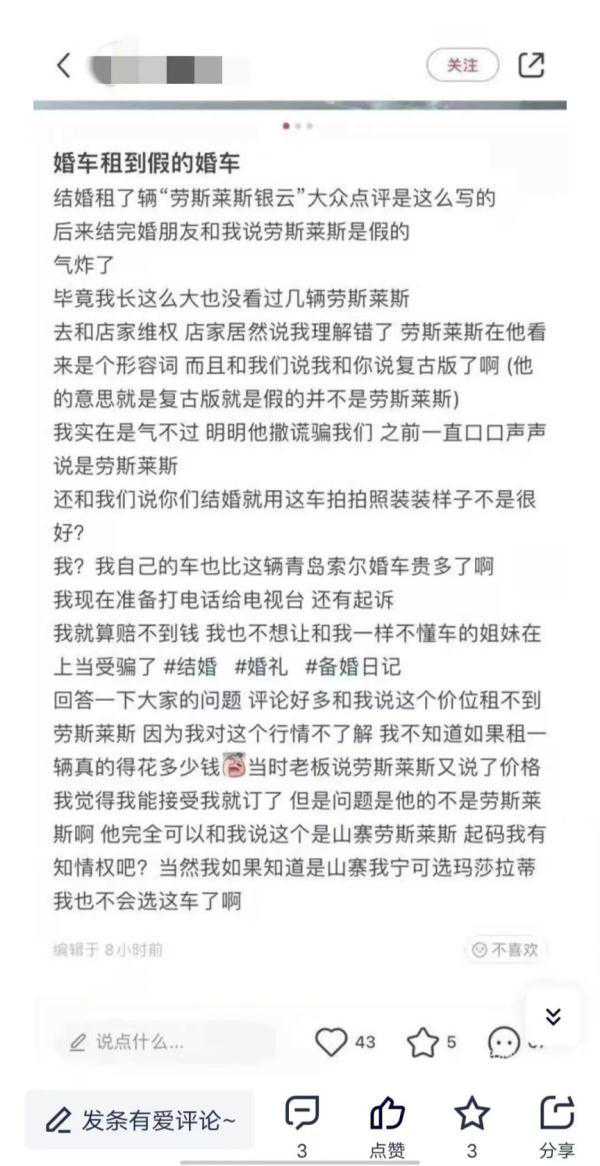 11月24日,上海市场监管披露了一起案件,有黑心婚庆公司为了一己私利,出租给新人一辆“假婚车”。 2023年8月2日,普陀区市场监管局对多家婚车租赁公司进行了现场检查发现,多家涉案的婚车租赁公司在某点评平台店铺上架了一款名为“劳斯莱斯银云”车的婚车租赁服务。 (注:劳斯莱斯银云是限量古董车,2013年广州曾以1500万元为底价开拍过一辆,现在的价值预估在2000万元以上) 2017年1月24日,四川成都老爷车展上的一辆1956年劳斯莱斯银云。 租赁服务页面显示,商家多次使用了“劳斯莱斯”“银云”“劳斯莱斯银云”等文字用以描述其提供的待租车辆。 本文图片均为“新闻坊”微信公众号图 然而,这些车辆并非劳斯莱斯。通过查验,所谓“劳斯莱斯银云”车的注册登记底档、行驶证件、产权证书等文件,并邀请权利人对涉案车辆进行辨认和鉴别,最终确认涉案车辆是一家国内汽车公司生产的某品牌汽车。 涉案的婚车租赁公司多次使用“劳斯莱斯”“银云”“劳斯莱斯银云”等文字或者图片,让消费者误认为其提供的该款待租车辆是劳斯莱斯汽车有限公司的银云车,或者与劳斯莱斯汽车有限公司存在特定联系。 本案中,各个当事人实际并不能提供真正的劳斯莱斯银云车租赁服务,只能提供某品牌汽车的租赁服务。即将出租给新人的劳斯莱斯银云车,是用某品牌汽车冒充的。 依据《中华人民共和国反不正当竞争法》第六条,经营者不得实施下列混淆行为,引人误认为是他人商品或者与他人存在特定联系:(一)擅自使用与他人有一定影响的商品名称、包装、装潢等相同或者近似的标识。涉案的婚车租赁公司构成了商业混淆的违法行为。 市场监管部门提醒,经营者在提供服务中,必须如实地向消费者明确说明所售商品或者服务的价格、产地、生产者、用途、性能、规格、等级、等内容,不得欺诈消费者。经营者在经营活动中也要守法经营,公平竞争。投机取巧企图“搭便车”“冒名牌”“傍名牌”的行为有可能违反相关法律法规,最终得不偿失。
