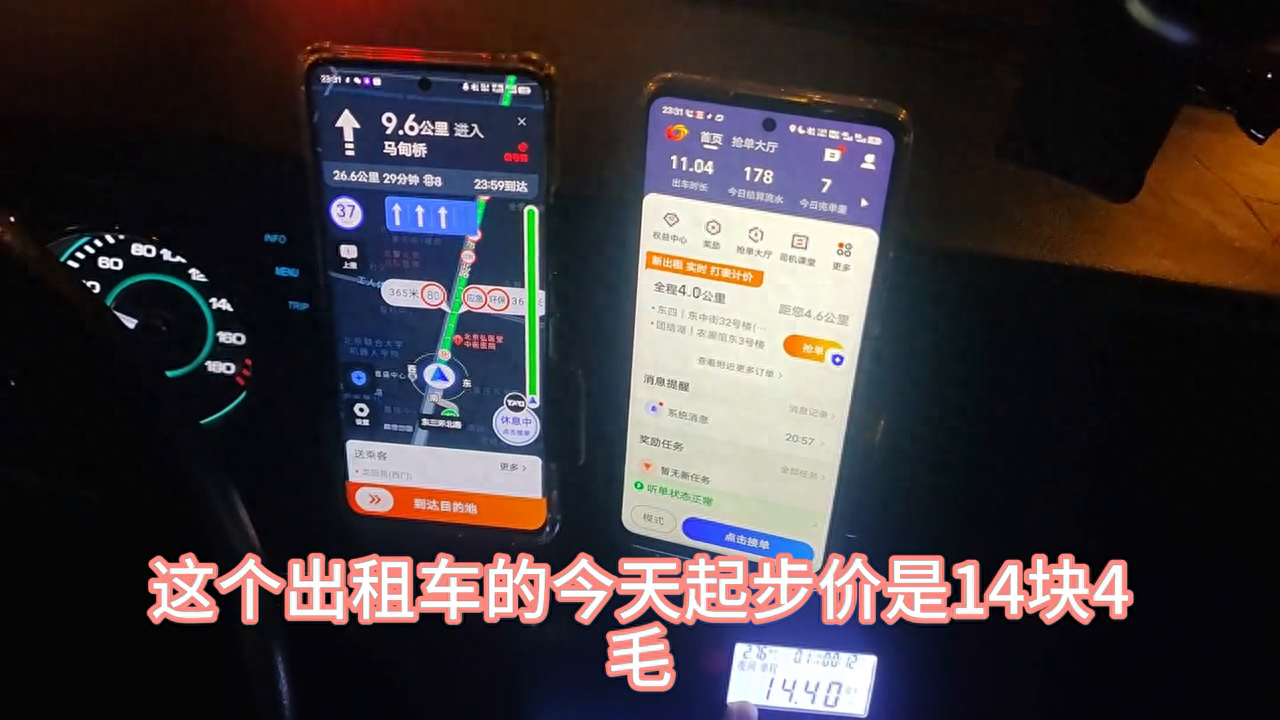 网约车出租车价格对比。 这一单是网约车订单,这一单是从东三环到回龙观的,现在打表可以看一下两个相差多少钱。 你好哥,手机尾号多少? 6163。 出租车的今天起步价是14块4毛,单价是2块7毛6,超过15公里以上是4块钱一公里。这一单从东三环到回龙观是50,已经送到了,加上高速费4块,这是54块钱。这一单是网约车,打表是105,相差整整一倍。从东三环的那一单一直到回龙观,这一单打表是一百多,但是网约车只打了54块钱,两个价格相差将近一倍,这个差的很是真不少。 但是乘客支付了78块钱,车程抽了将近30%了,差不多了,二十七八,卡着交通管理局的标准,就差这么一点点就超额了,没办法,网约车抽成真是太厉害了。 今天就先这样说,我是老驴,拜拜。