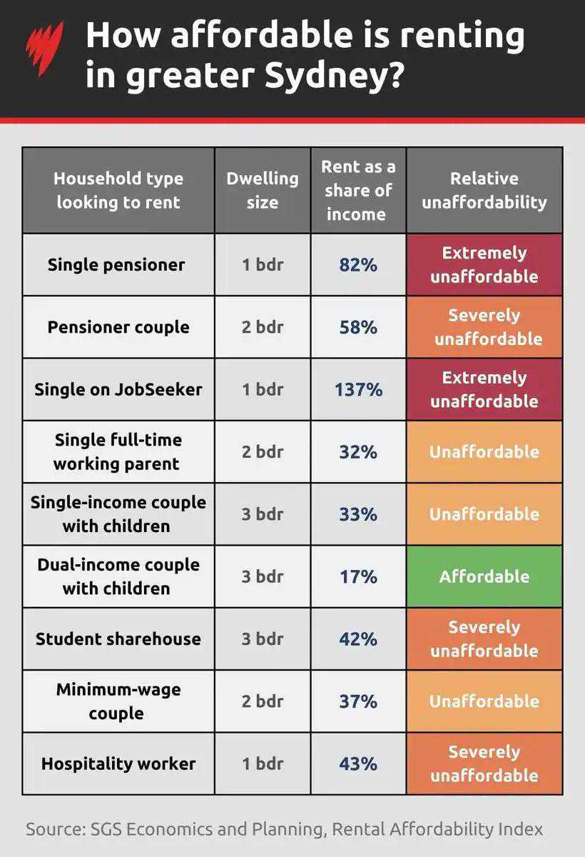 随着澳洲租金上涨从城市蔓延到偏远地区,在各州,租金可负担性都越来越差。 根据全国庇护所(NationalShelter)和SGSEconomicsPlanning的年度租金可负担性数据,在过去的12个月里,除了堪培拉和霍巴特外,所有城市的租房可负担性都大幅下降。 昆州偏远地区的租房者受到的打击最大,当地的租金可负担性降至全国最低的水平。昆州的租房者现在至少要将收入的30%用于房租。 与此同时,新州的租金可负担性降幅最大,目前租金占家庭收入的29%。而且,在全国十个租金最难以承受的邮政编码区中,六个都位于新州。 该数据还显示了全国不同家庭的租租金负担能力。 领取求职者津贴的单身人士在所有的首府城市都无法负担得起房租,一居室的租金占到他们收入的75%,即使是在最便宜的偏远地区,这一比例也达到53%。 除了霍巴特和阿德莱德以外,在澳大利亚其他的首府城市,单收入的养老福利金领取者至少将收入的50%用于房租。 在除霍巴特和阿德莱德以外的首府城市,单收入的养老福利金领取者也至少需要花费50%的收入用于租房。 根据数据,在首府城市,有孩子的双职工家庭的房租支出占家庭总支出的比例最低。 那么,在每个州租房的财务难度有多大??如果你希望租到更便宜的房子,应该避开哪个邮政编码区呢? 在该州,全澳租金最高的六个邮编区都位于海港城市,所有内城区的租金都被认为是负担不起或极难负担,这一租金可负担性为自2017年以来最低。 这些邮政编码区是Seaforth、Northbridge、Belrose、FrenchsForest、Warriewood和Avalon/Bilgola。 一般的租房家庭必须住在离城市15至20公里的地方,在那他们才能找到负担得起的房子。 领取求职者津贴的单一收入家庭租不起房子,因为租金达到他们收入的137%。 在新州的一些偏远地区,房租正处于人们无法承受的边缘,在沿海地区以及Bathurst,MaitlandandWagggaWagga等地,人们的租金压力最大。 尽管在过去12个月,墨尔本的租金上涨了16%,但依旧是澳大利亚租金负担性最强的首府城市, 在墨尔本中央商务区周围15公里内的房租被视为可负担的,而Brighton、Hampton和Beaumaris等沿海郊区仍然是租金最难以负担的地区。 在维州的偏远地区,租金可负担性都有所下降,疫情以来,Torquay和ApolloBay的租金变得极难负担,而Kerang、Nhil和Numurka则是租房的最佳地方。 在大布里斯班地区,绝大多数郊区的房租可负担性都下降一到两个等级,现在找不到真正负担得起的地区。 包括Woodford、Rosewood、SandstonePoint和Caboolture在内的市郊地区,租金可负担性下降了20%。 就租金占收入的比例而言,昆州偏远地区是租金最难以负担的地方,因为这里的房租和布里斯班的差不多,而工资却更低。 Eumundi被列入租金最难以负担的郊区前十,Tewantin、Cooroy和NoosaHeads的租金都极难负担。 从BellevueHeights到毗邻中央商务区的吉尔曼Gillman的区域的租金不再便宜,大多数租房者不得不在距离中央商务区30公里的地方寻找租金适合的房子。 该州偏远地区的租金在过去一年上涨12.9%,但这些地区的房租中位数仍然是全国最低的。 从2020年年中开始,大珀斯地区的租金上涨了52.4%,这是自2016年以来该市房租首次出现中度令人难以承受的情况。不过,在中央商务区和Marangaroo以北的一些郊区,租金仍然令人可以负担。 自2016年以来,该城市首次出现了租金令人负担不起的情况。中央商务区和Marangaroo北部的一些郊区的租金仍然在人们可以接受的范围。 虽然大部分偏远地区的租金还是让人能够负担,但不同区域中心和边远地区的租金差异很大。 自2016年以来,AppleIsle的租金中位数增长了60%。霍巴特的租金现在几乎与墨尔本的持平,尽管租房者的平均家庭收入比墨尔本的低21%。 大霍巴特地区是全国两个租金可负担性有所改善的地区之一。 而在偏远地区,租金可负担性跌至历史新低。最负担得起的地区位于该州西北部,但不包括Bernie和Devonport。
