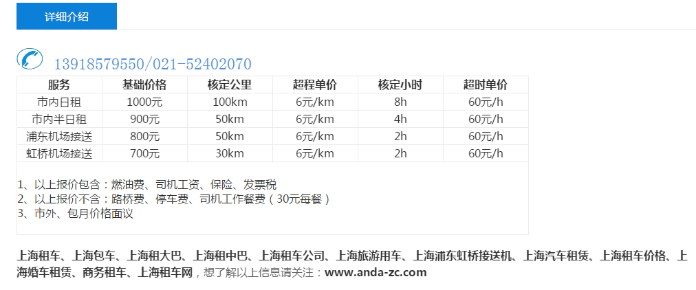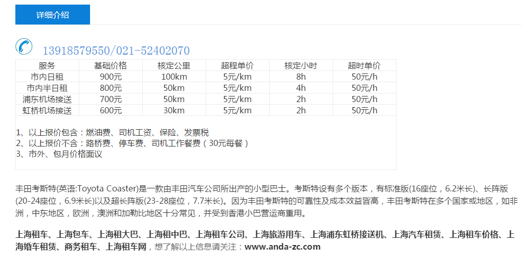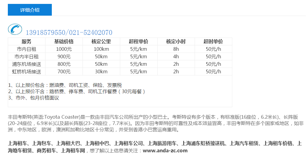 大巴主要有宇通大巴车和丰田考斯特两款车型。 从座位数上来看这两种车又可以细分为这些情况: 大巴主要有33座、37座、45座以及55座 考斯特主要有19、22、23座以及26座。 再从看由谙达提供的租车价格数据来看: 33座大巴市内日租价格为1000元,使用的范围为100公里、8小时,如果超过100公里需要支付6元每公里超公里费用,超过8小时需要支付60元每小时超时费用,如果您的使用时间和使用的公里数比较长,建议您使用这款套餐。市内半日租价格为900元,使用的范围为50公里、4小时,如果超过50公里需要支付6元每公里超公里费用,超过4小时需要支付60元每小时超时费用,如果您使用的时长和公里数不多推荐您使用该套餐。33座大巴的接机价格为800元,使用的范围为50公里、2小时、如果超过50公里需要支付6元每公里超公里费用,超过2小时需要支付60元每小时超时费用。虹桥机场接送的价格为700元,使用的范围为30公里、2小时、如果超过30公里需要支付6元每公里超公里费用,超过2小时需要支付60元每小时超时费用。备注见下图: 37座大巴市内日租价格为1100元,使用的范围为100公里、8小时,如果超过100公里需要支付6元每公里超公里费用,超过8小时需要支付60元每小时超时费用,如果您的使用时间和使用的公里数比较长,建议您使用这款套餐。市内半日租价格为1000元,使用的范围为50公里、4小时,如果超过50公里需要支付6元每公里超公里费用,超过4小时需要支付60元每小时超时费用,如果您使用的时长和公里数不多推荐您使用该套餐。37座大巴的接机价格为900元,使用的范围为50公里、2小时、如果超过50公里需要支付6元每公里超公里费用,超过2小时需要支付60元每小时超时费用。虹桥机场接送的价格为800元,使用的范围为30公里、2小时、如果超过30公里需要支付6元每公里超公里费用,超过2小时需要支付60元每小时超时费用。备注见下图: 45座大巴与55座价格一样,市内日租价格为1200元,使用的范围为100公里、8小时,如果超过100公里需要支付6元每公里超公里费用,超过8小时需要支付60元每小时超时费用,如果您的使用时间和使用的公里数比较长,建议您使用这款套餐。市内半日租价格为1100元,使用的范围为50公里、4小时,如果超过50公里需要支付6元每公里超公里费用,超过4小时需要支付60元每小时超时费用,如果您使用的时长和公里数不多推荐您使用该套餐。45和55座大巴的接机价格为1000元,使用的范围为50公里、2小时、如果超过50公里需要支付6元每公里超公里费用,超过2小时需要支付60元每小时超时费用。虹桥机场接送的价格为900元,使用的范围为30公里、2小时、如果超过30公里需要支付6元每公里超公里费用,超过2小时需要支付60元每小时超时费用。备注见下图: 19~23座考斯特的价格一样,市内日租价格为900元,使用的范围为100公里、8小时,如果超过100公里需要支付5元每公里超公里费用,超过8小时需要支付50元每小时超时费用,如果您的使用时间和使用的公里数比较长,建议您使用这款套餐。市内半日租价格为800元,使用的范围为50公里、4小时,如果超过50公里需要支付5元每公里超公里费用,超过4小时需要支付50元每小时超时费用,如果您使用的时长和公里数不多推荐您使用该套餐。19~23座考斯特的接机价格为700元,使用的范围为50公里、2小时、如果超过50公里需要支付5元每公里超公里费用,超过2小时需要支付50元每小时超时费用。虹桥机场接送的价格为600元,使用的范围为30公里、2小时、如果超过30公里需要支付5元每公里超公里费用,超过2小时需要支付50元每小时超时费用。备注见下图: 26座考斯特市内日租价格为1000元,使用的范围为100公里、8小时,如果超过100公里需要支付5元每公里超公里费用,超过8小时需要支付50元每小时超时费用,如果您的使用时间和使用的公里数比较长,建议您使用这款套餐。市内半日租价格为900元,使用的范围为50公里、4小时,如果超过50公里需要支付5元每公里超公里费用,超过4小时需要支付50元每小时超时费用,如果您使用的时长和公里数不多推荐您使用该套餐。26座考斯特的接机价格为800元,使用的范围为50公里、2小时、如果超过50公里需要支付5元每公里超公里费用,超过2小时需要支付50元每小时超时费用。虹桥机场接送的价格为700元,使用的范围为30公里、2小时、如果超过30公里需要支付5元每公里超公里费用,超过2小时需要支付50元每小时超时费用。备注见下图: 以上就是上海大巴车的行情哦,商业机密不要告诉别人哦。出门租车千万要注意了。