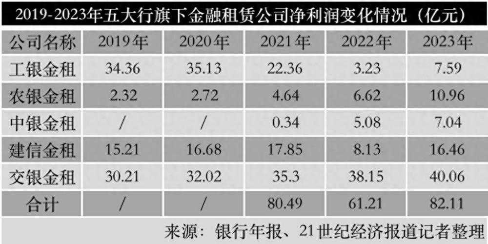 21世纪经济报道记者唐婧北京报道 目前,国有五大行均通过设立子公司的形式开展金融租赁业务,分别是交银金融租赁有限责任公司(下称“交银金租”)、工银金融租赁有限公司(下称“工银金租”)、建信金融租赁有限公司(下称“建信金租”)、农银金融租赁有限公司(下称“农银金租”)、中银金融租赁有限公司(下称“中银金租”)。 据五大行年报披露,截至2023年末,以上五家金融租赁公司资产规模合计超过9900亿元,去年共实现净利润超过80亿元,同比增长了34.14%。 其中,工银金租和建信金租的净利润同比翻倍,分别增长了134.98%和102.46%;农银金租和中银金租的净利润也实现了两位数增长,分别增长了65.56%和38.58%;交银金租的净利润同比增速最慢,为5.01%,但其盈利几乎相当于其他四大行旗下金租的利润总和。 所谓金融租赁,是指由出租人根据承租人请求,按双方合同约定,从指定卖家购买承租人指定固定资产,在出租人拥有该固定资产所有权前提下,以承租人支付租金为条件,将一定时期该固定资产的占有、使用和收益权让渡给承租人。 在经济发达国家,金融租赁已经成为设备投资中仅次于银行信贷的第二大融资方式。而银行系金租公司则凭借资本、资金、风控等优势,在租赁行业中的影响力举足轻重。 五大行旗下的金融租赁公司中,交银金租的业绩最为耀眼,去年实现净利润40.06亿元,超出第二名农银金租近30亿元。在总资产规模上,交银金租亦是佼佼者,截至去年末,总资产为4046.64亿元,是五家中唯一突破4000亿元的金融租赁公司。 年报显示,报告期内,交银金租深度服务国家重大战略,持续加大京津冀、长三角、粤港澳等重点战略区域支持力度,报告期末三大区域租赁资产余额1,044亿元,较上年末增长20.76%,占境内业务的47%。 交银金租聚焦“三新一高”,深化转型创新,支持高水平科技自立自强。报告期内,新基建、新能源租赁业务投放327.21亿元,同比增长94.41%;制造业投放222.25亿元,同比增长141.26%;服务科技型企业89户,投放168.25亿元,同比增长超100%。 报告期内,交银金租还作为唯一的金融租赁公司入选原上海银保监局科技金融试点机构,牵头成立上海金融租赁服务集成电路产业实验室。此外,年报还称,交银金租的租赁资产、营业收入等指标均位居金融租赁行业首位。 资料显示,交银金租是交通银行全资子公司,于2007年12月正式开业,是最早一批获批成立的银行系金融租赁公司,注册资本200亿元。交银金租在交通银行系统中具有很强的战略地位,长期以来交通银行通过持续注入资本、客户渠道分享、流动性支持以及人才支持等多种方式支持交银金租业务发展。 根据年报数据测算,报告期内,交银金租实现净利润40.06亿元,而去年交通银行合并报表的净利润为927.28亿元,即交银金租的贡献比例约为4.32%,显著高于其他四大行旗下金租。 值得注意的是,农银金租的资产规模首次突破千亿大关,但仍排在交银金租、工银金租和建信金租之后,至此五大行旗下金租中有四家资产规模都突破千亿。 年报显示,截至2023年末,农银金租总资产1,037.05亿元,净资产122.70亿元,全年实现净利润10.96亿元,同比增长65.56%。农银金租深耕“三农”县域、航空航运、新能源、科创与先进制造等重点领域,形成了“三农”和绿色租赁两大经营特色,截至2023年末,绿色租赁、涉农租赁资产余额分别为687.70亿元、279.96亿元。 资料显示,农银金租是农业银行全资子公司,注册资本95亿元,成立于2010年9月,是农业银行综合化经营的重要战略板块之一。近年来,公司确立并形成了以“三农”、新能源、航空以及科创制造板块为核心的租赁业务发展布局,并在实际经营中结合外部经济发展趋势及产业政策变化,对业务结构进行及时调整和优化。 工银金租和建信金租的净利润则实现了同比翻倍,去年全年工银金租实现净利7.59亿元,同比大增134.98%,建信金租实现净利16.46亿元,实现净利102.46%。记者了解到,2023年全球航空业的稳步复苏可能是两家公司业绩向好的利好因素之一。 根据IATA数据,2023年全球航空客运总量同比增长36.9%,恢复至2019年水平的94.1%。惠誉博华预计,2024年航空业有望进一步复苏,有利于大型金融租赁公司的全球航空租赁业务。 工银金租是工商银行的全资子公司,也是国内首家银行系金融租赁公司,成立于2007年11月28日,注册资本180亿元。官网信息显示,依托工商银行的综合支持和覆盖全球的服务网络,工银金租形成了航空、海事、综合租赁三足鼎立的业务发展格局。 年报显示,工银金租主要经营航空、航运及能源电力、轨道交通、装备制造、专精特新等重点领域大型设备的金融租赁业务,提供租赁资产受让及转让、资产交易、资产管理等多项金融与产业服务。 建信金租为建设银行全资子公司,于2007年12月成立,注册资本为110亿元,是母行的核心租赁平台。建信金租主要业务板块包括一般租赁业务、航空租赁业务以及航运租赁业务。 根据惠誉博华的相关评级报告,建信金租一般租赁业务与母行充分协同联动,2023年6月末境内一般租赁资产规模达到936.1亿元,占该公司合计租赁资产的58.0%,主要行业涉及交通运输、制造业、电力及民生等领域。 航空航运租赁亦是建信金租目前加速发展的业务板块。建信金租境内客户包括国内主流航司,境外客户覆盖亚太和欧美等多个区域。2023年1月,建信金租在香港设立的航空航