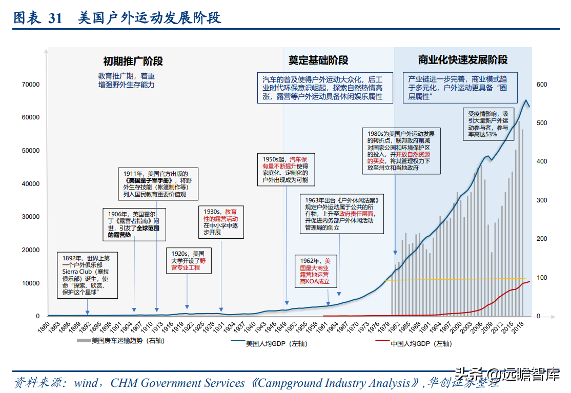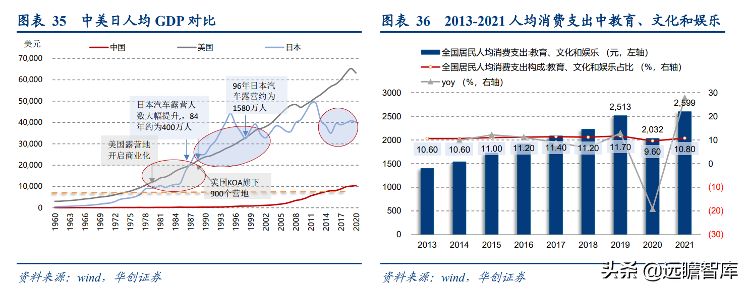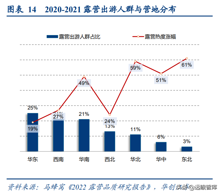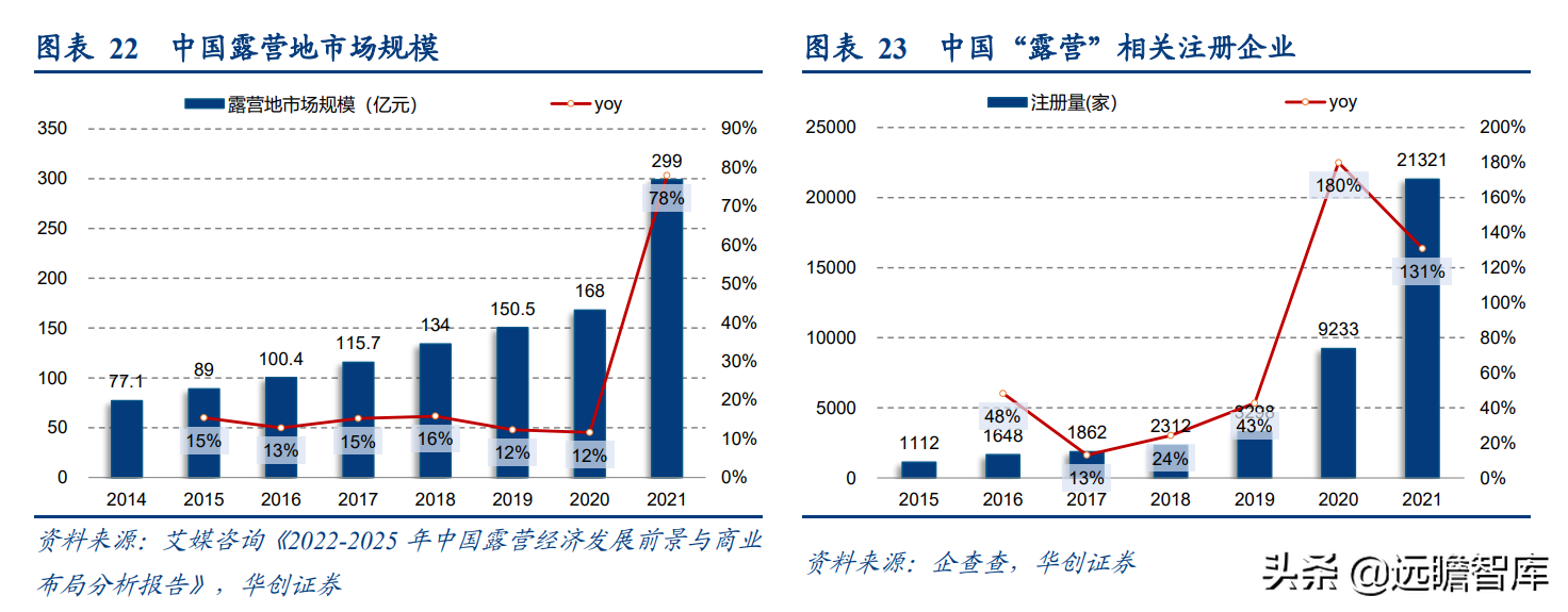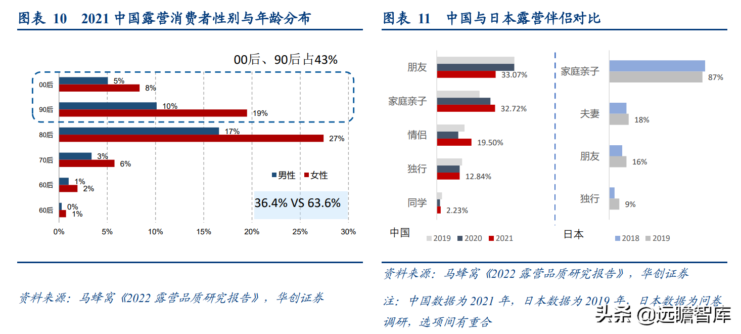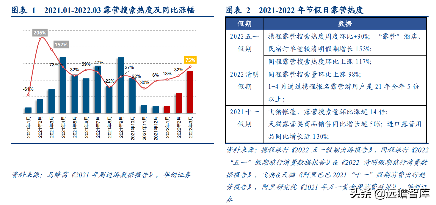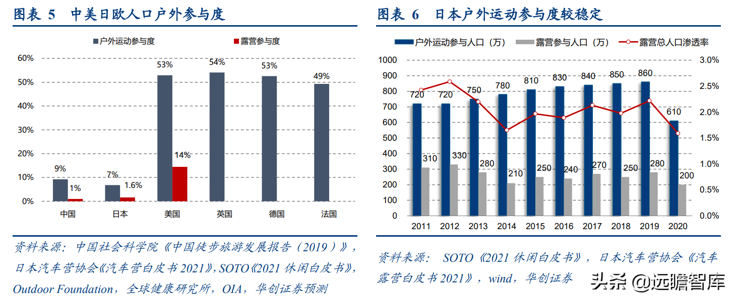 (报告出品方/分析师:华创证券王薇娜) (一)疫情带动近郊户外运动,中国户外市场持续增长 1、疫情防控催化,户外与露营需求大幅提升 疫情防控需求使得居民跨省流动受限,入住酒店花费不菲且可能增加风险暴露,周边游形式的户外活动热度增加,露营成为家庭聚会、朋友出行、接触户外的首选。 从21年清明假期开始,根据马蜂窝数据显示,2021年“周边游”的搜索热度同比增长2.5倍,其中3-4月春游旺季搜索热度增长3-5倍。2021年十一假期天猫露营用品销售量同比增长50%。 2022年春季综艺《一起露营吧》与小红书等社交平台内容教育下,露营需求再度爆发:小红书关于“露营”笔记数从22年初100万+笔记数,到5月底接近350万+笔记数。根据通联数据,22年1-4月天猫淘宝露营野炊装备累计成交额31.8亿元,环比翻倍增长。2022年1-4月通过携程报名露营游用户是2021年全年5倍以上。 供给端逐步优化,露营体验感提升,精致露营与“露营+”产品走俏。 精致露营概念在海内外走红,Glamping=Glamorous+Camping,主打远离自然条件恶劣的户外环境,追求享受户外。新增营地以帐篷营地、帐篷酒店为主,例如大热荒野旗下20家连锁露营地,定位野奢;嗨king20家营地更多在景区、特色小镇等开辟特色营地。 相比16-17年发展较快的房车营地,帐篷营地与自然融合度更高,在自然资源支持下开辟更多“露营+”活动。 2、中国千亿泛户外市场,户外参与度仍偏低 露营热度带动户外相关产品需求快速增长,中国泛户外市场以鞋服消费为主。我们估算中国泛户外市场近4000亿元。 根据通联数据,21年运动户外产品线上成交额共计3382亿元,线下渠道以迪卡侬为代表,我们预计2021年迪卡侬中国贡献营收超125亿元(2017年中国迪卡侬260+家门店实现105亿元收入,目前在中国已分布308家门店)。 根据通联数据,以线下为主专业户外市场约410亿元。我们预计泛户外市场中鞋服占比超6成,户外用品占比约3成,大约1200亿元,旅游产品等占比低于1成,根据中国钓具网数据2020年中国户外用品市场规模达1693亿元;根据通联数据21年天猫淘宝登山野营旅行用具销售规模达506亿。 中国运动参与度较低,其中露营渗透率不足1%。 中国参与户外运动人口约为1.3亿(2019年),在城镇人口中渗透率为15%,在总人口中渗透率约为9%。 欧美由于人文历史背景、对于户外生存教育的重视,所以户外参与度普遍较高。美国户外运动人口1.6亿,参与度为53%;以英国、德国、法国为代表的欧洲国家户外运动参与度也均超5成。 相较而言,日本参与户外运动的人口大约有800万,户外参与度为7%(20年略受疫情影响仅有610万人)。美国日本露营活动渗透率分别为14%/1.6%,中国渗透率不足1%。 户外运动泛指在自然环境进行的具有体验或探险性质的健身项目,既包含休闲需求,也包含野外生存型运动。中国户外运动更偏好徒步、健身登山、露营,兼具专业与休闲需求,消费粘性偏低但门槛低、潜在参与度高,适合亲子出行、朋友出行。相较海外较长户外运动发展历程,留存大量专业户外运动爱好者。 我们认为休闲式户外运动发展会先于专业式户外运动,户外运动规模化发展需要具备以下条件: 消费端: 1)人均GDP超1万美元,具备经济基础;2)GDP增速承压,期内人们工作压力较大,高线城市消费者更向往“一夕乌托邦”,且偏好低成本的旅行方式;3)户均汽车保有量较高,每千人汽车保有量达300辆左右。 供给端: 1)城市公园、郊区露营地、景区露营场景增加,资本推动露营地连锁化,标准化管理;2)户外设备快速适应中国市场需求,提高露营体验感。 (二)中国露营市场现状:小荷才露尖尖角 露营消费是休闲户外消费的典型,露营消费方式主要有四类: 1)公园露营,半日游为主,载体主要为城市公园(缺乏营地规划,密度高,缺乏商业化设施),消费者自带帐篷/天幕,人均消费0-80元(门票费); 2)精致露营/搬家露营,以2天1夜露营为主,设备全,人均消费150-200元(门票+营位租赁费、自备设备),拎包入住则人均700元以上,载体主要为商业化露营地(具备必要水电设备,甚至娱乐化项目,帐篷密度较低); 3)房车露营,过夜需求,载体主要在商业化房车营地,消费者自备/租赁房车,游玩时间1天以上,人均600元起(房车租赁550元~1700元+门票50元/天); 4)小屋露营,以多日游为主,主要在远离城市的郊区、中西部地区、丘陵/山岭/高原地带,更具特色。 16-17年在政策带动下,开出较多连锁营地的均为汽车/房车露营地,比如曾在新三板挂牌的奇瑞途居营地,旗下有20+汽车营地。 1、露营消费者:年轻人尝鲜需求为主,亲子游具有持续性 千禧一代为主力军,女性参与者更多,以朋友出行、家庭亲子游为主。根据露营天下数据,2017年预订房车露营的90后、00后仅占9%。根据马蜂窝数据,2021年露营消费者中90后、00后占比攀升至43%,4年间大幅提升28pct;80后占44%,基本维持稳定;70后占比大幅下降,仅占10%(17年占比28.6%)。 对比美国OIA数据,露营消费群体各年龄段分布相对均匀,Z世代综合占比32%。中国女性参与者更多,17年房车露营男女比例基本均衡,21年女性消费者均明显超过男性(男性:女性=36%:64%)。而美国则是男性参与者更多,性别比为男性:女性=54%:46%(近8年未改变)。 消费人群结构变化与海外形成差异的主要原因: 1)从中国消费需求端看,亲子游占比仅3成。年轻朋友出行“尝新需求为主”,日本露营人群8成以上与家人一同前往,更多追求与家人一起(占比41%)、孩