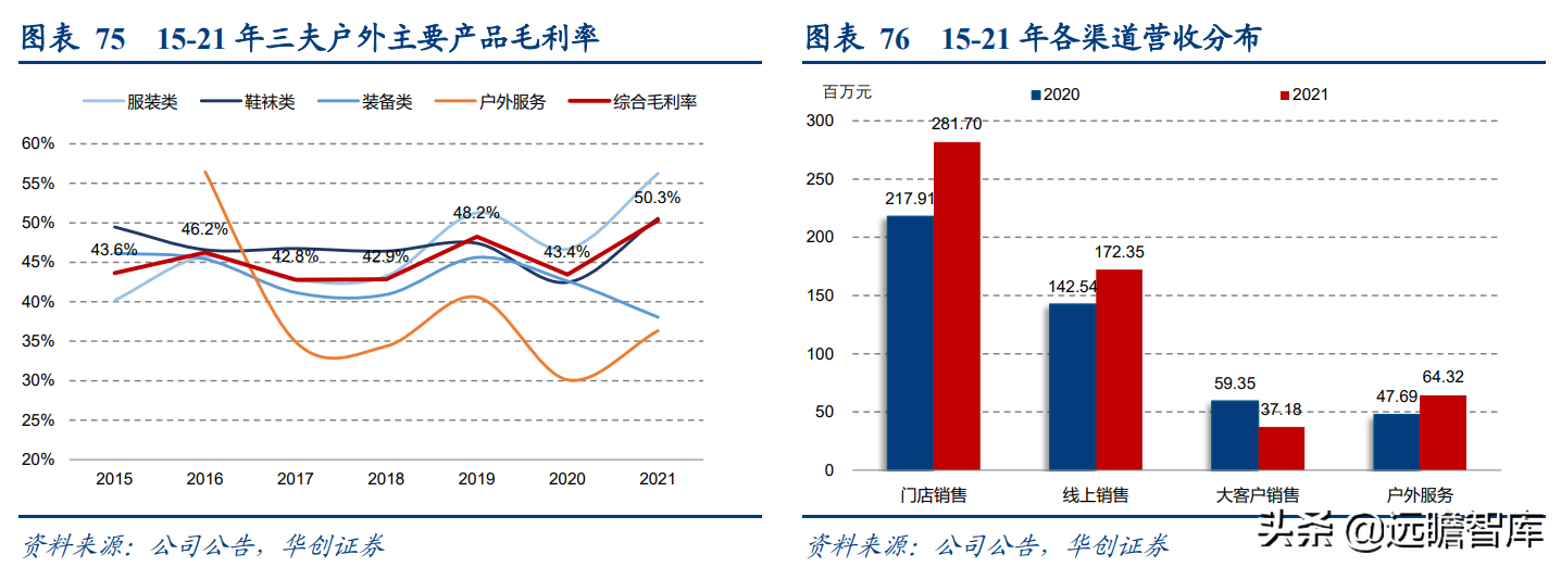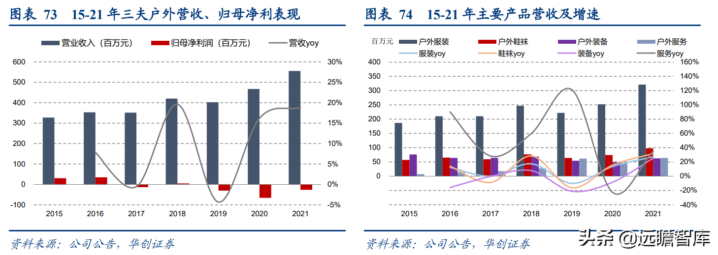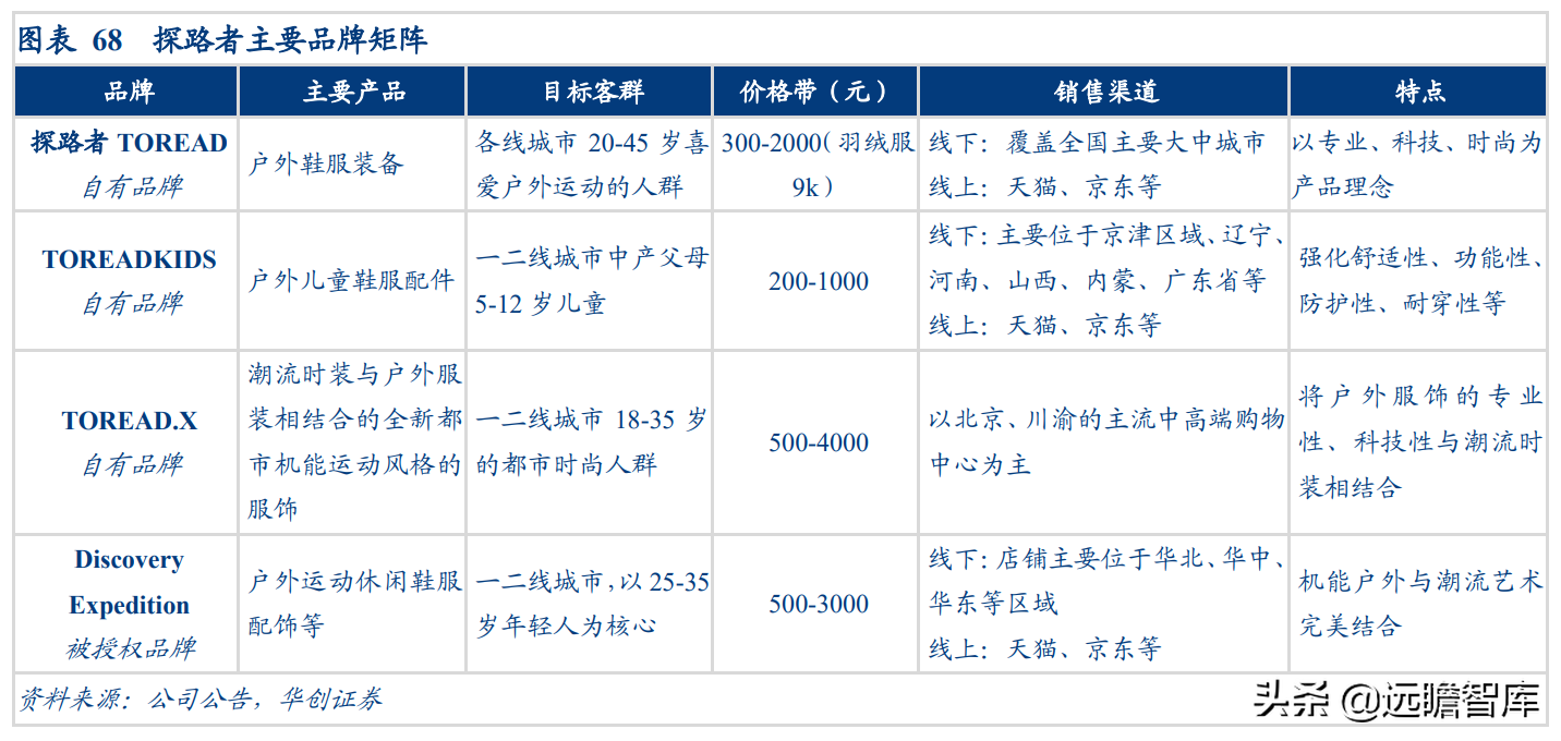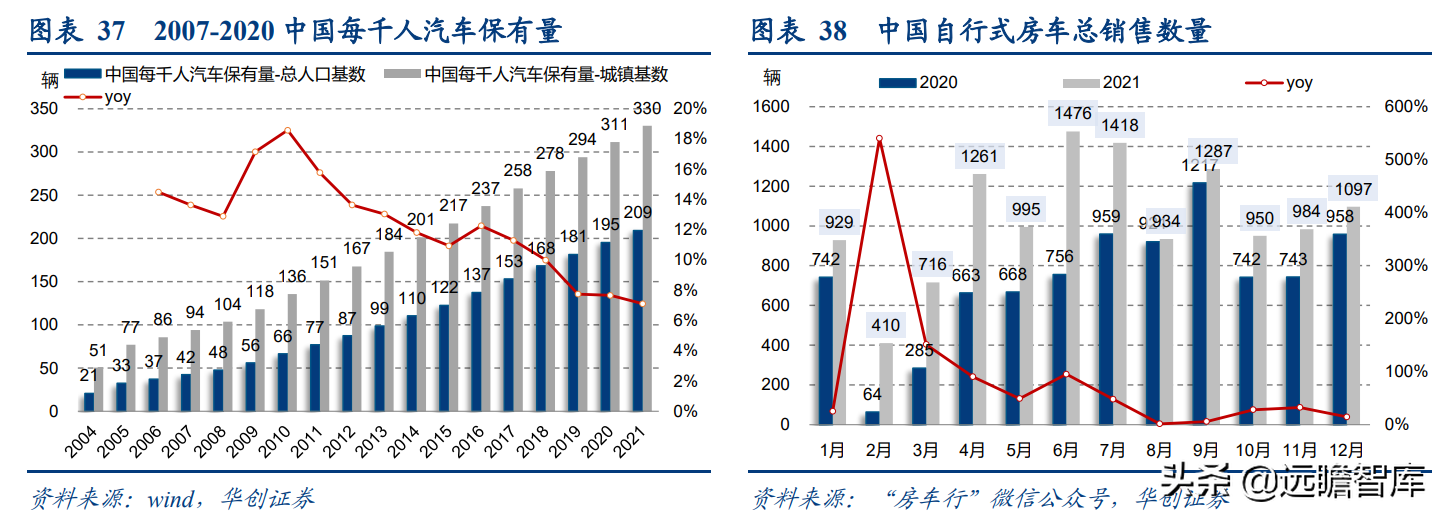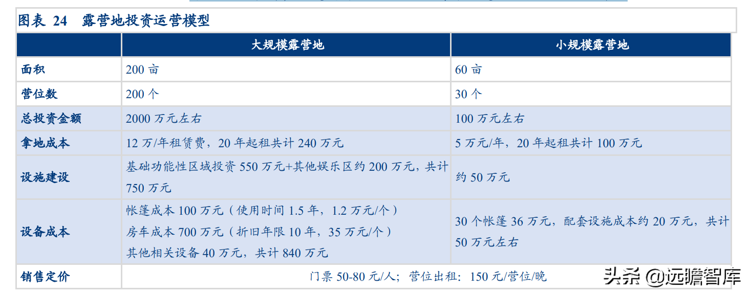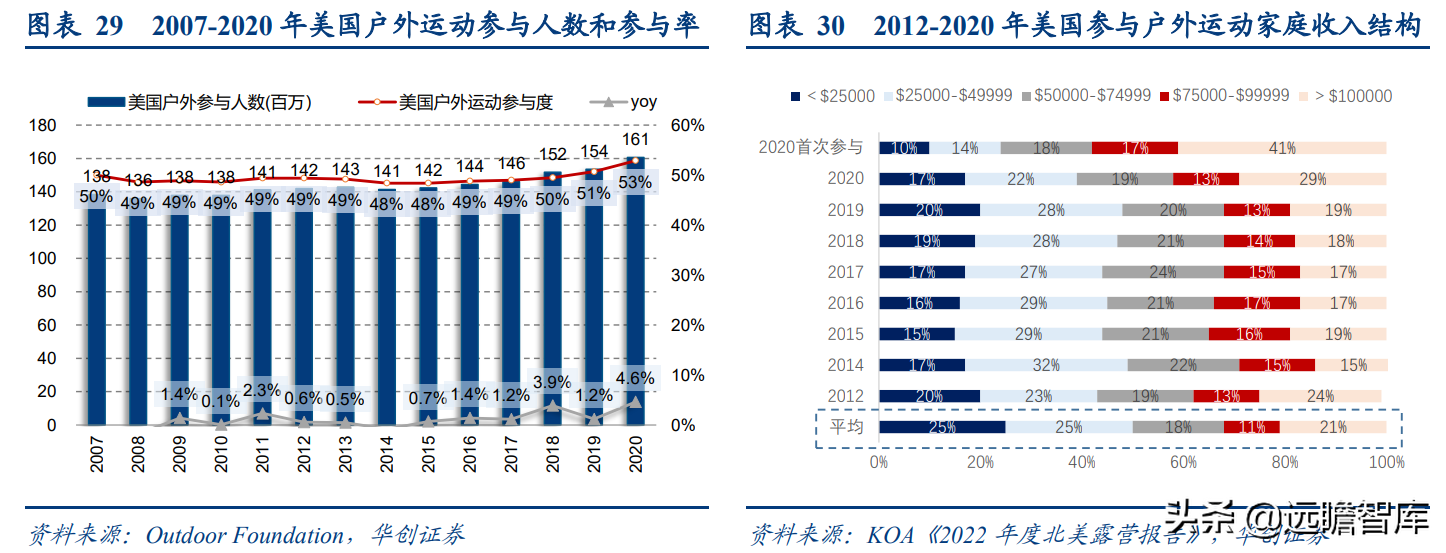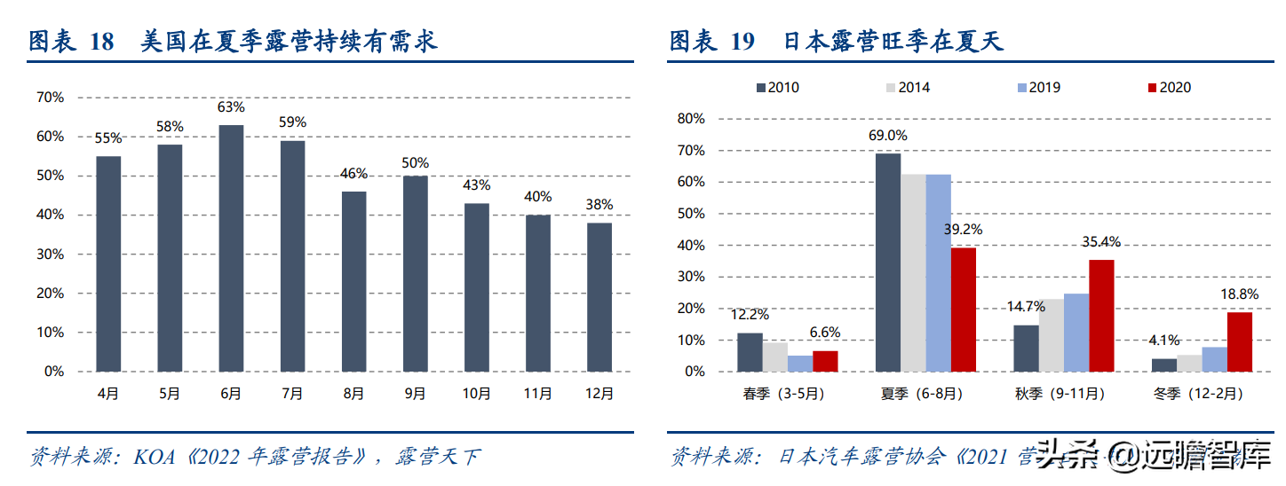 (报告出品方/分析师:华创证券王薇娜) (一)疫情带动近郊户外运动,中国户外市场持续增长 1、疫情防控催化,户外与露营需求大幅提升 疫情防控需求使得居民跨省流动受限,入住酒店花费不菲且可能增加风险暴露,周边游形式的户外活动热度增加,露营成为家庭聚会、朋友出行、接触户外的首选。 从21年清明假期开始,根据马蜂窝数据显示,2021年“周边游”的搜索热度同比增长2.5倍,其中3-4月春游旺季搜索热度增长3-5倍。2021年十一假期天猫露营用品销售量同比增长50%。 2022年春季综艺《一起露营吧》与小红书等社交平台内容教育下,露营需求再度爆发:小红书关于“露营”笔记数从22年初100万+笔记数,到5月底接近350万+笔记数。根据通联数据,22年1-4月天猫淘宝露营野炊装备累计成交额31.8亿元,环比翻倍增长。2022年1-4月通过携程报名露营游用户是2021年全年5倍以上。 供给端逐步优化,露营体验感提升,精致露营与“露营+”产品走俏。 精致露营概念在海内外走红,Glamping=Glamorous+Camping,主打远离自然条件恶劣的户外环境,追求享受户外。新增营地以帐篷营地、帐篷酒店为主,例如大热荒野旗下20家连锁露营地,定位野奢;嗨king20家营地更多在景区、特色小镇等开辟特色营地。 相比16-17年发展较快的房车营地,帐篷营地与自然融合度更高,在自然资源支持下开辟更多“露营+”活动。 2、中国千亿泛户外市场,户外参与度仍偏低 露营热度带动户外相关产品需求快速增长,中国泛户外市场以鞋服消费为主。我们估算中国泛户外市场近4000亿元。 根据通联数据,21年运动户外产品线上成交额共计3382亿元,线下渠道以迪卡侬为代表,我们预计2021年迪卡侬中国贡献营收超125亿元(2017年中国迪卡侬260+家门店实现105亿元收入,目前在中国已分布308家门店)。 根据通联数据,以线下为主专业户外市场约410亿元。我们预计泛户外市场中鞋服占比超6成,户外用品占比约3成,大约1200亿元,旅游产品等占比低于1成,根据中国钓具网数据2020年中国户外用品市场规模达1693亿元;根据通联数据21年天猫淘宝登山野营旅行用具销售规模达506亿。 中国运动参与度较低,其中露营渗透率不足1%。 中国参与户外运动人口约为1.3亿(2019年),在城镇人口中渗透率为15%,在总人口中渗透率约为9%。 欧美由于人文历史背景、对于户外生存教育的重视,所以户外参与度普遍较高。美国户外运动人口1.6亿,参与度为53%;以英国、德国、法国为代表的欧洲国家户外运动参与度也均超5成。 相较而言,日本参与户外运动的人口大约有800万,户外参与度为7%(20年略受疫情影响仅有610万人)。美国日本露营活动渗透率分别为14%/1.6%,中国渗透率不足1%。 户外运动泛指在自然环境进行的具有体验或探险性质的健身项目,既包含休闲需求,也包含野外生存型运动。中国户外运动更偏好徒步、健身登山、露营,兼具专业与休闲需求,消费粘性偏低但门槛低、潜在参与度高,适合亲子出行、朋友出行。相较海外较长户外运动发展历程,留存大量专业户外运动爱好者。 我们认为休闲式户外运动发展会先于专业式户外运动,户外运动规模化发展需要具备以下条件: 消费端: 1)人均GDP超1万美元,具备经济基础;2)GDP增速承压,期内人们工作压力较大,高线城市消费者更向往“一夕乌托邦”,且偏好低成本的旅行方式;3)户均汽车保有量较高,每千人汽车保有量达300辆左右。 供给端: 1)城市公园、郊区露营地、景区露营场景增加,资本推动露营地连锁化,标准化管理;2)户外设备快速适应中国市场需求,提高露营体验感。 (二)中国露营市场现状:小荷才露尖尖角 露营消费是休闲户外消费的典型,露营消费方式主要有四类: 1)公园露营,半日游为主,载体主要为城市公园(缺乏营地规划,密度高,缺乏商业化设施),消费者自带帐篷/天幕,人均消费0-80元(门票费); 2)精致露营/搬家露营,以2天1夜露营为主,设备全,人均消费150-200元(门票+营位租赁费、自备设备),拎包入住则人均700元以上,载体主要为商业化露营地(具备必要水电设备,甚至娱乐化项目,帐篷密度较低); 3)房车露营,过夜需求,载体主要在商业化房车营地,消费者自备/租赁房车,游玩时间1天以上,人均600元起(房车租赁550元~1700元+门票50元/天); 4)小屋露营,以多日游为主,主要在远离城市的郊区、中西部地区、丘陵/山岭/高原地带,更具特色。 16-17年在政策带动下,开出较多连锁营地的均为汽车/房车露营地,比如曾在新三板挂牌的奇瑞途居营地,旗下有20+汽车营地。 1、露营消费者:年轻人尝鲜需求为主,亲子游具有持续性 千禧一代为主力军,女性参与者更多,以朋友出行、家庭亲子游为主。根据露营天下数据,2017年预订房车露营的90后、00后仅占9%。根据马蜂窝数据,2021年露营消费者中90后、00后占比攀升至43%,4年间大幅提升28pct;80后占44%,基本维持稳定;70后占比大幅下降,仅占10%(17年占比28.6%)。 对比美国OIA数据,露营消费群体各年龄段分布相对均匀,Z世代综合占比32%。中国女性参与者更多,17年房车露营男女比例基本均衡,21年女性消费者均明显超过男性(男性:女性=36%:64%)。而美国则是男性参与者更多,性别比为男性:女性=54%:46%(近8年未改变)。 消费人群结构变化与海外形成差异的主要原因: 1)从中国消费需求端看,亲子游占比仅3成。年轻朋友出行“尝新需求为主”,日本露营人群8成以上与家人一同前往,更多追求与家人一起(占比41%)、孩