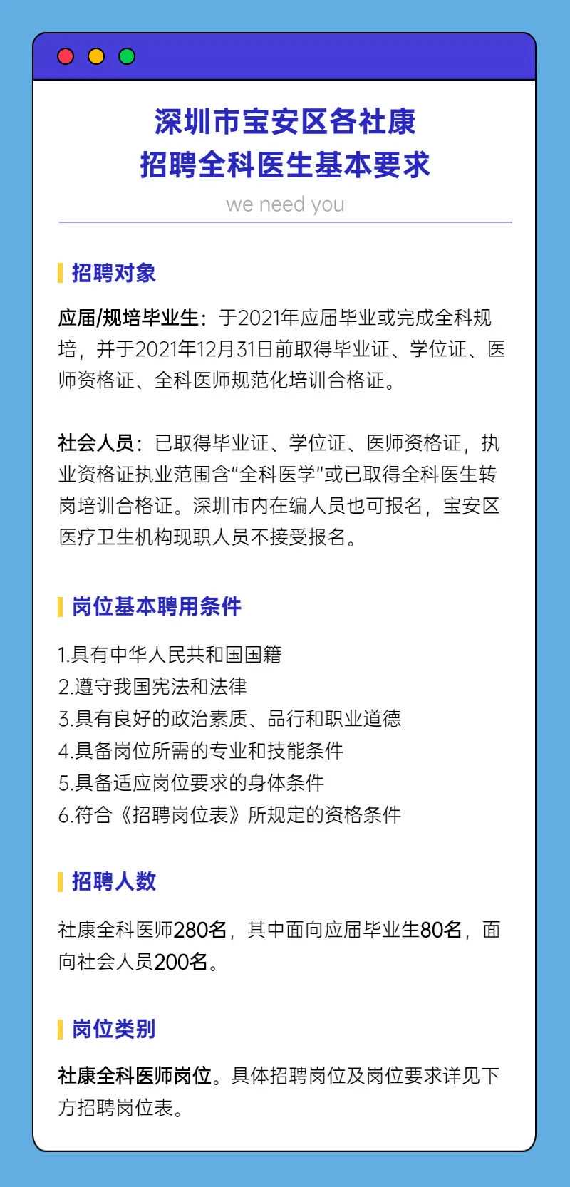 基层需要更多的好医生 基层也能锻炼出更好的医生 即使是小小的社康 也能让他们一展身手 收获非凡 因此 在社康成为越来越多年轻医生的选择之际 深圳市宝安区也面向全国 发起了全科医生的招聘 为准医生提供了更多的就业机会 只等着你来 创造更多的故事 一 基本要求 二 招聘岗位表 三 薪资待遇 1.本次招聘入职的全科医师岗位,待遇年收入约25-50万(含五险一金),具体根据工作岗位及工作绩效确定。 2.符合条件的规培医师到社康中心工作的,发放生活补助(全日制博士35万元,全日制硕士30万元,全日制本科25万元); 3.符合宝安区高层次人才标准(如:40周岁以下全日制博士)并经认定的,可享受20万元生活补助,免租入住90㎡人才住房; 4.可申请轮候入住宝安区人才公共租赁住房; 5.实施社区健康服务中心人才培养计划,对新通过国际全科医生技能培训中心考核或深圳市全科医生技术标准认证并取得相应证书的人员给予每人6万元的一次性奖励。 四 招聘流程 (一)报名 1、报名时间 2021年9月19日8:00至2021年12月15日24:00 2、报名方式 3、报考材料 报名同时请上传相关证件(应届/规培毕业生:身份证、毕业证、学位证、学历学位验证证明、医师资格证、全科医师规范化培训合格证;社会人员:毕业证、学位证、学历学位验证证明、医师资格证、执业资格证或全科医生转岗培训合格证),并填写《深圳市宝安区卫生健康局全科医师志愿填报表》(见下方)。当招聘岗位录取人数达到该岗位拟录取人数,则停止报名。 可以填报的七家医院如下: 宝安区人民医院 宝安区中医院 宝安区中心医院 宝安区福永人民医院 深圳市中西医结合医院 宝安区松岗人民医院 宝安区石岩人民医院 学历验证证明可登录中国高等教育学生信息网()进行在线验证,并上传《教育部学历证书电子注册备案表》(《教育部学历证书电子注册备案表》需在有效期内)。学位验证证明可在学位网()查询并下载。学历为境外学历的,须提供国家教育部留学生服务中心出具的《国外学历学位认证书》。未在规定时间内按要求提供完整报名材料的,将不予受理报名,相关责任由报名人员自行承担。 (二)资格筛选 招聘单位每周对报名人员的信息进行审核,符合岗位要求条件的纳入线上面试名单。 (三)线上面试 从网上报名开始后每周组织一次线上面试,每名报名人员仅1次面试机会,面试时间和相关要求以招聘单位通知为准。 1、形式 2、计分 面试成绩满分为100分,60分以上合格。面试成绩作为招聘单位录取参考标准之一,非唯一录取依据。 (四)双向选择 (五)试工 确定拟录用单位后1周内,由各招聘单位自行安排考生试工。试工合格的考生办理入职及注册手续。试工不合格考生由招聘单位书面告知考生,区卫生健康局对试工情况进行及时回访。 (六)入职 录取单位为拟录用的考生办理入职及注册手续。 怎么样 报名流程都清楚了吗 希望有梦想的你抓住这次机会 和他们一样在社康这个小世界里 获得那些 责任与爱相互成就的经历 在咱们身边的社康大夫们 其实都是深藏不露的 “全能高手” 更是附近居民心里 “最可爱的人” 走心选择 她出了校园就到这里 提起在社康当医生的感觉 宝安区福永人民医院塘尾社康的 90后中医全科医生赖欣很有发言权 不同于医院 社康是依托周边居住环境设立的 面向的是周围的居民 赖欣是在2019年 加入宝安区福永人民医院塘尾社康的 工作三年间 她遇到过不少令其印象深刻的患者 在赖欣看来 社康的工作不及医院惊心动魄 日常面临的更多是 不危及生命的慢性病和身体不适 可即便如此 她依然能在这里发光发热 “作为一个基层医生,通过自己的绵薄之力,能帮助到一个个患者、一个个家庭,让他们生活得更好,我觉得是很好的事情,这也会让我更加坚定自己要留在这里做这件事。” 反向就业 他从三甲医院到这里 和赖欣一样 黄蜻蜓也是一名90后社康医生 去年9月 黄蜻蜓加入了深圳市中西医结合医院沙头社康 担任全科主治医师 在深圳市中西医结合医院沙头社康 黄蜻蜓一个月可以接诊一千多位患者 日均接诊患者六十余位 黄蜻蜓介绍 来社康就诊的患者多为附近居民 患有的大多是基础疾病 是需要长期复诊的 一来二去 黄蜻蜓也与患者建立起了良好的关系 黄蜻蜓介绍 社康的工作是“专业诊疗+社区服务” 除了日常接诊患者 他也是一名家庭医生 可以为慢性病患者特别是高血压 糖尿病居民提供全程健康管理 让居民享受用药优惠 还可以为有需要的居民建立家庭病床 提供居家康复护理 “社康的诊疗思维锻炼我能从多个角度去了解病人情况,而不是单独从疾病本身来治疗。每天和不同的患者接触交流,对自己医患交流水平也是提高了不少,所以说收获还是蛮多的。” 责编/李庭新曾舒琪 编辑/李可