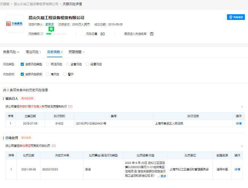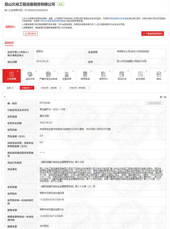 6月22日,常熟市住房和城乡建设局作出常住建罚决﹝2022﹞33号处罚决定书。信用中国(江苏苏州)官网载明:昆山久裕工程设备租赁有限公司存在未按照安全操作规程进行安装的行为。依据《建筑起重机械安全监督管理规定》第二十九第(三)项,处罚款0.9万元的行政处罚。 违法事实:昆山久裕工程设备租赁有限公司在江苏顺业纺织有限公司15生产车间工程物料提升机安装过程中,存在未按照安全操作规程进行安装的行为。2022年5月10日,常熟市建筑管理处执法人员至江苏顺业纺织有限公司15生产车间工程现场检查发现物料提升机安装作业时,安装单位昆山久裕工程设备租赁有限公司未按照安全操作规程,委派技术人员、安全员到岗监护履职。针对上述问题对该工程开具了《建筑工程施工停工(局部)整改通知书》(编号:TGZG20220114)一份。目前现场已经整改完成,于2022年5月17日拿到常熟市建筑管理处开出的《建设工程施工复工通知书》。其上述行为违反了《建筑起重机械安全监督管理规定》第十三条的规定。依据《建筑起重机械安全监督管理规定》第二十九第(三)项的规定,故予以立案。 天眼查显示,2021年5月8日,上海市松江区建设和管理委员会作出2820210023号处罚决定书,2020年9月23日在松江区泗泾镇SJSB0003单元11-01地块商品住宅项目存在未按照本规定进行施工监测和安全巡视的行为(上述事实有以下证据证明:法定代表人委托书、被委托人身份证明、营业执照、企业资质信息、施工合同),违反了《危险性较大的分部分项工程安全管理规定》第十七条第三款的规定,依据《危险性较大的分部分项工程安全管理规定》第三十五条第(二)项的规定,本机关决定对你(单位)作出以下行政处罚:1、责令改正;2、罚款贰万元整。 2016年7月5日,昆山久裕工程设备租赁有限公司曾因未按时履行法律义务而被上海市奉贤区人民法院强制执行,执行案号(2016)沪0120执04431号,执行标的61602。 昆山久裕工程设备租赁有限公司成立于2010年5月25日,法定代表人孟军波,住所昆山市巴城镇震川西路2038号。(记者杨登基)