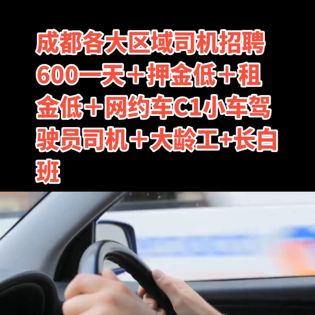 成都各大区域司机招聘600一天+押金低+租金低+网约车C1小车驾驶员司机+大龄工+长白班。 成都各大区域司机招聘600一天+押金低+租金低。网约车C1小车驾驶员司机+大龄工+长白班+合作模式+21-65岁,男女不限平台直招,出勤满11个小时平台保底410。 面试时间:下午13:00-下午18.00,入职只需交500违章押金提车!满6个月退还!除500违章押金入职无任何费用!正规公司放心入职!签1个月签3个月不退,车子自己保管自己清洁出大成都报备一下就行!电车租金83天2500月全成都最低,先用后流水里扣300续航,纯电车型有。 新特东风北汽续航能达到300-500Km,12000/月+600/天+工资周结+成都网约车驾驶员司机兼职全职+可以只做一个月+不买车+不分期+无保证金+可预支工资。车子保险保养车子问题跟员工无任何关系,除员工违章以外,充电费用可公司预支。 工作内容:负责接送乘客到达指定地点。要求:21-65岁接受彝族藏族回族56个民族,不查纹身不查花臂不查案底不查征信,接受所有疑难杂症身体无大问题。3年内无一个违章被一次性扣12分。驾龄刚满1年及以上,C1C2驾驶证及以上B照A照或者电子驾驶证。帮办网约车从业资格证一人一车。薪资:日薪400-600/天月薪10000-15000/月。司机工资算法每天自己跑的流水自己可见,减去电车租金83/天剩下全是自己所得。 发薪日:司机平台奖励每周自己提现。司机工资每个月15号发工资,可以预支工资可提供住宿信息。休假:月休四天自己安排不限制那天休息。 工作时间:时间自由,没有规定你一天必须跑多长时间多劳多得。工作地址:全成都各大区域就近安排,正常退车不收任何费用。