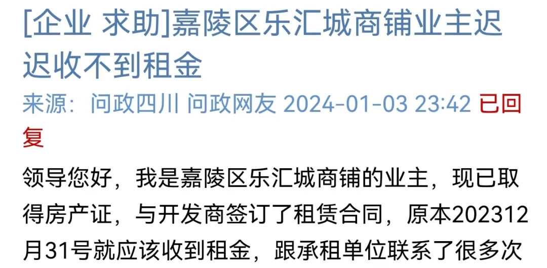 1月3日,网友在问政四川留言求助,嘉陵区乐汇城商铺业主迟迟收不到租金。