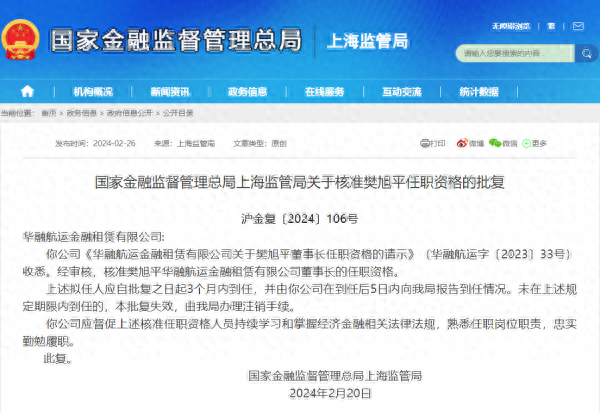 中国网财经2月29日前,国家金融监管总局官网公布相关批复信息显示,《华融航运金融租赁有限公司关于樊旭平董事长任职资格的请示》获国家金融监管总局上海监管局批复,核准樊旭平华融航运金融租赁有限公司(简称:华融航运金租)董事长的任职资格。 同时,《华融航运金融租赁有限公司关于曹炅总经理任职资格的请示》也获国家金融监管总局上海监管局批复,曹炅的华融航运金租总经理任职资格被核准。上述批复时间均为2024年2月20日。 资料显示,华融航运金租成立于2015年,总部位于上海市,是一家以从事货币金融服务为主的企业,公司注册资本为12亿元。 以下是相关批复正文: (责任编辑:朱赫)
