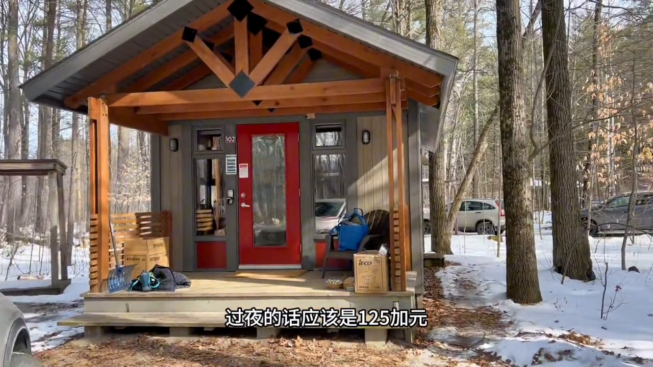 这里是加拿大魁北克省蒙特利尔市西北边的欧卡(Oka)森林公园的野营营地。冬天一家几口人可以周末在这边租一个小房子叫凯宾(cabin)。这里边有两张沙发床,挤一挤每张沙发床可以睡3人,所以总共可以睡6人。这个小房子里头有电暖、冰箱、炉头、一些家用设备,可以做饭、睡觉,洗手间都有。这样的房子住一晚上过夜应该是125加元。走进去看到这是这种可以折叠的沙发床,左右各一张(口误,说成各2张),上面有些小柜可以放些衣物。这是洗手间,冰箱、炉头、水池子、小桌子就这些。