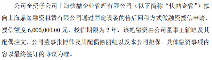 挖贝网11月15日,快易名商(831423)近日发布公告,公司全资子公司上海快喆企业管理有限公司(以下简称“快喆企管”)拟向上海鼎策融资租赁有限公司通过固定设备的售后回租方式做融资授信申请,授信额度6,000,000.00元,授信期限为2年,该笔融资由公司董事王辅晗及其配偶应文、公司董事张博伟及其配偶徐丽虹以及本公司担保。具体融资事项内容以最终签订的协议为准。 被担保人资信状况: 信用情况:不是失信被执行人 2022年12月31日资产总额:138,263,041.84元 2022年12月31日流动负债总额:42,071,494.13元 2022年12月31日净资产:3,412,292.01元 2022年12月31日资产负债率:97.53% 2022年12月31日资产负债率:97.53% 2022年12月31日营业收入:22,277,817.76元 2022年12月31日利润总额:-3,730,529.21元 2022年12月31日净利润:-3,013,581.35元 审计情况:经审计 上述担保行为有利于帮助子公司补充流动资金、改善资产结构,保障其日常性经营,促进其持续稳定发展。 挖贝网资料显示,快易名商是国内最早以城市更新为载体提供现代化智能办公楼宇完整解决方案的服务供应商。公司通过对老、旧存量物业或者低效全新物业的重新定位与改造,致力于打造具有独立生态的智能化灵活办公空间。