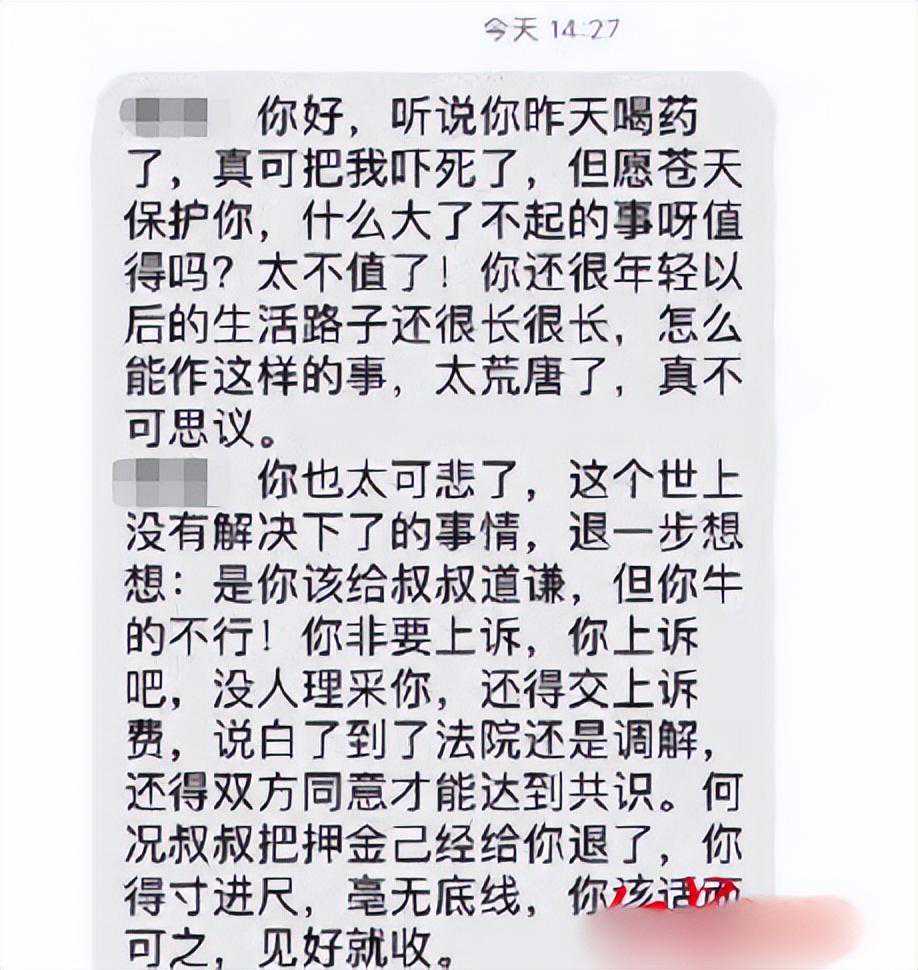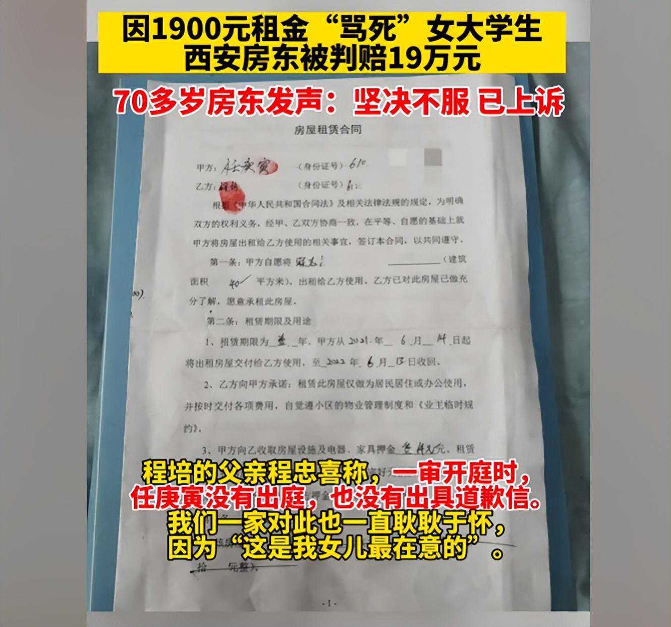 恶语伤人六月寒。 20岁的程培,用自己鲜活的生命,再次证明了这句亘古真理。 5月8日,已经过去一年多时间的房东“骂”死女大学生的案件,终于有了最新消息。 西安法院一审做出判决,房东任庚寅有过错,需要赔付程培父母,共计19万元。 其中包含了,程培生前的医疗费用,死后的丧葬费和死亡赔偿金,以及抚慰金。 19万和1900元之间,不过才100倍的差距。 中间却横亘了一条鲜活的生命。 实在是可叹,可悲! 然而,房东任庚寅并不在意这条逝去的生命,而是对19万耿耿于怀。 就在前两天,他已经提出上诉了。 对于法院的判决,任庚寅并不服气。 在他看来,程培的死和自己并没有关系,也不是因为他开口辱骂了她。 她的死,是因为她自己本身就有病——双相障碍,一种兼有躁狂症和抑郁症的精神障碍。 任庚寅还表示,两人之所以会发生骂战,责任也在于程培。 如果不是她先骂自己是老赖皮,他也不会气到出言反击。 虽然两人之间的骂战,导致了程培的死亡。 但是,这不是用道德绑架法律的理由。 因此,他对这个判决坚决不服。 而这,也是程培死前最在意的事情,更是程家人至今耿耿于怀的事情。 尽管任庚寅解释自己没出庭,是因为他生病住院了,但他也还言之凿凿地表示: “我之前没有给她道歉,今后也不会给她道歉。” 难道,只要不道歉,任庚寅就认为自己真的没有错吗? 他和程培之间的沟通记录,早就将他丑恶的嘴脸,展示在了公众面前。 时间回溯到2021年6月。 彼时,程培还是大三学生,在西安租下了任庚寅的房子。 当时,她和房东任庚寅商量好,租期为时一年,每月租金1900元。 一年22800元的所有租金,她将分两次付清,时间为当年的6月和11月。 当时签订的租房合同里,还写明了退还押金的前提条件,以及提前退租的各种事宜。 如果顺利转租,房东也会退还押金。 在缴纳3000元押金后,程培便顺利入住了。 没想到,这次租房的经历,会成为她此生最大的噩梦。 甚至,连命都搭了进去。 由于个人原因,2021年10月,程培便打算退租。 为了便于退房,她的父亲还陪着她,到出租房打扫卫生。 当时任庚寅也明确表示,扣除完水电费后,就可以退钱了。 然而,真到退钱的时候,事情却突生波折。 在程培看来,房东任庚寅应该退还自己押金和一个月的房租,扣除水电费后,就是4400元。 可任庚寅却认为,房屋的墙纸被狗抓掉了,需要赔偿。 程培的租金是1900元,新租客的租金是1800元。 这100元的差价,需要补偿。 此外,900元的中介费用,也理应由程培承担。 3000元押金除除减减,任庚寅只愿意退还1300元。 至于一个月租金,就是程培在白日做梦了。 因为没能达成一致,双方发生了争执。过程中,程培主动把退还金额降到2500元,但任庚寅仍然不同意。 无奈之下,双方曾两度闹到了派出所,程培也选择了上诉。 即便如此,事情还是没有得到妥善的解决,任庚寅最后也只退了1300元。 但最让程培耿耿于怀的,还是她骂了他是“老赖皮”,竟然被他追着辱骂了一个月。 因为程培租房的时候,是当时的男朋友一起去的。后来,两人由于闹了别扭,选择了分手。 年轻人正常的谈恋爱,到了任庚寅的嘴里,成为了“被人玩弄的羞耻”。 程培一再要求退钱时,他更是直接辱骂她是“B子”。 当时,程培已经被确诊患上了双相障碍。 而她在和任庚寅沟通时,也一再提醒对方,自己的情绪很不稳定,不要再刺激她了。 然而,任庚寅毫不在意,继续阴阳怪气,甚至火上浇油: “只要你死了,我就给你道歉。” 那些辱骂,这些话语,无疑成为了压倒程培的最后一根稻草。 她对闺蜜说,自己真的走不出来。 在闺蜜发送遗言之后,程培便服毒自杀了。 更令人发指的是,当程培还在进行抢救的时候,任庚寅又给她发送了短信。 他,还在继续火上浇油。 他说,应该是由她给自己道歉的,但她非要上诉,结果没人理睬。 他还说,是她得寸进尺,毫无底线;她应该适可而止,见好就收。 从退租开始,到程培自杀之后。 甚至到现在,一审判决结果出来之后。 任庚寅的所有表现,唯有“地狱空荡荡,恶魔在人间”来形容。 协商不通,有矛盾,本可以通过法律来解决。 但是,程培报警,上诉,任庚寅均不理会,甚至还出言侮辱和挖苦。 不是坚持无罪,自己就真的无罪。 法律早已出给了定论,他确实有过错。 也不是道德绑架了法律。 假使道德也能判处刑期,或许他早就被判“无期徒刑”了。 文/-17 未经授权请勿进行任何形式的转载