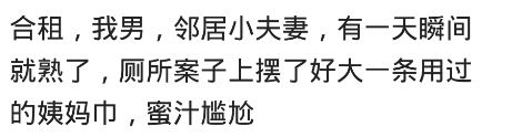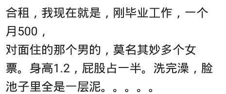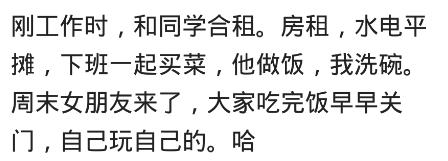 和不认识的人合租是什么感受?每个人都有自己的生活习惯和生活方式,有很多人都不喜欢自己住,觉得一个人住太孤单了。然而,有的人并不是这样想的。有的人认为一个人住无忧无虑,每天想干嘛就干嘛,那么,就来听听他们是怎么说的。网友:我曾经跟一个女生合租过,这个女生特别勤快,每天不仅把自己的房间收拾干净,而且每天还主动把我房间都收拾干净,每次的卫生什么都不需要我做,后来因为家里有事,她就走了,真的好怀念她。看网友的分享欢迎留言分享