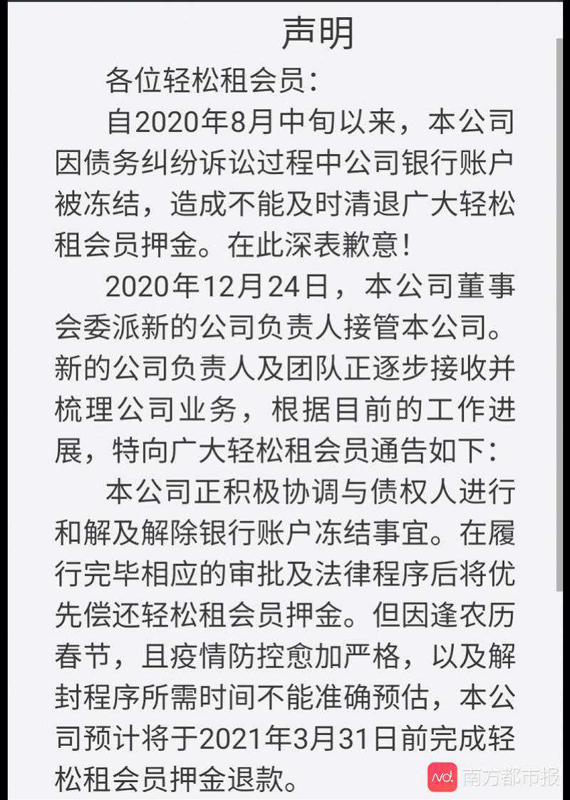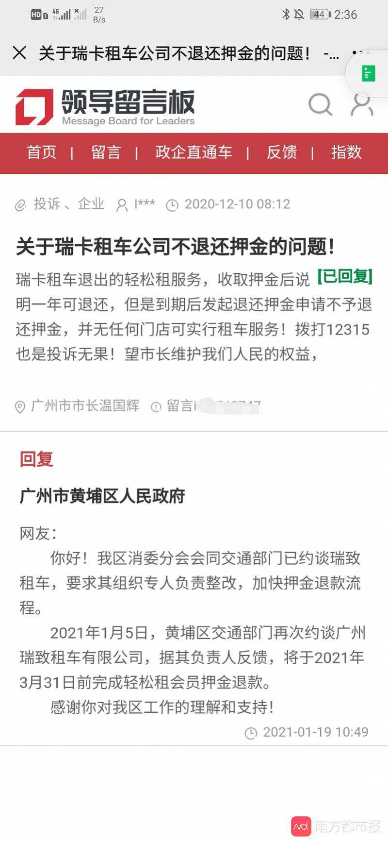 谭先生告诉记者,去年11月20日,因为用车需要他在瑞卡租车APP上租了一辆粤A牌的纯电动汽车。他在瑞卡租车APP进行操作付款后再到线下的一家门店自取,除了3300元的租金外,谭先生还在门店交付了一笔3000元的押金。“当时跟客服也是约好,还车后21个工作日内可以退还押金。” 然而一个月后,谭先生来到门店退车时却发现,原本悬挂着“瑞卡租车”门牌的线下门店已和瑞卡租车公司取消合作,并重新悬挂起其他家租车门牌。工作人员称,因门店已经更换,之前交付的押金也应由瑞卡租车公司退还。1月9日,谭先生在瑞卡租车APP上提交相关资料申请退还押金,但系统一直处于退款审核的状态。谭先生也尝试联系客服给予的售后工作人员,但是一直无法接通。 记者了解到,瑞卡租车归瑞致(广州)租车有限公司(以下简称致瑞公司)所有,成立于2009年。 1月26上午,记者联系到谭先生的租车门店,一工作人员告诉记者,此前该店确实加盟瑞卡租车,但去年12月份左右,已经更换加盟另一门店。至于有租车用户反映需退还押金,因为客户到店提车时,押金都是由瑞卡租车公司的账户收取,现在自然要由租车公司返还。问及是何原因更换加盟门店,该工作人员表示并不清楚,“老板说要换就换咯!” 谭先生告诉记者,瑞致公司有两种租车方式,一种是会员租,主要是充值轻松租会员卡,承诺押金会在一年或者半年退回。谭先生的情况则属于个人短租。记者发现,网上还有很多像谭先生这样的情况,其中会员租押金不退回现象更为频繁。 一家知名消费者服务平台上,记者检索到多条“瑞卡租车押金未退款”投诉。投诉量400多条,涉诉金额2000-10000不等。一位涉诉金额5000元的网友于去年12月22日称:他于2018年11月在瑞卡成为轻松租会员,于2020年11月申请轻松租押金退款,APP上承诺21天内退还,如今接近1个月过去,仍未收到退款。目前APP上面无法租车,联系客服电话也只有机器人回应。 人民网领导留言板截图。 后续,记者致电瑞卡租车客服。客服人员表示,对于不是轻松租的会员,可以提交相关资料到瑞卡租车APP申请退还押金,或者通过400热线、微信小程序在线客服、退款公邮等途径,只要核实租户押金是交到瑞卡租车公司,后续就会将押金退还至租户。该公司有关负责人也向记者表示,因为还没核实到具体情况,但根据上述退款途径只要确认租户押金是交到瑞卡租车公司,后续就会将押金退还至租户。目前公司所有对外公布途径都在官方APP里会有声明,其他的也不方便过多透露。 记者在瑞卡租车APP上看到,去年12月30日该公司就曾发出声明,公司因债务纠纷诉讼过程中公司银行账户被冻结,造成不能及时清退广大轻松租会员押金。现公司正协调与债权人进行和解及解除银行账户冻结事宜,预计将于2021年3月31日前完成轻松租会员押金退款。并于今年1月14日,瑞卡租车发布了最新的退款操作指引。 去年底该公司曾发出声明,公司因债务纠纷诉讼过程中银行账户被冻结。 1月29日,谭先生告诉记者,他已将退款信息发送至公邮。邮件回复称,谭先生提交的退款信息,系统已经有记录,经过后续的订单欠费情况核实,如无需扣款(订单未结清及违章未处理),资金解冻后,会安排退款。 随后,记者也将谭先生目前的情况向客服反映,客服称,客户邮件由其他同事安排处理,如系统已收到邮件,到时会安排退款。 采写:南都记者张思琦实习生徐婕麦紫薇