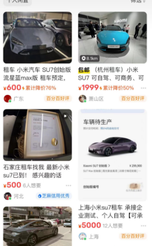 潮新闻客户端记者王静 上市才没几天,杭州街头已能看见小米SU7的身影。4月3日,雷军在首批车主交车仪式上披露,小米SU7开售至今,已有超过10万人大定,锁单量已经超过4万单。 小米汽车销量火爆,奇货可居,也带动了租赁市场。在租车平台和二手转让平台上,潮新闻记者发现了不少租车信息,显然,第一批拿到车的用户已经开始赚钱了。 第一批小米车主已经开始赚钱了 在闲鱼上,来自广州、杭州、上海、河北等地的小米SU7租车信息都能找到,价格从500元-5000元不等。 潮新闻记者找到一名杭州的租车用户,标价1999元一天起租,天数越多优惠越多。一名上海的租方则喊价5000元一天,押金1万元。饶是如此,档期也非常紧张,未来一周可预约的时间仅有13号一天。 在杭州开汽车租赁公司的虎哥在小米汽车发布时,集合全公司之力预订了15台,最后在首批交付时,拿到了2台车,一辆是低配的灰色版本,一辆是蓝色的MAX版本。虎哥说,自提车后,这两辆车的预约需求不断,“车子几乎就没有在自己手上停留过。”低配版的档期已经排到了20号,高配版的最快17号能排上。 据闲鱼截图 谁在高价租小米汽车? 潮新闻记者了解到,这些租小米汽车的人用途五花八门,有的是自驾出行,有的是主机厂测试、配件厂测数据,也有的为了广告拍摄、商场展示,还有的是为了做婚庆接亲。 “我这里有的客户是专程从义乌、温州等地专程赶过来的。”按照租赁用途的人不同,虎哥将租车价格分成三类,一类是直客出租,租金在1800元-2500元/天,另一种是同行的来租,价格稍微低一点,还有一种是测评的自媒体,低配版价格2000/天,高配版3000元/天。 能租到平均2000元一天,这在平时是只有保时捷Taycan、保时捷911这类跑车才有的待遇。“小米汽车真是自带光环。”虎哥感慨。 不过,虎哥表示,下个月的价格可能就会下降了。“现在杭州的租车市场,车还比较少,除了用户个人,只有为数不多的几辆车在同行间周转,所以价格比较坚挺。随着热度减退,交车数量的攀升,租赁价格就会慢慢回归正常了。” “转载请注明出处”