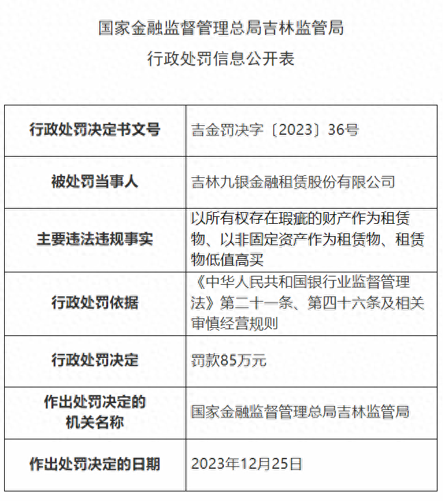 【大河财立方消息】12月26日消息,国家金融监督管理总局吉林监管局行政处罚信息公开表显示,吉林九银金融租赁股份有限公司因以所有权存在瑕疵的财产作为租赁物、以非固定资产作为租赁物、租赁物低值高买,被罚85万元。
