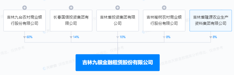 天眼查显示,吉林九台农村商业联合银行为吉林九银金融租赁股份有限公司第一大股东,持股60%。