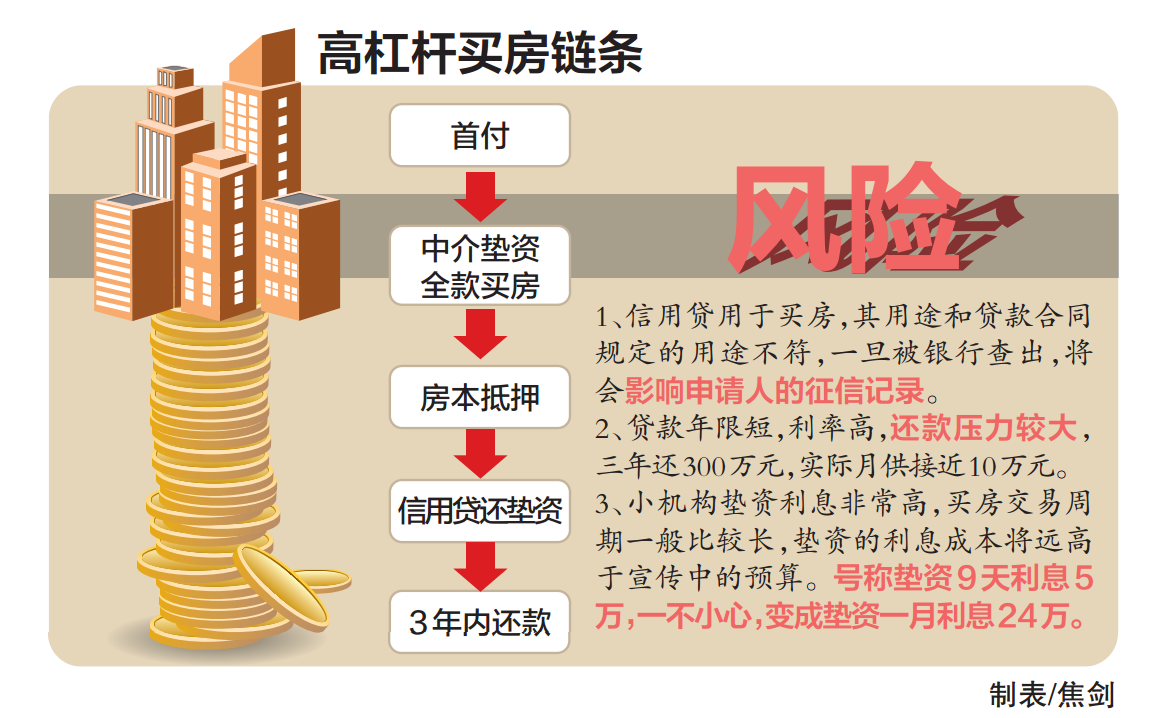手握300万元现金,就可以买600万元的房子,只需还点儿小利息,“以小博大”成本低且毫无风险——这是中介机构给购房人王伟(化名)描绘的情景。随着北京楼市逐步回温,一些不具备资质的机构近期在市场上四处活动,先打着低息贷款的幌子让购房人“入套”,再以先垫资、后申请信用贷的方式让其“上车”。专家表示,信用贷的资金进入房地产属于违规。以高杠杆的方式买房,购房人不仅要承受巨大的还款压力,还可能影响个人征信。 “解决购房各环节需求资金,放款迅速。”近期忙着看房的王伟,正是被这样一则广告吸引上“套”的。王伟看中了一套位于四环外、总价600万元的二手房,可他手头的现金只有300万元,再加上自己的情况只能按二套贷款,王伟面临高首付、高利率、钱不够的窘境。 “有没有什么首付少、利息少的购房方式?”第一次和机构工作人员沟通,王伟就提出“少花钱”的要求,而对方很快就给出小微企业低息贷款的方案。按其所说,目前各银行对小微企业贷款都有扶持政策,王伟只需注册一家小微企业,就能申请低息贷款,每月还款额比房子出租所得的租金还要低,“至于您没有公司也没关系,我们这儿提供一条龙服务,都可以办理,您可以先考虑一下。” 利息比租金还低,这句话深深打动了王伟。很快,他就决定见面详谈。也是在这次谈话中,工作人员改了口径,提出使用信用贷的新方案,理由是申请信用贷更容易,放款速度更快,利率依然比商业贷款的利率低。 按照中介机构的说法,王伟的买房流程有四步。首先,他拿出300万元的现金,机构再垫资300万元,全款买下他心仪的那套房子。按照目前的交易速度9天内能办完手续,按8%的月利率,王伟要缴纳约5万元的垫资利息。接着,王伟拿着房本去几家银行申请信用贷,贷出300万元用于归还机构垫资,并支付办理费用5万元。第三步,王伟将名下的这套二手房出租“以租养贷”。贷款3年后,王伟向银行归还300万元的本金,或者再用房本申请贷款套现。 手头现金做首付—中介垫资全款买房—以房本抵押申请信用贷—归还垫资并按月还利息—再拿房本抵押……在机构人员的口中,这是一条可以重复的“完美链条”,而王伟通过此就可“以小博大”,以极低的成本得到一套房。 用300万元买下600万元的房子,支付的利息成本64万元,听起来比商业贷款确实要低。然而,中介机构口中的链条真的完美么?业内人士否定了这种以高杠杆购房的方式。 “首付贷、消费贷、信用贷、经营贷款等信贷资金流入房地产市场,这本身就属于明令禁止的违规行为,银保监会也多次强调,坚决纠正贷款违规流入房地产行为。”中原地产首席分析师张大伟表示,以信用贷的资金买房,其用途和贷款合同规定的用途是不符的,一旦被银行查到将会影响申请人的征信记录。与此同时,相比于商业贷款,信用贷属于短期贷款,贷款额度通常在30万元至50万元,且年限一般只有3年。“若想以信用贷的方式贷出300万元,就像某些机构所说,要从多家机构同时申请信用贷,在监管趋于严格的环境下,风险极高,可操作性不强,后期还款压力也非常大。”张大伟说。 这条“完美链条”其实还暗藏其他风险。记者仔细算了一笔账后发现,按照8%的月利率,300万元的垫资款单日利息是8000元,一周是5.6万元,一个月就是24万元。一品牌中介经纪人告诉记者,在业主所卖房屋没有银行抵押的情况下,全款购房人从购房资质审核到完成过户大约需要一周时间。如果业主所卖房屋存在银行抵押的情况,得先完成解抵押,才能再走购房资质审核等流程,慢的话可能需要1个月。换句话说,机构人员给出的5万元垫资利息的预算,只是最理想状态下的最低支出。一旦房屋交易过程中遇到任何意外情况,拉长了交易周期,所支付的利息将远高于5万元。 “高杠杆的模式并不适用于普通购房人,特别是在目前楼市处于平稳期的时候,有自住或改善需求的购房人更没有必要使用这种高杠杆的模式,建议理性购房。”张大伟说。