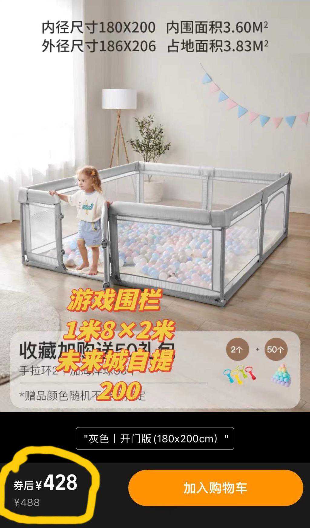 出一个二手婴儿围栏1.8×2,用了半年,9成新,未来城200自提,原价400多(某宝、某东)
