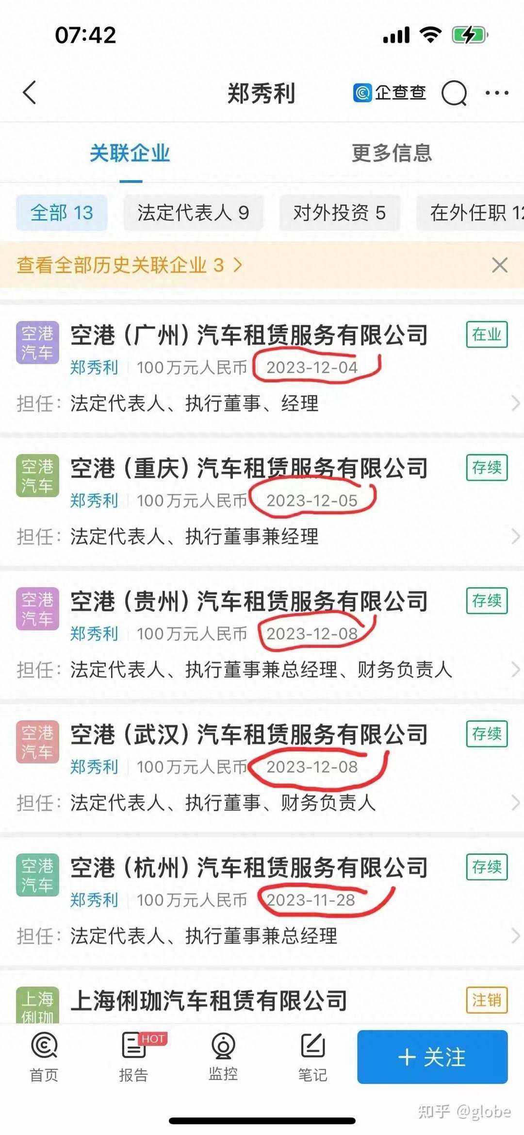 封面新闻记者李茂佳罗惟巍 连日来引发巨大争议的上海浦东机场区域内禁止网约车运营服务事件,2月4日凌晨迎来重大转折——上海市交通委发布消息称,“从2月4日起恢复浦东机场区域内网约车运营服务。市民乘客可通过各网约车平台在浦东机场区域内预约用车。” 禁令虽然已被叫停,但禁令发出后,唯独由一个名叫“郑秀利”的自然人控制的“空港出行”平台,却能下单叫车。 2月3日,封面新闻通过调查发现,由“郑秀利”控制的“空港出行”所属公司——航空港(上海)汽车服务有限公司于今年1月相继在北京、成都设立分公司,全面覆盖了国内拥有双国际机场的三大城市。 “郑秀利”设立5家汽车租赁公司。 2月4日,封面新闻记者进一步发现,“郑秀利”除进军京沪蓉外,还通过设立汽车租赁公司的方式,把企业版图“扩张”到重庆、广州、武汉、杭州、贵阳五个城市。神奇的是,这5家公司的设立时间,前后相差不超过11天。 天眼查App显示,空港(重庆)汽车租赁服务有限公司、空港(广州)汽车租赁服务有限公司、空港(贵州)汽车租赁服务有限公司、空港(杭州)汽车租赁服务有限公司、空港(武汉)汽车租赁服务有限公司等5家公司的法人代表均为郑秀利。 穿透股权结构可以发现,这5家汽车租赁公司都由空港(上海)科技有限公司100%控股,而该公司与航空港(上海)汽车服务有限公司为并列关系,又是“郑秀利”控制的上海空港旅游有限公司的下属公司。 上海空港旅游服务有限公司的股权穿透图。据天眼查App 再梳理5家汽车租赁公司的信息,更让人惊讶的是,这些企业的注册资本均为100万元,成立日期又整齐划一地出现在2023年11月28日至2023年12月8日之间,甚至空港(武汉)与空港(贵州)两家公司都在2023年12月8日登记注册。通过公开信息,记者只能查到5家公司的注册地址,无法找到联络方式。 空港(重庆)汽车租赁服务有限公司成立于2023年12月5日。 其中,空港(重庆)汽车租赁公司的注册地址为重庆市沙坪坝区土主街道西永组团I标准分区重庆铁路口岸公共物流仓储项目9号楼512室-387。 记者联系上重庆铁路口岸内的一位工作人员,她表示,自己并没有在实际工作中与这家企业打过任何交道,“不清楚这家企业,可能是申报的注册地址在我们这里,实际办公地不在这里。” 另据天眼查App显示,上海空港旅游服务有限公司在2018年被上海市长宁区人民法院发出了限制消费令,且该公司涉及多起司法案件。 上海空港旅游服务有限公司在2018年被上海市长宁区人民法院发出了限制消费令。 随后,记者又分别拨打上海空港旅游服务有限公司和上海鑫交港实业有限公司的公开电话。上海空港旅游服务有限公司的电话始终无人接听,而上海鑫交港实业有限公司公开的三个号码中,有两个是空号,而另一个号码接通后,对方则表示自己不是该公司的员工,随后便挂断电话。 【如果您有新闻线索,欢迎向我们报料,一经采纳有费用酬谢。报料,报料QQ:3386405712】