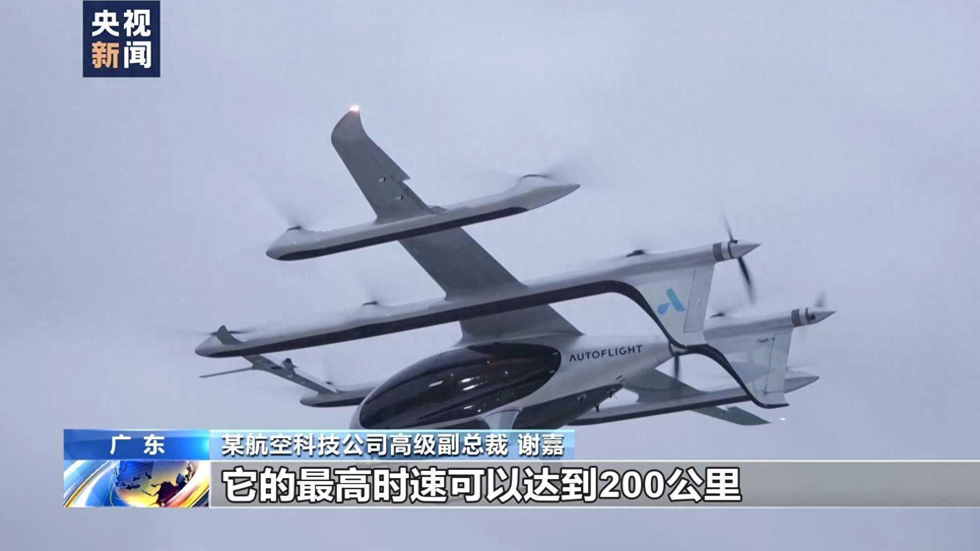 某航空科技公司高级副总裁谢嘉:它最高时速可以达到200公里,单次充电飞行距离达到250.3公里,它还有一款载物的型号,最大载重400公斤。