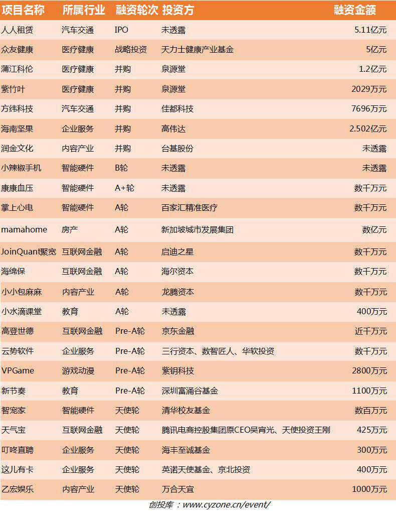 医疗健康 1、医药电商开放平台“紫竹叶”被泉源堂以2029万元并购。 2、医药零售连锁企业“众友健康”宣布完成5亿元战略投资,投资方为天士力健康产业基金。 3、医药批发企业“蒲江科伦”获泉源堂1.2亿元并购投资。 汽车交通 1、二手车融资租赁公司“人人租赁”宣布完成5.11亿元IPO上市融资,投资方未透露。 2、智能交通服务商“方纬科技”获佳都科技7696万元并购投资。 硬件 1、手机研发设计销售服务商“小辣椒手机”完成B轮融资,具体细节未公开。 2、医疗健康软硬件公司“掌上心电”宣布已经完成数千万元A轮融资,投资方为百家汇精准医疗控股集团有限公司。 3、高血压监测和指导工具“康康血压”完成数千万元A+轮融资,投资方为某上市药企公司。 4、宠物一体化平台“智宠家”完成数百万天使轮融资,投资方为清华校友基金。 房产 1、公寓服务平台“mamahome”宣布完成亿元级A轮融资,投资方为新加坡城市发展集团。 互联网金融 1、量化投资交易服务平台“JoinQuant聚宽”完成数千万元A轮融资,投资方由启迪之星领投。 2、场景保险定制平台“海绵保”宣布完成数千万元A轮融资,投资方为海尔资本。 3、“高登世德金融科技”宣布已完成京东金融近千万元Pre-A轮投资。高登世德联合创始人陈晨表示,本轮投资完成后,高登世德估值近亿元。 4、天气风险管理平台“天气宝”宣布已于去年6月份完成425万元天使轮融资,投资方为腾讯电商控股集团原CEO吴宵光、天使投资人王刚。 企业服务 1、大数据营销解决方案提供商“海南坚果”获高伟达并购投资,投资金额2.502亿元。 2、定位电商领域的垂直招聘服务平台“叮咚直聘”已完成300万天使轮融资,由海丰至诚基金及来自阿里、网易的两位高管共同投资。 3、销售管理自动化SaaS服务商“云势”透露已在5月份获得由三行资本与数智匠人领投,华软投资跟投的数千万Pre-A轮融资。 4、储值卡会员策略SaaS平台“这儿有卡”透露已于7月份完成400万元天使轮融资,投资方为英诺天使基金、京北投资。 游戏动漫 1、综合性电竞服务提供商“VPGame”宣布完成2800万元Pre-A轮融资,投资方为紫钥科技。 内容产业 1、综合影视制作公司“润金文化”获台基股份并购投资,具体金额未透露。 2、婴幼儿养育知识分享公众号“小小包麻麻”透露已于4月份完成数千万元A轮融资,投资方为龙腾资本。 3、游戏+综艺的混搭直播平台“乙宏娱乐”获得万合天宜1000万元天使轮融资。 教育 1、“小水滴课堂”公司已于去年年年底完成A轮融资,融资金额为3000万人民币。 2、体感教育公司“新节奏”获得1100万元Pre-A轮投资,投资方为深圳富涌谷基金,估值3.5亿人民币。