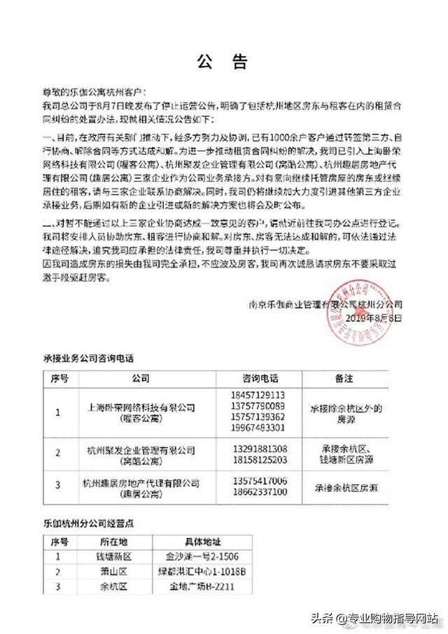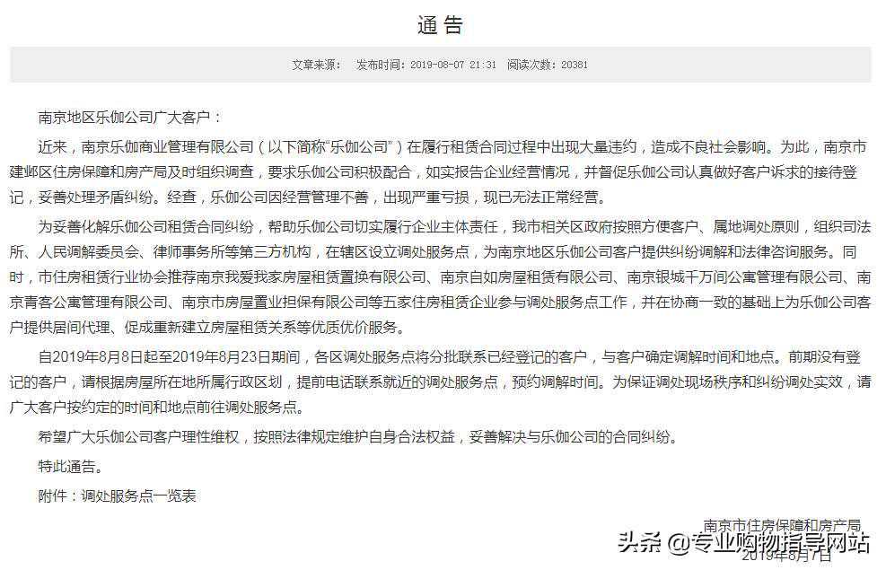 8月7日,乐伽公寓停止营业: 事实上,对于乐迦跑路的传闻由来已久,早在一个月前,乐迦公寓还在辟谣跑路传闻,然而仅在一个月后,就宣布破产,虽然有些突然却不意外,在这场破产风波中,最受伤的莫过于租客和房东了。 近两年,长租公寓发展迅猛,但繁荣过后危机必至。有数据显示,近两年已有超过二十家长租公寓破产,资金链断裂是长租公寓摆脱不了的噩梦。 租客与房东 很多租客称自己在乐迦公寓刚刚签完合同,租用不到一个月,剩余的租金就全打了水漂,又面临房东催租,如果不续租,就只能搬出去。 感到艰难的除了租客,还有房东,很多房东表示自己有房贷压力,没有这笔租金,家具又遭到破坏,自己的损失也很大。 几天前,赵先生收到自住室房东的消息,称没有从乐伽方收到本季度的房租,下周要强制收房。另一头,办公室的房东也向他催收房租。赵先生向《》记者出示的聊天记录显示,房东明确拒绝了双方各担一半损失的协调请求,称8月20日不与其重新签订租房合同就将收房。 一地鸡毛如何收 在乐伽破产后,当地部门发布《关于租赁房屋时的风险提示》,提醒消费者警惕"高收低租"式租房,选择正规租赁公司。 当前,南京市住房保障和房产局已经在积极协调此事,调节方向多为租客与房东平摊损失,很多租客表示,虽然过程非常艰辛,但也会积极争取。也有租期在一年以上的房东和租客表示这种调节方式并不能接受。 当前,南京有关部门表示坚持以"方便客户、属地调处"原则,联系其他长租公寓参与协调,尽量促成新的租赁关系,防止破产问题扩大化。 同时,南京乐伽分公司也宣布称,已与其他品牌公寓达成协议,有委托意愿的可以同这些公寓进行联系。但是,这些品牌公寓如喔客公寓,此前也曾出现"高进低出"问题,很多房东对此表示担忧,称不会再与任何长租公寓合作。 高进低出埋隐患 "高进低出",就是公寓方用高价从房东手中获得房源,然后以低于房东价格的租金出租给消费者,以此来占领市场。而乐迦公寓,正是这种经营模式。 虽然乐迦公寓是押一付三或押一付六,但实际上,公寓方只按月付给房东租金,这种做法扩大了杠杆,一旦经营出现问题,资金链断裂,那么将会给房东和租客带来巨大的损失。 虽然"高进低出"有风险,但很多长租公寓仍然铤而走险选择这种方式,就在今年的七月份,品牌公寓安闲居也于宣告破产,该公寓不仅采用"高进低出"方式,还采用了租金贷等方式,资金链断裂只是早晚的问题。