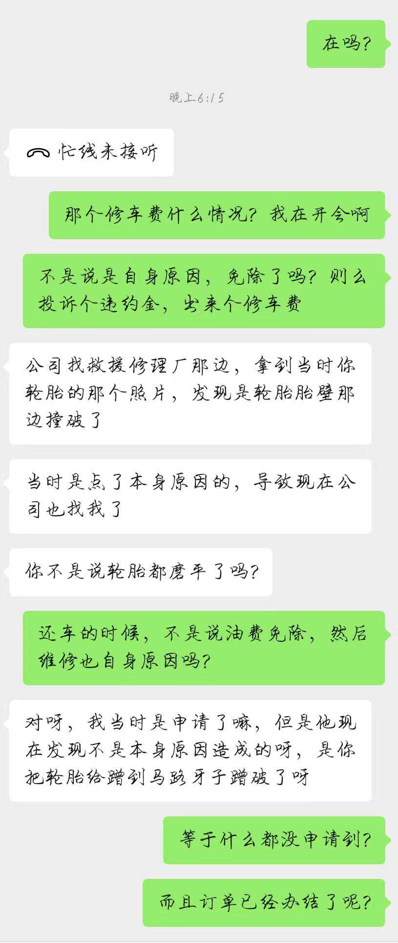 “您的订单因押金扣款,已成功代扣款169元。”还车6天后,一条扣费短信突然出现在乐先生的手机上,第一时间询问客服后,乐先生得知,这是扣除了用车过程中产生的油费。然而,才刚安下心来不久,扣费短信又接二连三地到来:“租车订单因违章,已成功代扣款1200元”“因押金扣款,已成功代扣款1500元”…… 春光融融,租车自驾成了市民旅游的热门选项。踏青出游本是一件乐事,但在12345市民服务热线,还车后“莫名其妙”的扣费却令不少消费者感到困扰。这些款项如何构成?扣费行为又为何会不经提示直接发生呢? 未经协商连连扣款 今年3月中旬,因计划前往江西婺源旅行,乐先生通过平台向“一嗨租车”租用了一辆“大众探歌”车型,租期为3天,订单总价2353元。由于“芝麻信用”分值较高,乐先生确认授权后,此订单便被减免了租车押金及违章押金。3月13日下午,乐先生至江西婺源高铁站内取车,但由此开始,麻烦便不断出现。 “开出厂时,车辆显示屏上跳出‘保养护理到期’的提示。开到第二天时,发现右后轮漏气。”乐先生回忆道,车辆产生问题后,他第一时间向一嗨租车线下站点客服求助,“工作人员表示,保养护理不影响车辆正常使用,并提供了指定地点让我过去给车胎充气。往返维修的路上,大概耽误了3个多小时。”由于行程安排紧张,经维修站工作人员检修后,车轮不会影响驾驶安全性,乐先生便决定暂不更换所租车辆。此后第三天在山路上行驶时,车辆的左前轮发生爆胎,因备用胎也无法使用,他又花了3个小时等待救援。 由于这一系列经历,3月17日至站点还车时,工作人员便与乐先生协商,可以帮助申请免除油费及车损费。但事实证明,这一番与工作人员之间的口头沟通并未作数:从3月22日起,一嗨租车3次向乐先生的账户扣款,后经客服工作人员解释后才知,其中169元为油费、1200元为违章违约金、1500元为爆胎带来的车损费。 △乐先生与线下客服沟通时,对方表示减免费用的申请未通过。 4月中旬,市民林女士也通过一嗨租车App租用车辆,使用期间发生事故并与路政设施产生碰撞,报案后需消费者承担车损费及物损费。“一开始至门店协商时,工作人员告知我大概要付1500元,后来又更正说金额约为3000元。”4月17日,林女士突然收到一笔4500元的扣款,询问了支付宝后才得知,扣款方正是一嗨租车。 “预授权”使扣费无需沟通 随着租车自驾出游迎来高峰,租车后产生违章或车损的情况并不少见,在各大社交及投诉平台上,扣款争议更是频频发生。网友马先生(化名)通过“黑猫投诉”平台反映,一嗨租车自4月3日起不断通过支付宝向其账户扣款,除第一笔为170元,其余每笔均为10元,名目均为“违章扣款”,从账单详情来看,累计扣费超过10次。究竟为何扣款?马先生并未从任何渠道获得解释。 “作为消费者来说,也并非不承认造成物损和车损,但是未经协商和提示就直接扣费,是否合理呢?”林女士告诉记者,自扣款至今,一嗨租车都未能出具维修明细。此外,尽管她租车时购买的基础保险能够用以覆盖路政设施损坏的赔偿,但租车公司依然要求她先行垫付4000元左右的物损费。而对于乐先生来说,此前已经完成了交通违法的处理却依然遭到扣款,一些费用也在没有清单的情况下被径直扣除,这都令他难以接受。