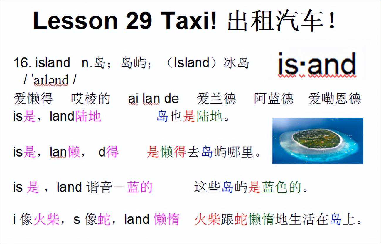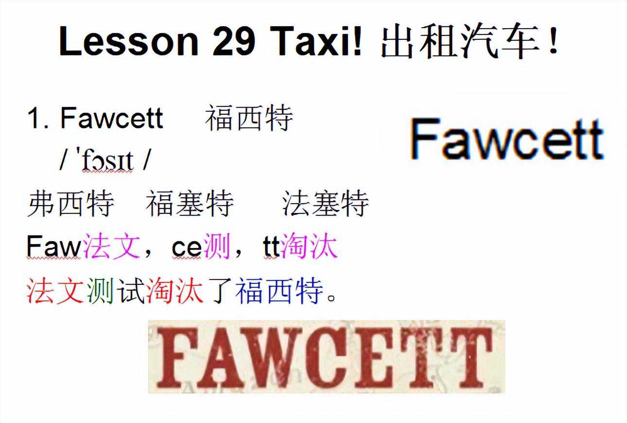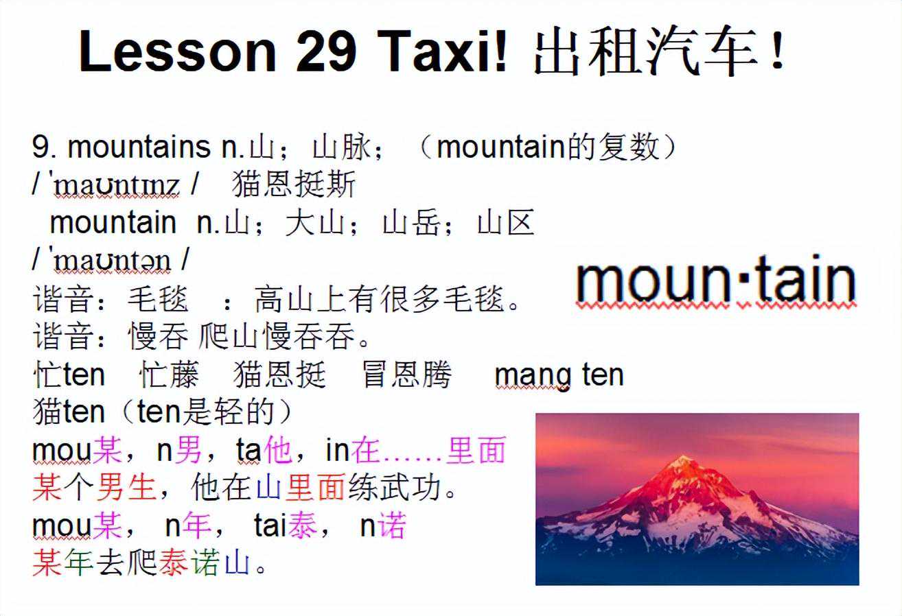 1.taxi(title)n.出租汽车 /tQksi/ 泰克西胎克西 谐音:太可惜他开出租汽车太可惜! ta他xi洗 他在洗出租汽车。 ta他,xi西 他从西边开出租汽车来。 2.PilatusPorter(11.2-3)皮勒特斯·波特(飞机机名) /pIlEtEspO:tE/ 区雷待斯坡特儿 Pi匹,la拉,tus图书 这匹拉图书的马叫皮勒特斯。 Po破,rt软糖,er人 吃破软糖的人是波特。 3.land(1.4)v.着陆 /lQnd/ 烂的蓝的兰德 l棍子,and和 棍子和陆地哪个面积大? land懒惰近似音 这座岛屿上的人都是懒惰的。 4.plough(1.5)v.耕地 /pla/ 普劳普劳尔普拉夫扑捞儿 谐音“普劳”→农民普遍的劳作→耕地 谐音:疲劳犁地很疲劳。 把发音想成“普劳”(普通的劳动工具) p婆,lou搂,gh干活 婆婆搂着孙子干活,她在奋力耕地。 5.lonely(1.6)adj.偏僻的,人迹罕至的 /lEnli/ 丨en利劳恩累龙类龙列莱昂利尔 龙利龙里lang(一声)lei(四声)隆里 发音类似“lo-nee-lee”,重音在第二个音节,即“nee”。 l连,one一个,l老,y友 连一个老朋友都没有,是很孤独的。 6.Welsh(1.7)adj.威尔士的 /welS/ 韦尔什 W网,el恶劣,sh食 对网友不要做恶劣的事,更不要对威尔士的人食言。 当时英格兰与威尔士签订和平条约后去镇压苏格兰,但是打败苏格兰后反手又灭掉了威尔士→食言。 7.roof(1.9)n.楼顶 /ru:f/ 入腐路伏洛夫 oo中发音是“雾乌”,如果觉得发音难,你先慢慢读,那roof四个字母放在一起慢慢发音就是“入雾乌夫”,两个oo发音是u:,u后面两个点意思是把“乌”这个音拉拉长! 第一个音是ru,像中文进入的“入”,后面加一声轻生的f“斧”连起来和入斧差不多,就是入长些,斧很轻很短 “入伏”→入伏了,应该敞开房顶凉快凉快。 r花,oo望远镜,f飞 花带着望远镜飞到了屋顶。 8.block(1.9)n.一座大楼 /blXk/ 波涝克 block-clock 一座大楼上的时钟报错时间了。 9.flat(1.9)n.公寓房 /flQt/ 富来特 谐音:付了它公寓的租金要付了它 fl俘虏,at在 俘虏住在公寓。 f服,la了,t他 我服了他,这种房子也叫公寓? fl肥料,at在……上 肥料在平坦的大地上。 10.desert(1.9)v.废弃 /dIz:t/ 谐音:弟责她弟责她不该放弃去沙漠的机会。 dese得瑟,r人,t伞 得瑟的人在沙漠里撑着伞。 1.Fawcett福西特 /fOsIt/ 弗西特福塞特法塞特 Faw法文,ce测,tt淘汰 法文测试淘汰了福西特。 2.dangerousadj.危险的 /deIndZEREs/ 颠这弱斯单桌死 dange单个,rou肉,s像蛇 单个人拿肉去喂蛇是危险的。 单脚拉屎:啊,你竟然敢单脚拉屎,在下佩服佩服,这么危险的动作你都能搞出来,实在佩服。 dang当,e鹅,rous肉丝 当鹅吃了有毒的肉丝很危险。 dang当,er儿子,ou海鸥,s蛇 当儿子碰到海鸥和蛇很危险。 3.unusualadj.不平常的;少有的 /Vnju:ZuEl/ 俺优肉儿安优揉安优如昂有肉 安油休儿昂由秀昂油若 按优肉,第二词素的元音u读成ju:,因此是“优、忧”而不是“牛”,谐音可记作:俺有肉 un嗯,us我们,u有,al都是 嗯,我们拥有的都是不寻常的。 4.Swissadj.瑞士的;瑞士人的; /swIs/ 死胃死斯维斯 Sw商务,is是,s送 商务礼物是送瑞士的手表。 5.calledvt.呼叫;称呼;召集;(call的过去式和过去分词) /kO:ld/卡欧的酷的kao弟的 callv.呼喊;喊;叫; /kO:l/ 扣抠考尔ko(o是第一声)扣儿口儿靠 ca擦,ll筷子 把擦筷子的行为叫做干家务。 c弯月,all所有弯弯的月亮上面所有的人都在打电话。 c吃,all所有打电话找人来帮忙吃掉所有的东西。 6.carryv.抬;搬运;运送; /kQri/ 开睿凯瑞kan(一声)rui(清声) car车,ry容易 有车就容易运送物品。 car小车,ry人妖 小车被人妖搬走了。 car汽车,r日,y夜 用汽车日夜不停的搬运货物。 7.surprisingvt.使惊奇;意外发现;给……惊喜;措手不及;(surprise的现在分词) /sEpraIzIN/瑟泼诺爱经 surprisen.意想不到的事件; /sEpraIz/ 色破入爱死瑟泼挼爱兹斯扑来斯 瑟普软丝苏破来斯设仆瑞丝思铺奶思 谐音—撒泼摔死 Su熟,rp肉片,ris日晒,e鹅 烤熟的肉片,日晒后被鹅吃了,是一件意想不到的事件。 8.Birmingham伯明翰 /b:mINEm/ ber明(第一声)汉伯明罕 Bir,bird(鸟),ming明,ham(beckham贝克汉姆 鸟叔明天要去伯明翰看贝克汉姆。 9.mountainsn.山;山脉;(mountain的复数) /mantInz/猫恩挺斯 mountainn.山;大山;山岳;山区 /mantEn/ 谐音:毛毯:高山上有很多毛毯。 谐音:慢吞爬山慢吞吞。 忙ten忙藤猫恩挺冒恩腾mangten 猫ten(ten是轻的) mou某,n男,ta他,in在……里面 某个男生,他在山里面练武功。 mou某,n年,tai泰,n诺 某年去爬泰诺山。 10.flownvi.飞;飞行;(fly的过去分词) /flEn/夫low嗯辅唠嗯弗劳恩 flyv.飞;飞行; /flaI/ 福赖福来甫睐 谐音:飞来飞来一只苍蝇。 fly福利院 苍蝇在福利院上空飞来飞去。 fly发令员 发令员给出了飞的命令。 11.placesn.地方;位置;(place的复数) /pleIsIz/婆类塞思 placen.地点;地方; /pleIs/ 婆类思扑累死普雷斯扑泪思 pl漂亮,a一,ce厕所 这么漂亮一个地方做厕所,多可惜! 12.occasionn.时刻;场合; /EkeIZn/ 额kei须en额尅讯 谐音:恶客人任何场合都不欢迎恶客人。 o哦,cc常常,asion爱神的谐音 哦,这种场合常常会有爱神降临的。 o蛋糕,cc2个香蕉,as被看作,ion(名词后缀) 在特殊的场合,吃一个蛋糕和2个香蕉被看作是一种绅士风度。 13.refusedv.拒绝;不愿;(refuse的过去式和过去分词) /rIfju:zd/瑞福又子的瑞夫又子的 refusev.拒绝;拒绝接受; /rIfju:z/ 瑞佛又狮瑞feel丝瑞福柚子 re热,fuse辐射 我们拒绝热辐射。 re热,fu敷,se蛇 我拒绝用热水敷蛇。 14.businessmann.商人 /bIznEsmQn/ 比斯你斯门 business=生意,man=男人,做生意的男人是男企业家。 businessman”的正确发音为['bɪɪæn]或['bɪəæn]。 第一个音节[‘bɪz]:这个音节发