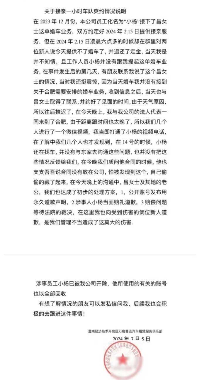 婚礼是人生中最为重要的时刻之一,是两个人共同奔向幸福的开始。然而,在这个特殊的日子里,婚车公司的"放鸽子"却让昌女士一家陷入了前所未有的困境。从与公司的合同签署到最后的婚礼当天,一切都按照计划进行,直到公司以合肥车队原因为由,突然取消了婚车的服务。这一变故不仅让新人感到无奈,也让原本精心筹备的婚礼变得支离破碎。 随着事件的曝光,昌女士选择了法律的途径,希望通过起诉来维护自己的权益。然而,法律之路并不是一帆风顺。双方在赔偿问题上无法达成一致,而婚车公司则在声明中称员工"小杨"私自接单,导致这场婚礼泡汤。公司提出了一系列处理方案,包括公开道歉和等待法院裁决,但昌女士并未接受,坚持通过法律手段追求更多的赔偿。 对于公司的声明,律师罗平提出了质疑。他认为,员工"小杨"是公司正式雇员,且公司未能提供足够证据证明他的私自行为,因此公司无法将责任完全推卸给员工。在法律上,员工签署合同是代表公司,公司不得以员工私自行为为由免责。这一点使得公司在法律责任上难以逃脱。 在法律专家的解读中,婚车租赁协议中的违约金和定金罚则成为了双方争议的焦点。根据合同的约定,新人有权主张双倍定金返还,但这一赔偿显然无法弥补新人在婚礼上所承受的各种损失,包括增加的婚礼费用、交通费用,以及因临时租车产生的新增费用。 对于昌女士来说,这不仅仅是一场婚礼泡汤的经历,更是对她生命中一段重要时刻的侵害。虽然法律可以为她提供一些赔偿,但那无法弥补因婚礼梦碎所带来的心灵创伤。她表示愿意将部分赔偿款捐赠出去,这或许是对自己和他人的一种慷慨。 整个事件的发酵也反映了社会中一些服务行业的信任问题。在消费者心中,一个企业的信誉是至关重要的,而如何在服务中保持诚信,成为了企业需要思考的重要议题。在法律责任和商业信誉的双重压力下,婚车公司可能需要更加谨慎和规范地经营,以重塑公众对其的信任。 这场本应是温馨幸福的婚礼变成了法律与商业的较量,一场"失约"引发的风波牵动了整个社会。婚车公司是否能够承担法律责任,以及事件的最终结局,仍然悬而未决。然而,这个故事已经成为社会对服务行业信誉关切的一面镜子,提醒我们在商业交往中要保持真诚和承诺,以共同建设一个更加诚信的社会。