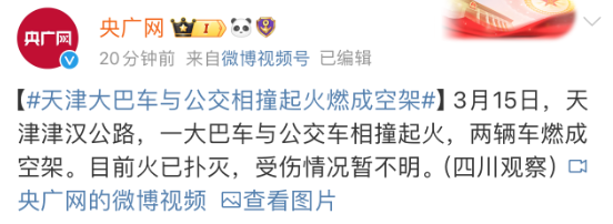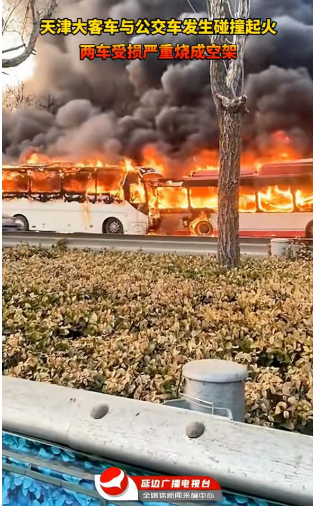 据@四川观察稍早前消息,3月15日,天津津汉公路,一大巴车与公交车相撞起火,两辆车燃成空架,目前火已扑灭。