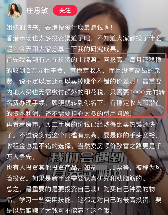 6月29日,郑子邦在社交网络透露庄思敏已豪掷超过400万元,向他旗下车行购买的士牌,正式以投资者身份加入的士行业,郑子邦告知她每月可至少拿到2万获利,看到庄思敏涉足出租车行业,有网民即留言嘲讽:“这样就可以专职搭杨明了。” 还有不少数学好的网民迅速帮庄思敏算了一下收入,发现她要17年才能回本,看起来这桩买卖似乎并不划算。 也有网民发现近期牌照入场费很低,400万已经算很便宜的了,早些年能炒到700多万,每月回报率其实也有5点几,之后车牌还可升值,似乎比买楼要划算。 同时,不少人看见郑子邦纷纷追问:“姚子羚前男友?、JM前男友?、港姐杀手,是你吗?” 说回郑子邦,郑子邦是豪门阔少,父亲于2003年离世,当年20岁出头的他全面接管家族生意,靠着薄利多销将生意愈做愈大,其管理的士车队规模由20多架扩展至逾百部,之后开始涉足物业、股票、债券等投资产品分散风险,早年已传他坐拥逾亿身家。 据报道指,郑子邦于2014年以约1,344万元购入658平方呎的坚尼地城浚峰单位,至去年以约2,000万元售出,帐面获利约656万元,升值近49%;他原本自住的大潭红山半岛顶层特色户,亦于去年突然以每月5.7万元租出。 郑子邦的感情生活亦多姿多彩,更可堪称花旦杀手!2014年,他被拍得与文咏珊亲密贴脸,因而令二人恋情曝光,未料之后却传姚子羚靠投其所好,成功击退文咏珊,更火速发展至同居关系,可惜2018年宣告结束3年情。同年,郑子邦被爆与汤洛雯在友人生日派对中互动亲昵,随即传二人暗挞,不过当时汤洛雯自称“宇宙无敌单身”,跟对方完全不过电;年底,他再因与视后唐诗咏一起做义工而传绯闻。 与汤洛雯互动 此外,郑子邦与不少艺人熟络,早年更与丁子高合资在铜锣湾开斋铺“东后斋”,二人又共同拥有马匹“野孩子”,他亦曾与郭富城的排舞师SunnyWong合资开港式烧烤店,难怪成为不少女星心目中的笋盘。