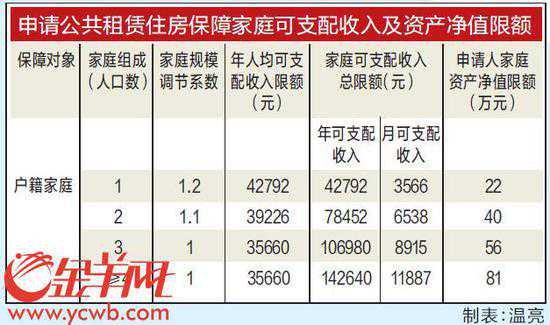 25日,广州市人民政府发布《关于进一步加强户籍家庭住房保障工作的通知》(以下简称《通知》)。《通知》对户籍家庭住房保障政策进行“三调整一完善”,即公共租赁住房收入线准入标准调整为35660元/年,租赁补贴标准从25元/平方米调整为30元/平方米,租金缴交比例下调14.29%—50%,同时完善住房困难家庭的公共租赁住房保障退出机制。 放宽准入标准: 年收入由29434元调为35660元 《通知》指出,自《通知》印发之日起,将公租房现行收入线准入标准限额从家庭年人均可支配收入29434元调整为35660元(约为2017年城市常住居民人均可支配收入的65%),涨幅21%,并按照收入线调整幅度同步调整资产限额。 广州市住建委负责人表示,收入准入标准调整后,未来三年,预计符合公租房申请条件的人数将增加两千至三千人。 增加租赁补贴: 从25元/㎡调整为30元/㎡ 《通知》表示,自今年10月起,结合市场租金状况,将租赁补贴标准从25元/平方米调整为30元/平方米;将越秀、海珠、荔湾、天河4个区的区域补贴系数从1.1调整至1.2。按此调整后,户均补贴额将从目前的760元/月上升至970元/月,增幅约28%。 广州市住建委负责人表示,一个经民政部门核定的低保、低收入且无自有产权住房的3人家庭,如果户籍地在越秀、海珠、荔湾、天河区,其住房租赁补贴由原来的1609元/月增加到2106元/月;如果户籍地为白云区,住房租赁补贴为1755元/月;户籍地为黄埔、花都、番禺、南沙区,住房租赁补贴为1579.5元/月;户籍地为增城区,住房租赁补贴为1228.5元/月;户籍地为从化区,住房租赁补贴为1053元/月。 下调缴交比例: 租金下调幅度最高达50% 自《通知》印发次月起,公租房租金缴交比例将下调,从目前按公租房项目租金的20%-70%缴交调整为按10%-60%缴交。调整后,租金整体下调幅度为14.29%—50%,收入越低,下调幅度越大;同时采取租金封顶机制,租金按该家庭经核定的月可支配收入的15%封顶,超出部分予以免交。 而按规定免交租金和按优惠租金标准(1元/㎡)计租的保障对象继续按原租金标准计收租金。 广州市住建委负责人以租住聚德花苑50平方米公租房项目为例:“聚德花苑电梯楼租金标准为33元/月·平方米,原月租金为330元至1155元的家庭,调整后月租金为165元至990元。” 完善退出机制: 不再符合资格的家庭有半年过渡期 《通知》规定,承租政府公共租赁住房的家庭,经审核不再符合公共租赁住房保障资格的,应当在1个月内结清有关费用并腾退公共租赁住房,暂时无法腾退的,给予6个月过渡期。过渡期满后,按收入、资产、住房情况分类处置:家庭可支配收入或资产在公租房准入限额标准1.5倍以内的,可以选择按照公租房项目租金计租,或者按照家庭月可支配收入的20%计租;在1.5倍至3倍之间的,按照公租房项目租金的1.5倍计租;超出3倍的,必须腾退现住房。(记者赵燕华吴瑕通讯员穗建)