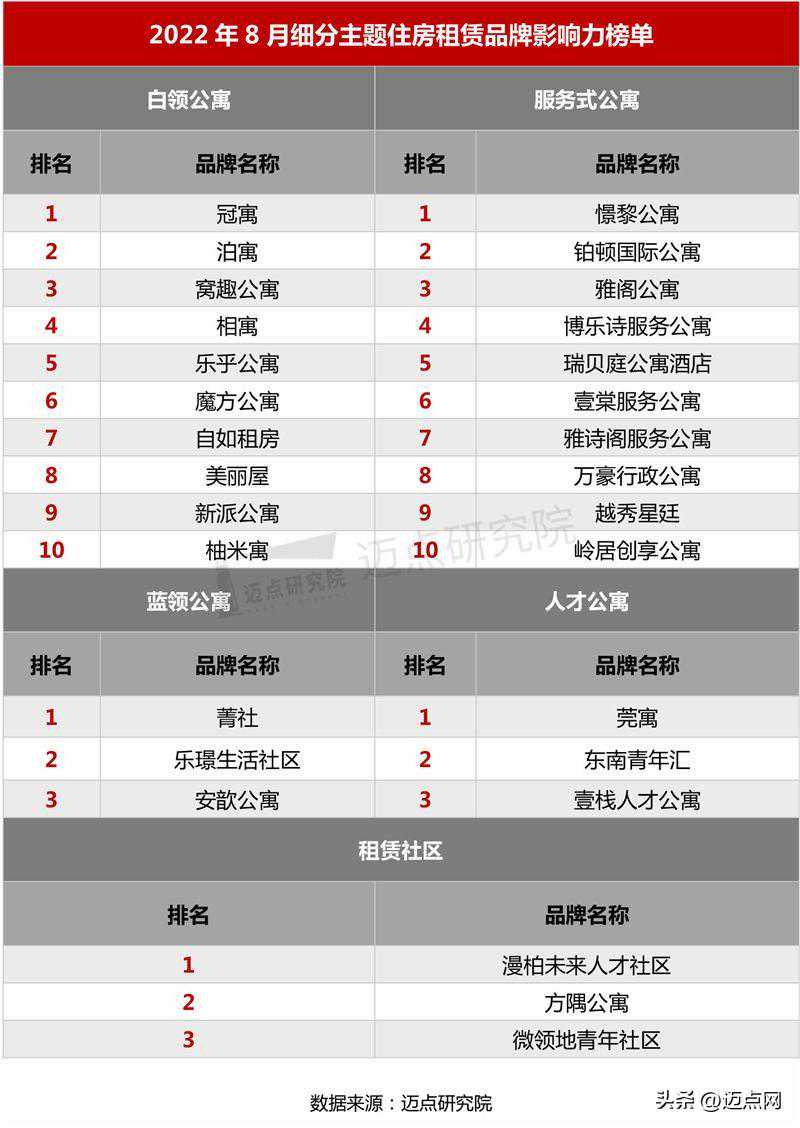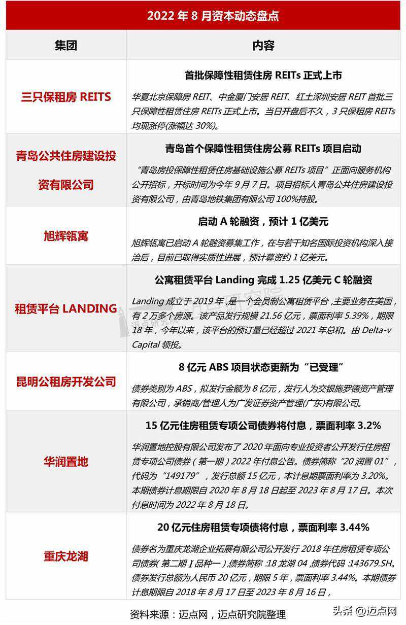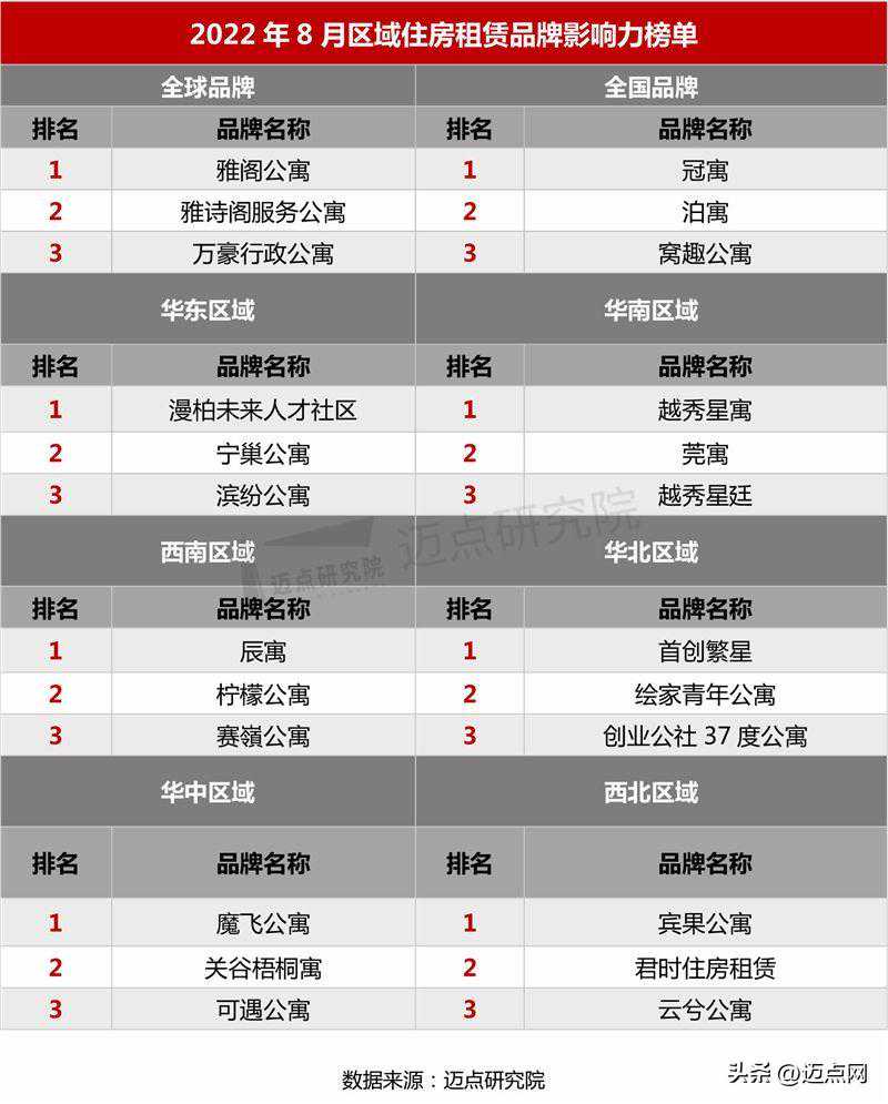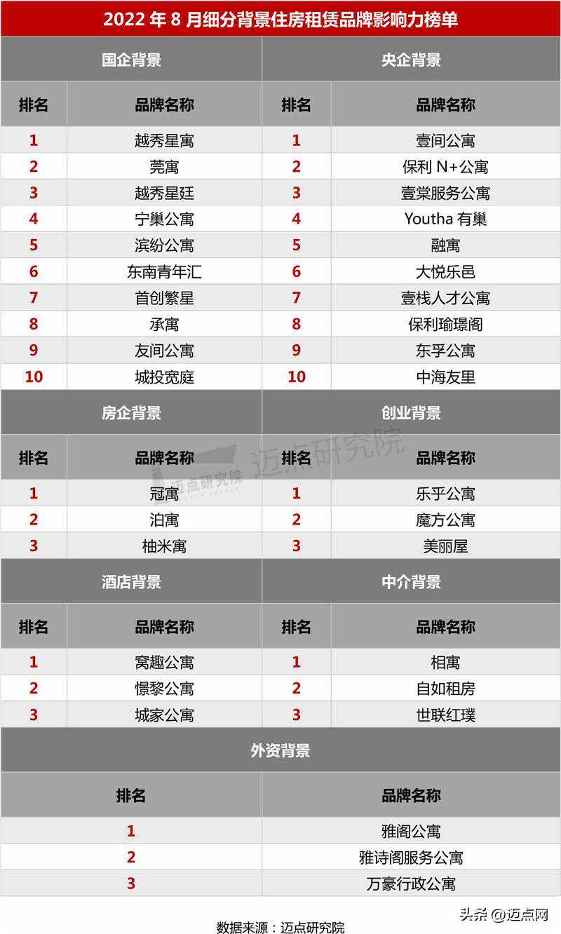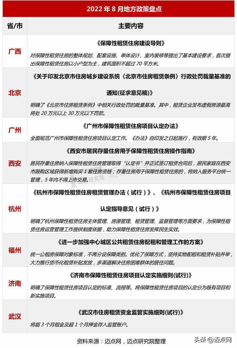 一、行业动态 1、地方政策 8月,地方政府在市场监管和市场培育方面加大政策力度。多地政府发布保租房的认定办法,包括广州、杭州、济南等。另外,西安出台新规,居民限购区内存量住房可纳入保障性租赁住房体系,由国资控股企业试点运营。签订“认定书”并签订租赁合同后,可在限购区新购1套住房。此前,成都、长沙已出台类似政策,其中,长沙5月出台政策以来,已有5000户以上家庭申请将存量房纳入保障性租赁住房。 2、资本动态 8月,住房租赁行业迎来首批3只保租房REITs的正式上市,REITs发行进入快车道。另外,青岛也迎来了首个保障性租赁住房公募REITs项目启动。自从去年6月,保障性租赁住房被纳入基础设施REITs试点项目后,相关试点工作逐步在全国展开,包括浙江、广东、山东、上海、江西、湖南等12个省份明确提出支持开展保障性租赁住房REITs试点。相信随着首批保租房公募REITs的正式发行,将吸引更多以保障性租赁住房、公租房等保障房为底层资产的公募REITs发行上市,深化保障性租赁住房市场化进程。 3、企业动态 住房租赁企业半年报发布成为本月热点。包括冠寓、泊寓、方隅公寓、青客公寓等都发布了企业中期业绩。其中,冠寓租金收入同比增长11%至11.8亿元,累计开业房间数已超11万间,已成为集团经营性收入的稳定贡献源;泊寓上半年实现营业收入14.8亿元,同比增长12.3%,共运营管理长租公寓20.99万间,累计开业16.95万间;方隅公寓管理房源超过3万间,稳定运营的一线重资产项目平均出租率超85%,同比租金涨幅超11%。开工动态方面,福州左海集团所属福州工业园区集团旗下长租公寓品牌U厝厦坊店项目正式开工,将提供333套租赁住房,是地方国企转型参与建设保租房项目的又一有益探索。 二、土地市场 1、租赁用地成交:济南8月共成交保障性租赁住房用地1宗,成交土地建设面积37444.4㎡ 2022年7月30-8月5日,济南成交1宗纯租赁用地,成交总价1.04亿元,租赁建面约3.7万方,为保障性租赁住房,由济南历丰置业有限公司竞得。 三、租赁市场 1、保障性租赁住房供应:部分省市公布计划和筹集进度 8月,浙江、河北、杭州、温州等省市继续公布保障性租赁住房的筹集进度和供应计划。浙江、温州提前完成年度供应目标。河北、杭州年度完成率分别为91%和77.1%。 8月,住房城乡建设部住房保障司副司长潘伟介绍,近两年,全国已开工建设保障性租赁住房256万套(间),能够解决700万新市民、青年人的住房困难。山东、江西发布保租房的开工进度盘点,开工率分别达到56.4%和91%。 2、全国20城住房租赁市场表现:继续回暖,租金水平或将趋于平稳 8月,全国重点20城住房租赁市场继续回温,由于就业旺季的催动,租赁市场回归传统周期,市场活跃度继续上升。全国20城租赁房源平均租金51.7元/月/㎡,环比微涨0.39%。深圳、上海等城市均迎来租赁旺季。 从不同线级城市的租金来看,2022年8月,不同线级城市租金分化明显,一线、新一线城市租金普遍上涨,二线城市租金下滑。其中一线城市租金稳定性高,抗风险能力强,租金均价提升了2.24%。深圳、上海领跑一线城市涨幅。 新一线城市租赁房源均价为42.76元/月/㎡,环比上涨0.41%,同比下降0.18%。其中杭州和重庆租赁市场迅速回暖。8月,杭州和重庆的租金分别为71.62元/月/㎡和40.33元/月/㎡,环比分别上升6.09%和6.83%。 重点城市中,二线城市租赁房源均价为36.69元/平方米,环比下降2.68%,同比下跌6.40%。这主要是旺季效应淡化导致。其中济南和合肥下降最为明显。8月,济南和合肥的租金分别为39.53元/月/㎡和31.04元/月/㎡,环比分别下降5.29%和5.85%。 局部地区新一轮的疫情反复,为市场带来不确定性。随着市场逐渐步入淡季,租金水平或将趋于平稳。 四、本月百强榜单 以下是迈点研究院独家发布的“2022年8月住房租赁品牌影响力(MBI)100强榜单”。本月冠寓、泊寓、窝趣公寓、相寓、乐乎公寓、魔方公寓、自如租房、美丽屋、新派公寓、柚米寓进入榜单前十。 8月,住房租赁品牌100强的平均品牌指数为71.55,环比下降11.02%;行业均值21.51,环比下降9.15%。相比7月,长租公寓品牌指数整体呈现下降态势,这主要是由于毕业季进入后半场,品牌集中宣传相比上月进入尾声,加上八月底多地疫情反弹,中国内地本土疫情波及31个省份,致使市场热度下降,品牌影响力整体下滑。 五、品牌细分榜单 1、细分背景品牌表现:央企系品牌影响力增速最为明显,壹间公寓位居央企系品牌TOP1 在长租公寓品牌的细分背景中,综合平均指数和增幅来看,本月央企背景和酒店背景品牌整体表现较佳,央企背景的品牌指数为32.46,环比上升20.18%;酒店背景的品牌指数为29.12,环比上升18.23%。 相比上月,央企系品牌中,壹间公寓表现最佳,排名攀升显著,位列央企背景长租公寓品牌榜单第1名。这主要与招商蛇口壹间公寓的品牌活动和联合品牌营销有关。8月,招商蛇口壹间公寓推出租房优惠活动、全民健身月活动等,引起媒体的争相报道,大幅提高了品牌指数。 酒店系品牌中,城家公寓表现较佳,排名持续上升,位列酒店系住房租赁品牌榜单第3名。8月,天猫好房携手盒马鲜生,在城家公寓上海钦州路Citigo举办了“盒区房”的揭牌仪式,获得了媒体的大量报道。在“租个盒区房”超级品牌月活动期间,城家作为率先入驻天猫好房租房交易平台的品牌公寓商户,享有首批升级“盒区房”的商户权益,品牌热