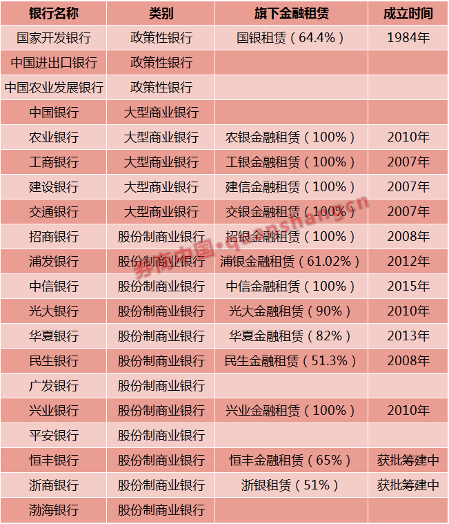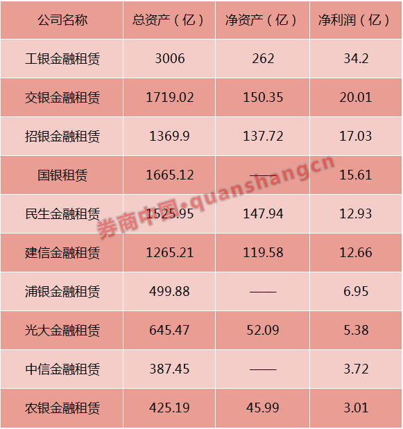 都说金融租赁是新的风口,这个隐秘低调行业有多赚钱你知道吗? 恰逢年报季,我们自然不可错过时机来“一探究竟”。 截至目前,国内已经设立的金融租赁已经超过50家,而这其中银行系占绝对主流。本报道将从3家政策性银行、5家大型商业银行及12家股份制商业银行入手,告诉你这些银行中哪些已经率先布局设立金融租赁公司?旗下金融租赁公司盈利情况又处于怎样的水平? 券商中国记者梳理多家银行年报发现,上述20家银行中有12家已经设立全资或者控股金融租赁子公司。而随着年报季逐渐推进,目前已有10家大行系金融租赁公司的盈利状况浮出水面,其中工商银行全资控股的工银租赁总资产规模、净资产规模等多项指标“超群”,2016年净利润高达34.2亿元,当之无愧地成为最赚钱的金融租赁公司。 三类银行绝大多数先知先觉 金融租赁市场已经发展到怎样的程度?根据银监会非银部主任毛宛苑在银行业例行新闻发布会上透露的官方数据,截至2016年三季度末,全国共开业52家金融租赁公司,行业资产总额1.94万亿元,负债总额1.71万亿元,行业实收资本1545.97亿元,前三季度实现净利润182.25亿元。 短短数年之间,金融租赁迅速膨胀至如此规模,各大银行们在其间“功不可没”。 券商中国记者注意到,已经成立的金融租赁公司种绝大部分属银行系,而国有大型商业银行、股份制银行更属当中的中坚力量。 三大国有政策性银行中,国家开发银行早在1984年便设立国银租赁,这是中国首批租赁公司之一,也是首批中国银监会监管的租赁公司之一。 2016年7月11日,国银租赁在香港联交所正式挂牌交易,成为国内首家金融租赁公司上市,而国开行持有其64.4%股份,仍是控股股东。 五大国有商业银行中,工商银行、农业银行、建设银行、交通银行均在早年独资设立金融租赁公司,中国银行则通过收购新加坡飞机租赁有限责任公司,进入融资租赁行业。 再看12家股份制商业银行,已经设立金融租赁也已占据大头。 截至目前,12家全国性的股份制银行中,包括招商银行、浦发银行、中信银行、光大银行、华夏银行、民生银行、兴业银行等7家已经设立旗下金融租赁公司,其中招银金融租赁、中信金融租赁、兴业金融租赁均由发起银行100%控股。 另据记者了解,尚未设立金融租赁公司的广发银行、恒丰银行、浙商银行、渤海银行均在筹备设立金融租赁公司,而恒丰银行筹建的恒丰金融租赁及浙商银行筹建的浙银租赁已经获得监管批复。 值得一提还有,平安银行没有下设金融租赁子公司,但平安集团下设有平安租赁子公司,双方已有较强的协同效应。 既然这三类重要银行多数都已先知先觉布局金融租赁,那么旗下金融租赁目前到底盈利情况如何呢? 盈利能力悬殊:工银租赁最强 正如前文所言,3家政策性银行、5家大型商业银行级12家股份制商业银行已经设立12家控股或独资金融租赁子公司,这些公司分别是,国银租赁、农银金融租赁、工银金融租赁、建信金融租赁、交银金融租赁、招银金融租赁、浦银金融租赁、中信金融租赁、光大金融租赁、华夏金融租赁、民生金融租赁、兴业金融租赁等。 恰逢年报披露季,相关银行中华夏银行和兴业银行尚未披露年报,但除却华夏金融租赁和兴业金融租赁,其他10家金融租赁公司的基本盈利状况已经“掀开头纱”。 记者整理发现,这10家金融租赁公司中,工银租赁的综合实力首屈一指。这体现在其3006亿元的总资产规模上,体现在其34.2亿元的净利润上,也体现在其110亿元的注册资本金上。工银租赁这三项指标在这10家公司当中均属第一。 或许正因为如此,工商银行在其2016年年报中也毫不讳言的表示,“工银租赁已成为国内综合实力最强的金融租赁公司。” 交通银行全资控股的交银金融租赁光荣地当选净利榜单第二名。年报显示,交银金融租赁2016年净利润为20.01亿元,虽然与第一名工银租赁存在较大差距,但这家公司也是另九家背景强悍的金融租赁中唯一一家净利突破20亿元的金融租赁公司。 截至2016年末,交银金融租赁总资产为1719.02亿元。这项数据在十家公司中,同样位列第二。 招银金融租赁与国银租赁分别净利榜单第三第四位。值得一提的是,招银金融租赁在总资产规模比国银租赁少300亿的情况下,净利高于后者1.5亿元左右。 民生金融租赁与建信金融租赁分别成立于2008年与2007年,两者的盈利能力目前也是水平相当,2016年净利润分别为12.93亿元及12.66亿元。 或许外界会对农业银行全资控股的农银金融租赁稍感意外,这家公司成立于2010年,但截至2016年末,这家公司多项数据在榜单中均属末流,其中净利润一项为3.01亿元,在十家公司中位列倒数第一。 盈利增速依然可观 券商中国记者梳理年报发现,各家银行对旗下金融租赁“看护”态度不一,有的在年报中详细阐述经营数据,并对旗下金融租赁公司的战略方针也一并“呈现”,而有的银行则对旗下金融租赁公司“着墨甚少”,甚至“惜字如金”,除了总资产及净利润两项关键数据,基本找不到其他核心信息。 作为香港上市公司,国银金融租赁的年报的看点应该是最多的。 2017年3月30日,国银金融租赁(股份代码1606.HK)公布2016年度经营业绩报告。这是国银租赁继2016年7月份在香港上市后首次发布年报。报告显示,国银租赁2016年实现收入及其他收益总额人民币114.41亿元,较上年增加人民币4.6亿元,增长4.2%。净利润大