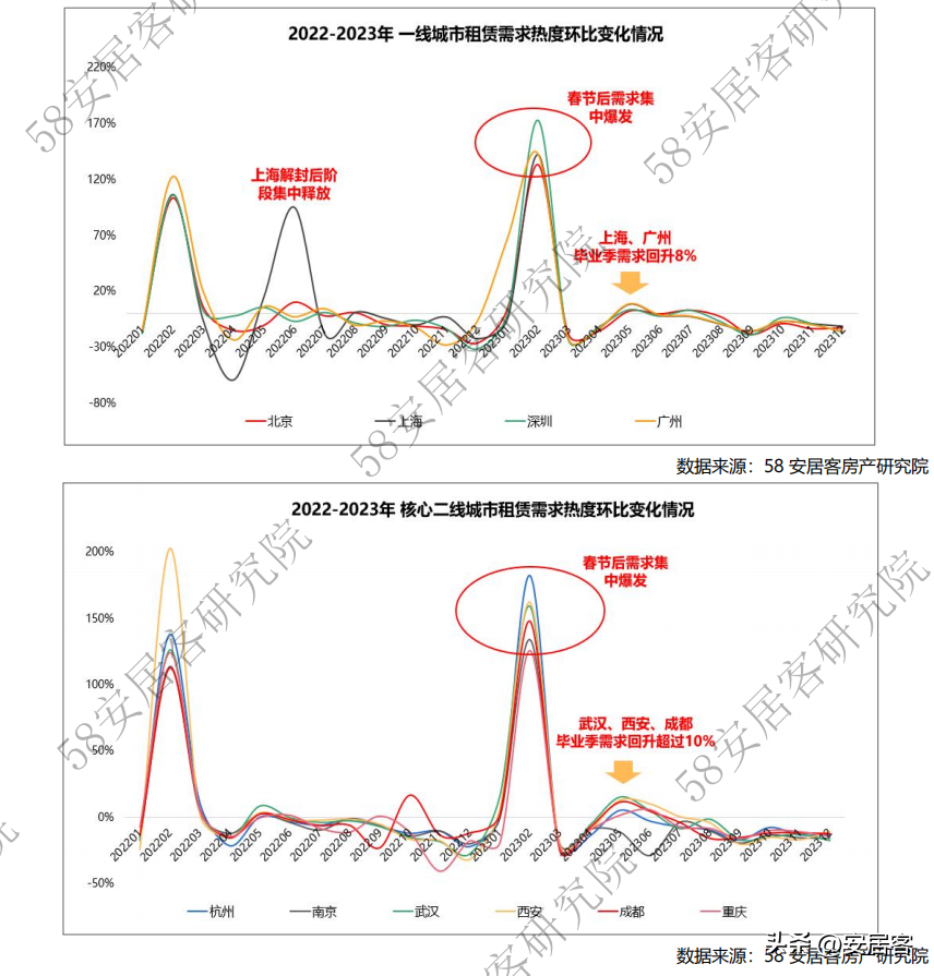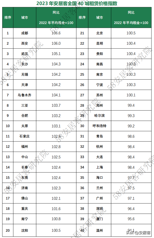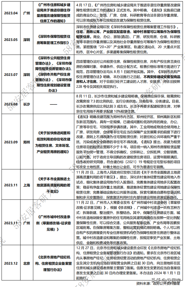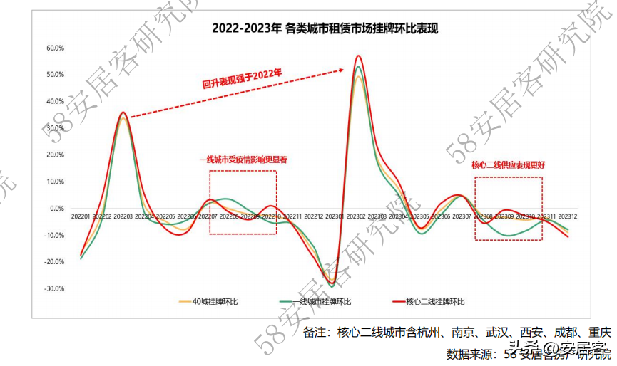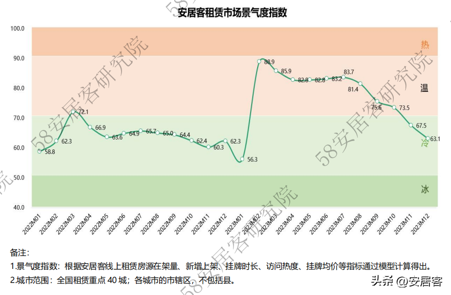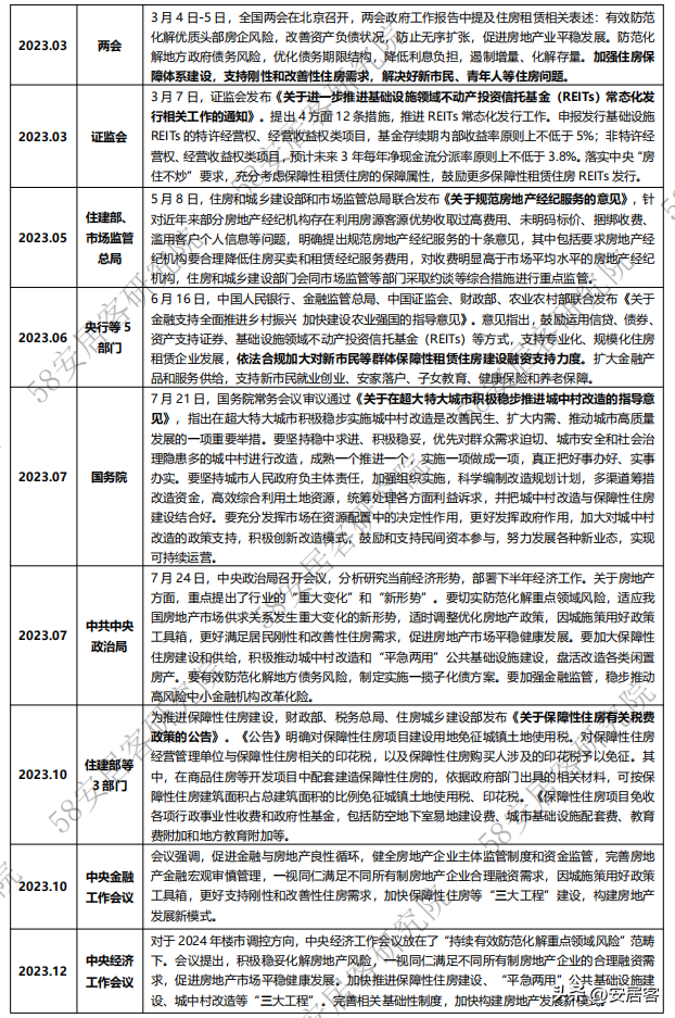 一、加强住房保障体系建设,推动保障性租赁住房供应落地 2023年,中央政府着力强调加强保障性住房建设,降低保障性住房有关税费,为行业内各主体提供金融支持。今年,两会政府工作报告定调“加强住房保障体系建设,支持刚性和改善性住房需求,解决好新市民、青年人等住房问题。”国务院常务会议审议通过《关于在超大特大城市积极稳步推进城中村改造的指导意见》,指出在超大特大城市积极稳步实施城中村改造是改善民生、扩大内需、推动城市高质量发展的一项重要举措。此外,在中央金融工作会议和中央经济工作会议中,强调加快保障性住房等“三大工程”建设,构建房地产发展新模式。通过房地产供给侧改革,以保障房和商品房互补的方式,满足各类人群的住房需求。 在金融支持方面,央行、银保监会提出加强住房租赁信贷产品和服务模式创新,拓宽住房租赁市场多元化投融资渠道,同时,加强和完善住房租赁金融管理。证监会、发改委、上交所等各部门先后发文支持稳步扩大REITs试点范围,加快推进REITs常态化发行,为保障性租赁住房融资打开新的渠道。 此外,财政部、税务总局、住房城乡建设部积极推进保障性住房有关税费减免,从供地、项目建设和交易环节等全方位降低成本,解决保障性住房供需两端的问题。一方面,可以有效推动和加快保障性住房的筹措和入市节奏;另一方面,通过全方位降低成本,解决住房困难人群,特别是工薪人群、户籍夹心层和各类人才的住房需求。 2023年,各城市租赁政策着力于进一步完善住房保障体系,同时加快推进保障性租赁住房项目供应落地。随着各城市大量保障性租赁住房项目的入市,租金价格也将得到有效平抑。 今年,深圳确立了以公共租赁住房、保障性租赁住房、共有产权住房为主的住房保障体系,与国家住房保障体系全面衔接,正式转向“三位一体”住房保障体系。同时,一线城市持续强化租赁行业监管。《上海市住房租赁条例》正式落地实施,通过立法全面加强租客权益保障。北京出台《北京市房地产经纪机构、住房租赁企业备案管理暂行办法》,完善房地产经纪行业监管,为租售市场提供更健康的环境。同时,深圳、广州出台相应城中村改造政策,积极探索城中村改造新模式,并且推进非居住存量房屋改建保障性租赁住房。 今年,各城市也积极拓宽保障性租赁住房筹集渠道,郑州、西安等城市跟进加快推进闲置和低效利用的非住宅改建为租赁住房或保障性租赁住房,积极探索盘活存量资源。同时,截至今年年末,全国预计将筹集564万套保障性租赁住房。一线城市保障性租赁住房占比较高,今年市场租金涨幅较小,对租金平抑效果显著,租房压力得到一定缓解。 根据安居客租赁市场景气度指数显示,2023年全国重点40城租赁市场整体呈现弱复苏,市场供需表现较2022年大幅回升,但市场复苏的强度及持续性有所不足。上半年,在疫情影响消退后,春节后租赁供需集中性爆发,市场活跃度大幅回暖。同时,市场二季度一直维持相对平稳的供需状态,景气度指数一直保持在80以上。上半年整体处于较“温”的景气度状态。 步入三季度,受到宏观环境的影响,经济呈弱复苏。就业招聘市场活跃度下降,传导到租赁市场的毕业季遇冷,需求较往年偏弱。同时,今年房地产市场处于调整阶段,由于重点城市二手房挂牌量的上升,也对租赁挂牌量产生了一定影响,租赁新增供应偏弱。下半年,租赁挂牌供应活跃度及需求热度普遍呈持续下降。租赁市场整体状态逐步降温,市场呈现小幅回落趋势。 附注: 1.城市范围:全国租赁重点40城;各城市的市辖区,不包括县。 2.数据样本:数据基于市场公开信息、58同城网站及安居客网站自有监测数据、历史沉淀大数据等。 2023年,租赁市场迎来了疫情后的复苏。根据安居客全国40城租赁价格指数显示,今年有27个城市租赁价格指数同比上涨,价格上涨城市数量较去年增加8个;13个城市租赁价格指数同比下跌。其中,27个城市价格指数波动幅度处于-3%~3%区间,市场整体呈现出复苏的基调。 对比2022年市场租赁价格表现来看,今年城市租赁价格表现分化,体现为二线城市复苏状态强于一线城市。由于前期不同城市受疫情影响差异较大,疫情后人口流入及产业恢复情况不同,因此,今年各城市租赁市场挂牌价格表现的差异被拉大。 今年,二线城市租赁市场复苏情况较好,挂牌租金价格回升显著,表现强于一线城市。如热点二线城市成都、西安、武汉等,租赁价格指数同比涨幅超5%。多数省会城市租赁价格指数也呈现温和回升,如合肥、长沙、太原、石家庄、福州及济南等。与此同时,一线城市中仅北京租赁价格指数同比小幅上涨,深圳同比下跌3.6%。究其原因,2022年,一线城市在疫情下仍保持了较强的经济韧性,就业环境相对稳定,租赁市场的稳定性强于二线城市。但今年受经济弱复苏的影响,就业环境转弱,在一定程度上影响租赁市场的供需活跃度,租赁价格的支撑力度变弱。 整体而言,今年在租赁价格表现方面,全国40城整体呈现复苏的状态,但疫情后各城市价格走势分化。未来,在各城市经济复苏及产业升级的带动下,租赁市场有望逐步进入新的平衡状态。随着宏观经济的复苏,预计租赁市场供需活跃度将得到提升。 2023年初,随着疫情影响的消退,春节后租赁市场呈现出供需两旺的态势。一方面,由于年后求职务工