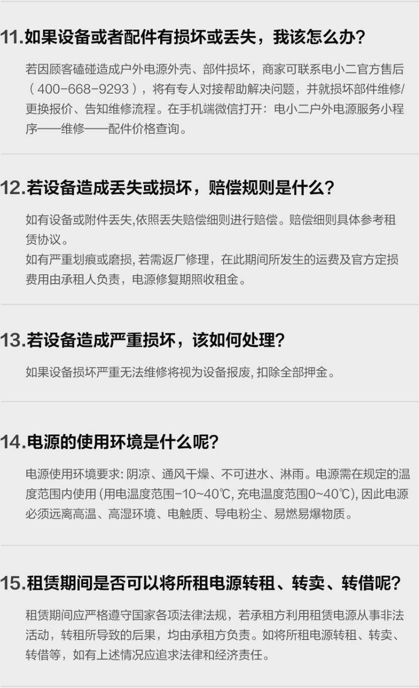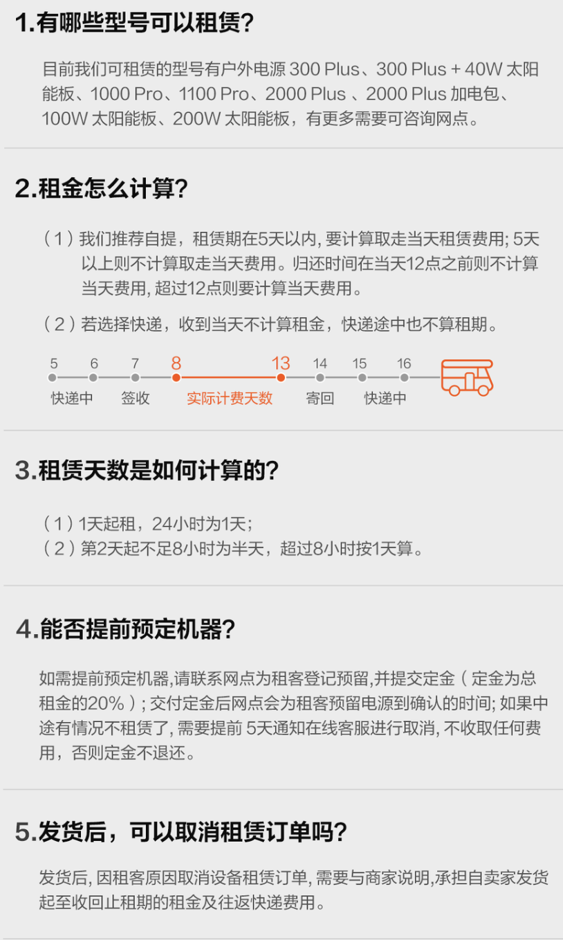 用户可以选择租赁电小二户外电源、光伏板以及加电包。价格方面,据官方介绍,以租期10天以上为界限,价格最低的为电小二300Plus户外电源,为25元/天,押金1700元/次;最贵的为2000Plus,为99元/天,押金7500元/次,在此基础上租期越短,日租金的价格则越高。