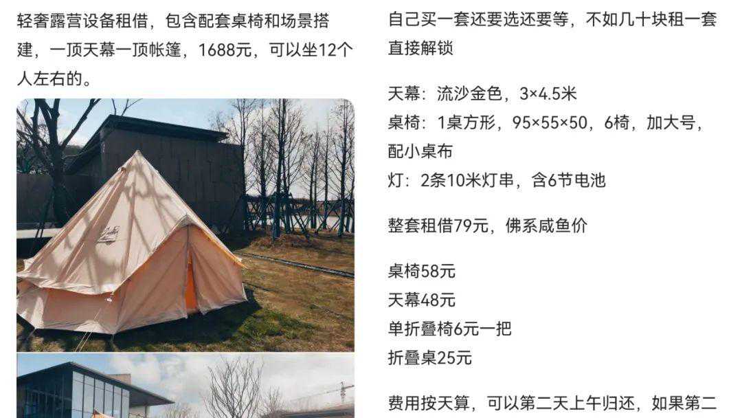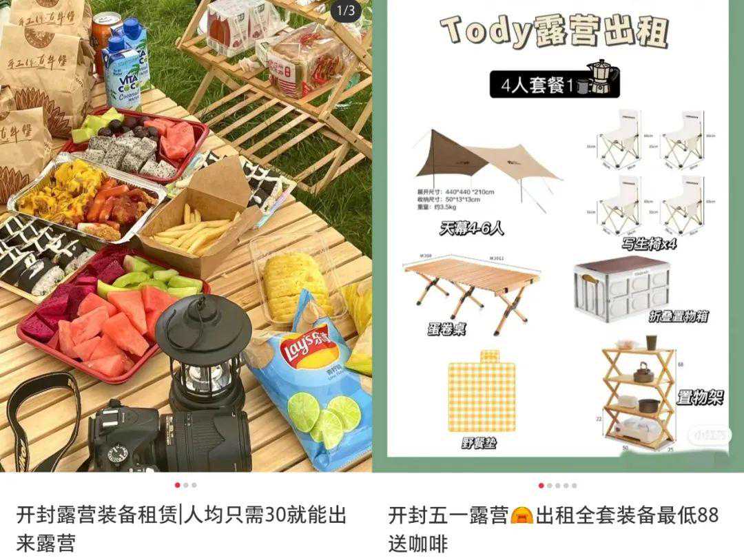 文|王崭 编辑|斯问 内容端的火热传导至需求端,最后都成了无数商品链接,装满了自己的购物车。在淘宝、天猫和京东等电商平台,搜索“露营”就会跳出帐篷、天幕、露营椅等更加细分的子类目,《天猫2022年五一消费趋势报告》显示,4月20日—5月4日,天幕销售额同比增长2100%,户外咖啡壶、桌椅与烧烤盘销售额同比增长3倍以上。艾媒咨询也针对蓬勃发展的中国露营市场发出预测:2025年中国露营核心市场规模将达2483.2亿元,带动的市场规模将高达14402.8亿元。 消费流行总是自上而下进行传导:就如同火热的滑雪运动,从一二线城市传向三四线城市、小县城,从明星网红向普通消费者迁移。随着市场的扩大,租借共享经济也开始涌现,露营正在呈现出这样的趋势。在国外,露营装备租借已经有了较为成熟的模式,商家们与专业营地、公园等合作租借露营装备,但在国内,租借露营设备还是一片蓝海。 “认识的不少做露营装备租借的商家,都是今年才做起的。基本谁先开始做,就能先积攒下来口碑,也能通过口碑吸引更多客户。”南京的Kenn表示,不少商家都是因为看到了五一的露营热而入局,想要在租借市场抢占先机。 露营,正在从小众消费转向大众消费,市场的需求催生了租借露营装备的生意,而这门生意也不断帮助露营进行着人群渗透与市场下沉。 “虽然我朋友圈的露营照片看起来很高级,但装备上每个人只花了30元。”南昌的灵子最近体验了一把露营,投入的花销拆分下来:租的新手露营装备套餐一天120元,800元押金,交还装备后会返还。“装备是租的,营地就是免费的公园草地。”四个朋友平分下来,一人只要支付30元,加上交通费、食物等,一次露营的花费也不过人均80元。 当下流行的精致露营图片来自江湖户外 搁在平时,想要搭配一套高端大牌的露营装备,可能需要花费上万元甚至十几万元,简单平价的露营装备一套也需要一两千元。但现在,人均几十元,就能拥有一套精致的露营装备一天的使用权,租借也就成了不少露营新手与体验者的优先选择。 在各个社交平台、电商平台和二手交易平台搜索“露营装备租借/出租”,会跳出上千条相关消息,天幕,蛋卷桌和克米特椅等露营装备几件套必不可少,但专业性较强的装备不多,并且大多都是本地租借为主。原因主要有两个,一是消费者希望性价比体验且兼具颜值曝光,可以拍出精致大片,二是大多数专业露营玩家已入坑,他们有比较完善的装备,也更倾向于自己去购买设备,租借露营装备是一门针对新手的生意。 「电商在线」观察发现,大多数出租的露营设备多为白牌和国产品牌,也分为单独租借某一露营装备和整租全套露营装备两种,根据城市、品牌和装备价格等,收取不同的租借和押金。 租借全套装备的押金基本在1500—3500元之间,费用一天150—400元,商家会规定租借前一天晚上或者当天早上交接设备,当晚或第二天早上归还时要经过检查再退还押金,如果设备有损坏,需要扣除一定押金。 闲鱼上,租借露营设备标价最低是79元,最高的则是1688元,两者包含的装备和服务不同:79元的套餐来自成都的一位商家,包含一块天幕、一张桌子和6张椅子,还有灯串和电池,商家并不提供额外服务;1688元的套餐来自舟山,包含了一顶帐篷、一块天幕和配套桌椅,可以坐下12个人,商家表示还能搭建各种配套场地,基本能满足举办各类活动的需求。 闲鱼上,1688元的套餐和79元的套餐 尝鲜的个人体验者占据了大部分生意,但不乏有大客户也来租借装备。不少商家表示,也接到过公司团建、市集或者宣传活动的需求订单。 在国内平替露营产品越来越多的情况下,为什么还会有这么多人选择租借装备呢?我们通过采访和观察总结出三点: 1.相比购买,租借更为便宜。即使在电商平台购买各种平替和白牌设备,花费也接近千元,而150元基本可以租下一整套基础露营装备,人均只要几十元。 2.体验高端装备。不少消费者还是会比较在意品牌,一些商家也会专门注明装备品牌来吸引客户。不少有品牌的露营装备标价几千上万元,而租借只需要缴纳押金,花费几百元就能拥有一天的使用权。 3.定下露营出游计划,但装备还没有到。在五一期间露营的夏夏就表示,她在四月底就购买了相关露营装备,但是快递延期,她就租借了一套装备应急。来自南京的陈尚购买的天幕、克米特椅子和露营推车都到了,但蛋卷桌和卡式炉却因种种原因迟迟没有发货,他就先租借了这两样装备。 新兴的露营租赁市场,它又和不局限于生意半径的互联网看似矛盾——大多数玩家都只在属地经营,很少会通过互联网触达其他地区的消费者。 入局个人玩家大多由露营爱好者转变而来,商家只负责租赁,买家需要自提装备,自己搭建。 开封Tody露营的负责人就是一位露营爱好者,花费几万元攒下了不少露营装备,她在小红书上看到了出租露营装备的帖子,于是和男友做起了副业。 南京的Kenn则是一位有着六年露营经验的资深爱好者,“这两年被我淘汰的东西都可以凑出三套露营装备了,花了也有五六万元,卖二手七折起,去年露营很火,我就想能不能把这些露营装备租出去赚点钱。”2021年,做租借露营装备的人还不多,Kenn的生意经常“供不应求”,于是他又拉上了几个露营爱好者组了一个小工作室,又陆续买了一些装备,凑了十几套露营装备出租。 入局的专业玩家也不在少数,他们会提供一些增值服