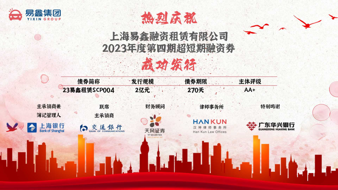 9月5日,上海易鑫融资租赁有限公司(以下简称“易鑫租赁”)在银行间市场成功发行“上海易鑫融资租赁有限公司2023年度第四期超短期融资券”项目(23易鑫租赁SCP004),总募资规模为2亿元(人民币,下同)。 此次超短期融资券项目(SCP)发行期限为270天,由上海银行作为主承销商及簿记管理人、牵头整体工作,交通银行作为联席主承销商并为此期超短融创设信用风险缓释凭证(CRMW)。此次项目不仅得到了多家授信行的支持,还吸引了多家非银投资机构的积极认购,利率达到簿记区间下限,认购倍数创易鑫发行信用债的新高,显示出易鑫租赁信用债产品获得资本市场的高度认可。 易鑫集团的后续系列发行还将在此系列项目基础上,进一步拓宽融资渠道,优化融资方式,推动汽车金融业务深度提升,以积极响应国家大力推动汽车流通、扩大汽车消费的措施,并助力推进资产证券化和债券市场的对外开放和高质量发展。