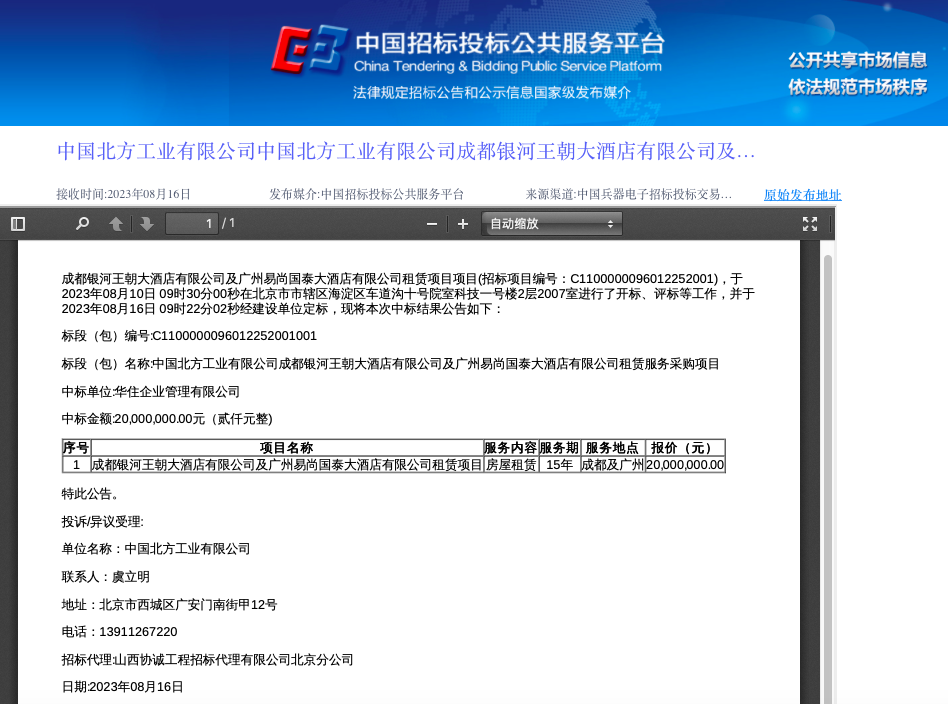 8月16日,银河王朝大酒店有限公司发布《关于银河王朝大酒店结束营业的告知函》,由于酒店将进行经营体制改革,经由上级主管部门批准,银河王朝大酒店将于2023年8月31日正式结束营业。 值得注意的是,就在上述告知函发布的同一天,中国招标投标公共服务平台发布了《中国北方工业有限公司成都银河王朝大酒店有限公司及广州易尚国泰大酒店有限公司租赁服务采购项目中标结果公告》。 根据该公告,华住企业管理有限公司中标中国北方工业有限公司成都银河王朝大酒店有限公司及广州易尚国泰大酒店有限公司租赁服务采购项目,服务期为15年,中标金额2000万元。 企查查信息显示,银河王朝大酒店有限公司成立于1986年11月,注册资本1000万美元,公司现由银华国际(集团)有限公司、中国北方工业集团有限公司和广州华南信息产业有限公司分别持股55%、40%和5%。 聚焦银河王朝大酒店,作为四川西南地区首家合资四星级酒店,该酒店位于成都市锦江区顺城大街88号,身处成都市商业及娱乐中心区,酒店于1996年开业,共26层,拥有354间客房,根据携程信息,该酒店曾于2009年重新装修,现酒店用户评价超2700条,评分为4.2。 根据企查查信息,在2022年11月16日,广州华南信息产业有限公司曾将其持有的银河王朝大酒店有限公司5%股权挂牌转让,从主要财务指标来看,彼时的银河王朝大酒店有限公司已经陷入困境。 根据挂牌信息,2021年,银河王朝大酒店有限公司营业收入4078.72万元,净利润为-1671.29万元;2022年前3季度,公司营业收入为2552.42万元,净利润为54.37万元。 截止2022年9月30日,银河王朝大酒店有限公司资产总额为16367.74万元,负债总额为113800.55万元,所有者权益为-97432.82万元,已处于资不抵债境地。 视线转向华住企业管理有限公司,该公司为国内头部酒店企业——华住集团(01179.HK)旗下,结合该集团近年来的规模扩张细节,减少重资产投入/加速向轻资产模式转型属于显性趋势。 财报数据显示,从2020年华住租赁及自有酒店数量升至753家这一峰值后(主因应为2020年初完成对德意志酒店集团的收购),其租赁及自有酒店数量由此一路下滑。 到2022年底,华住集团租赁及自有酒店数已降至704家,对应到在集团总酒店数的占比,已从2020年底的11.09%,降至2022年底的8.24%。 具体到2022年,根据财报数据,华住集团当年开发中的租赁及自有酒店共计40家,其中多数集中在欧洲,对在中国市场开发租赁及自有酒店,华住集团明显愈发谨慎,此次“一改往日常态”签约银河王朝大酒店做直营店,其传递出的信号颇为积极。 根据文旅部发布的2023年第一季度全国50个重点旅游城市星级饭店经营情况统计,全国四星级饭店平均房价为346.82元/间夜,平均出租率为44.53%;同期成都四星饭店平均房价和平均入住率分别为307.98元/间夜、49.63%。