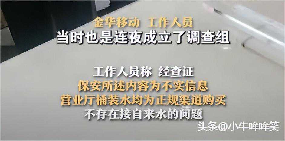 此时一经发布,立刻引发网友热议随后警方也迅速介入到营业厅进行调查取证,对店长进行询问。并已通知卫健局,等待出示检测结果。我们可以看到,水桶底部确实是发绿,但是否和保安所说一致还需要等待卫健局出示进一步检测结果。浙江金华移动发表声明并连夜成立了调查组对于保安所举报的水源问题进行了查证,公司称保安所述内容不实,桶装水系正规渠道购买,公司也将处理造谣的保安,对此小编表示,对于这起“厕所水”事件而言,我们应当保持高度警惕,不要盲目跟风,事情最后的处理结果还未公布,卫健局也未公布检测结果。作为一名消费者,理应保持理智,但也不要忘记时刻维护自身利益,以免遭受不法分子侵害。