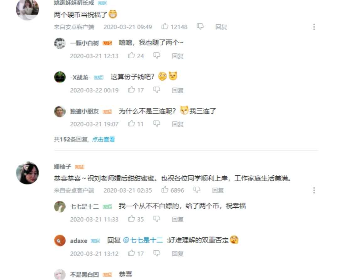 与线下婚礼不同,这场线上直播间里的“云婚礼”,没有的浩浩荡荡的车队、没有热热闹闹的酒席,有的只是一对新婚小夫妻通过直播镜头,向自己未能到场的家人及同学分享爱情的甜蜜……疫情下的一场特殊婚礼。 公考老师化身新郎云撒狗粮收“份子”两不误 新郎是B站科技区UP主刘文超,吉林人,2018年8月来到杭州,成为一名公考讲师,每天晚上在B站直播讲解课程(B站直播房间号:21283497),积累了大批“学生”,收获11万多的粉丝,与新娘孙晗晓相识就是在他的第一次线下课堂。 之所以选择以线上直播的形式来举办婚礼,是因为家人按照习俗选择了3月20日这个“黄道吉日”,但由于疫情关系,双方家庭无法凑在一起,小两口为了让远在吉林老家的家人以及同学朋友见证自己的爱情,于是想到“云婚礼”这种特殊的婚礼形式。 两位新人的“撒糖”行为,让网友们炸开了锅,“恭喜恭喜”、“百年好合”、“早生贵子”,来自全国各地的网友霸屏式弹幕祝福,排面十足,还有不少网友云送“份子钱”,300万“云伴郎伴娘”狂刷小礼物,为这对小夫妻的送去新婚祝福。 关于举办线上直播婚礼的初衷,刘文超表示,“通过这样的‘云婚礼’形式,希望给众多马上要结婚的新人提供一个参考,也算给防疫工作做一点点贡献。” 疫情下的“云婚礼”虽说迫于无奈,但也代表着年轻用户对“云上生活”的另一种全新尝试,受到无数B站直播网友的艳羡与点赞,纷纷表示“这不就是我想象中的婚礼吗”。 据B站工作人员透露,B站直播即将上线云婚礼专题,为在疫情期间无法线下相聚的新人、亲朋好友们创造更好的线上“云婚礼"氛围,值得期待。 疫情下“云“出的百般花样 因为疫情的原因,不仅许多人的婚礼受到影响,全国的学校延迟开学,学生们面对自动续费的超长寒假,在网课之余,也开始了“云自习”直播写作业。 “24h共享自习室”、“18h高考自习室”便是其中的缩影。不管是凌晨1点,还是早上7点,学生们都在认真埋头学习。“行者方致远,奋斗路正长”作为直播间的座右铭挂在直播页面正上方,而直播界面右侧则是相互鼓励、问好、交流学习进度的互动留言版,数万名“云同桌”同时在线督促学习。 为了满足疫情期间年轻人在家学习的需求,2月5日,“B站不停学”页面正式上线,累计直播开课405次,涵盖了10余家学校及教育机构的课程内容,为用户提供了应试、兴趣、通识等直播课。 此外,数以万计的线下演出、娱乐场所在受到疫情的巨大影响的同时,也纷纷开始尝试通过线上直播来与用户互动。 2月4日,草莓音乐节的主办方摩登天空与B站联合发起“宅草莓不是音乐节”直播活动;2月21日,B站上线了将更多线下活动、演出及展览等融为一体的专题“宅现场”,第一期“宅现场”的“三天三夜音乐场”第二期也是邀请了B站音乐区的UP主参与直播,音乐现场之外,还包含了“深夜食堂”、“玉石鉴赏”等内容。此后,“宅现场”又上线了首个线上HipHop音乐节以及《干嘛呢?乐队》、《麻油叶乐现场》等直播综艺。 在B站生活不会被打败 “云上”成为了当前的一种教育方式,娱乐方式,甚至某种生活方式,不管是网友自发的“云上见”,还是平台打造的“云蹦迪”、“宅现场”等,都为宅在家里的用户创造了一种“现场感”的内容,用线上直播互动的方式,满足了年轻用户渴望触摸真实生活的需求,弥补了因为疫情无法线下完成的遗憾。 待到春暖花开,疫情过去,”刘老师“们能够和亲友欢聚一堂,自习室的同学们再次齐坐课堂时,我想,B站直播一定还会有更多新的、有趣的、温暖的内容,正在直播中。