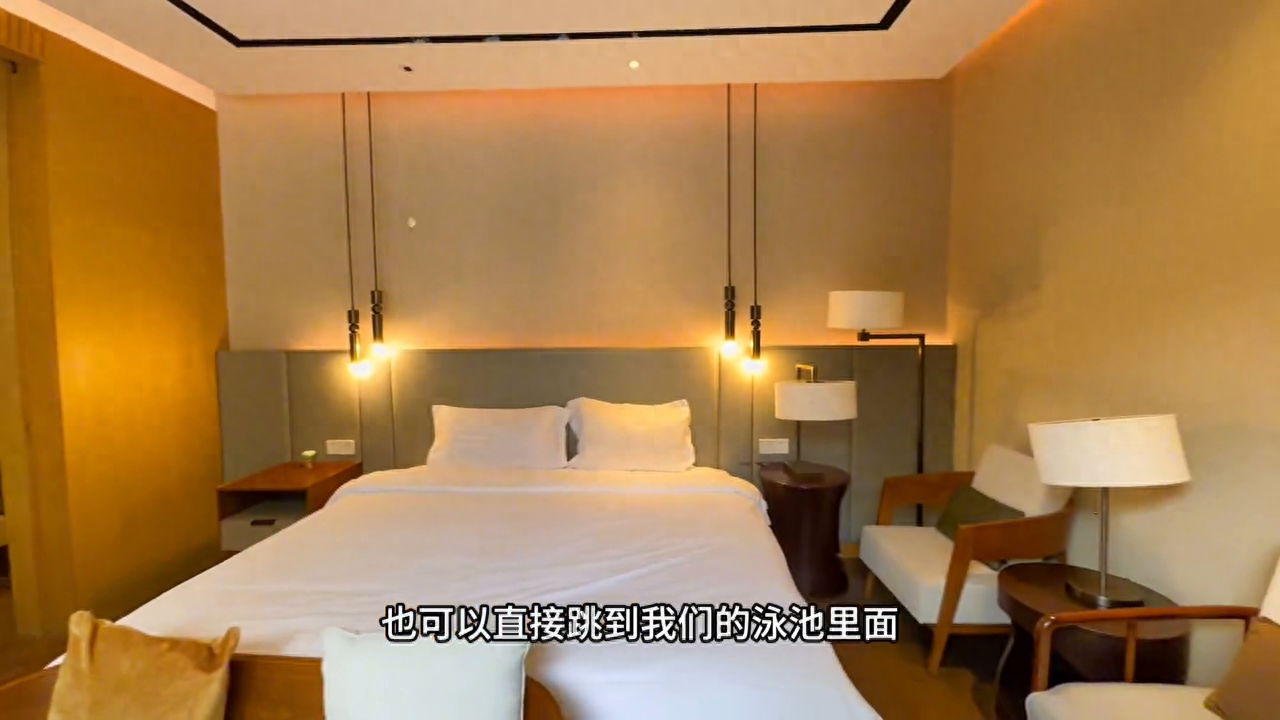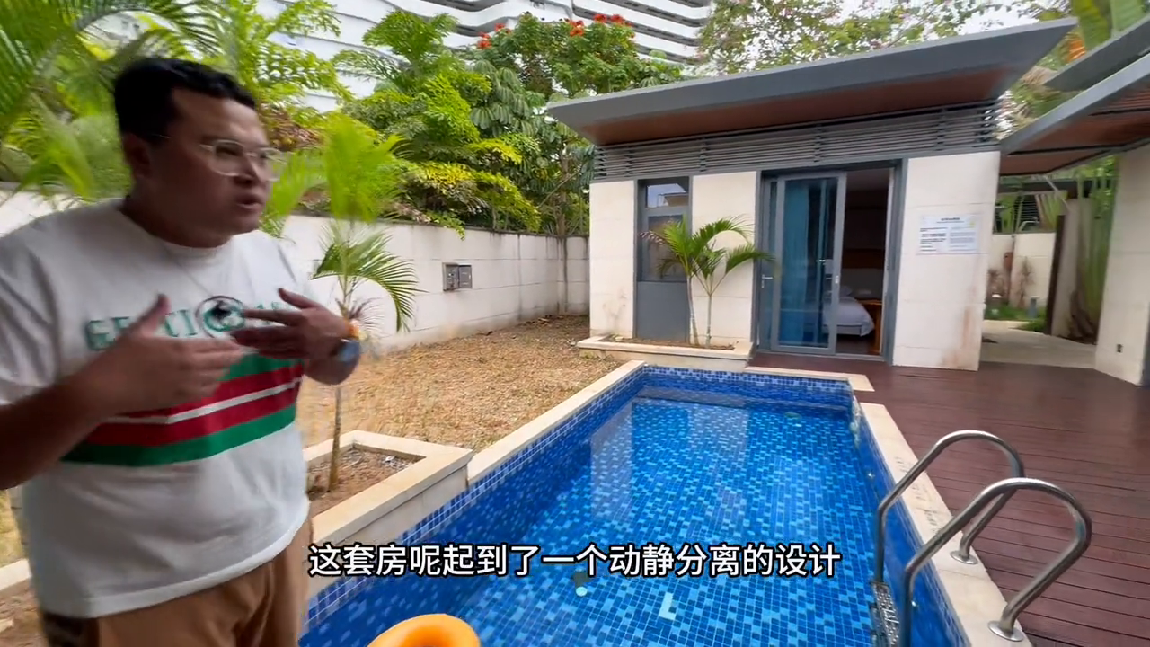 民宿:海棠湾亚特兰蒂斯三居泳池别墅,日租月租定春节。 没有什么能够阻挡你对别墅的向往,请签收你的梦想,来自亚特兰蒂斯的三居别墅闪亮登场。 哈喽大家好,我是三胖。今天三胖给大家带来一套春节期间可以短租的三居雅特兰尼斯的平替小别墅。这边就是庭院区了,庭院也是配有游泳池的。摄影师往后倒,先看第一间主卧室。来到这间主卧室,主卧室是敞开式的,躺在床上也可以直接跳到泳池里面,直接扎猛子。同样每间房间里面均都配备了干湿分离的卫生间,都是它的标配,装标也都是跟雅特兰斯的装标是一样的。 这套房起到了动静分离的设计,对面还有一间次卧室。来到这间次卧室,次卧室里面同样也给标配了一张一米8乘两米的大床,也都是配有干湿分离的卫生间。走出这间次卧室,到客厅,客厅里面有张一米8乘两米的大床。这样一套别墅睡6个人,全家人、一家三口人、一家四口人出门过年的时候也不会感觉到很拥挤。这边就是厨房了,这边是餐厅,可以开火做饭的。