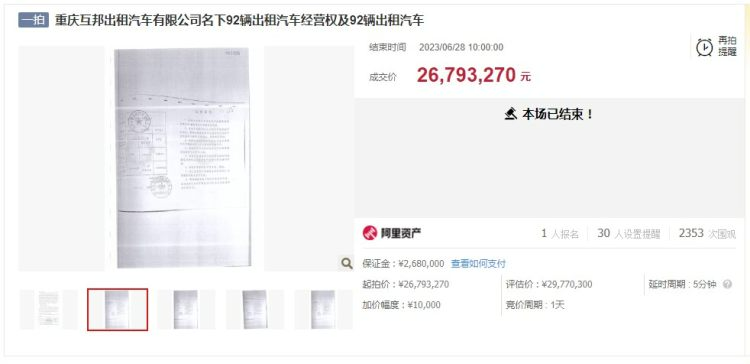 2023年11月23日到11月24日,重庆市第一中级人民法院在阿里司法拍卖平台,对重庆互邦出租汽车有限公司(互邦出租车公司)名下的190个出租车车辆经营权进行公开拍卖,起拍价6627.2万元。 唯一报名买家重庆渝涵智慧交通科技有限公司最终一次应价,以起拍价拿下,折合每个出租车车辆经营权为34.88万元。 互邦是一家“老牌公司”,重庆人应该比较熟悉,在街头常常可以坐到印着这两个字的出租车。 起拍价较评估价打7.36折 公告显示,本次互邦出租车公司名下190个出租车车辆经营权作整体拍卖,经营权所在地均为重庆市中心城区,归属互邦出租车公司所有,经营权有效期限为12年。 新的使用起始时间待本次拍卖并办理车辆经营权变更手续后重新计算,经营权编号重新编排,本次拍卖仅包含出租车车辆经营权,不包含对应的出租车车辆。 本次拍卖的190个出租车车辆经营权均存在被执行人已向出租车实际运营人和驾驶员预收保证金、“出租车份子钱”等款项情况。 为了保障出租车实际运营人和驾驶员等相关权利人的合法权益,维护出租车市场运营秩序,同时简化交付程序,已由该案申请执行人向出租车实际运营人和驾驶员等相关权利人先行垫付相关款项,拍卖成交后由执行法院从拍卖成交款中将垫付款项优先退还给申请执行人,故标的物起拍价已包含上述费用等等。 本次起拍价6627.2万元,评估价9120万元,起拍价相当于评估价的7.36折,保证金660万元,增价幅度为1万元(及其整数倍)。 天眼查数据显示,互邦出租车公司成立于2004年,注册地在重庆市渝中区上清寺路57号4楼,该公司的大股东为重庆互邦实业(集团)有限公司,持股比例为90%。 买家今年2月成立 公告显示,此次拍卖唯一报名买家重庆渝涵智慧交通科技有限公司(渝涵智慧交通科技)缴纳保证金660万元入场,一次应价,即以起拍价6627.2万元拿下,折合每个出租车车辆经营权为34.88万元。 天眼查数据显示,渝涵智慧交通成立于2023年2月17日,法定代表人简俊利,注册地在重庆市两江新区栖霞路16号,注册资本100万元,股东为重庆渝之行企业管理有限公司(占60%)、重庆渝涵企业管理有限公司(占40%)。 重庆渝之行企业管理有限公司为赖梦琳持股85%,简俊利占10%,董其莉占5%。重庆渝涵企业管理有限公司为简俊利占95%,曾志伟占5%。 此前拍出197个出租车经营权 互邦出租车公司此前已多次司法拍卖出租车经营权。 今年6月28日,92辆出租汽车经营权及92辆出租汽车拍卖,以起拍价2679.327万元成交,成交单价29万元,为重庆汇众出租汽车有限公司拍下。 今年5月25日,75个出租车经营权拍卖,以起拍价2775万成交,成交单价37万元,为重庆红通通汽车服务有限公司拍下。 去年10月10日,30个出租车车辆经营权拍卖,以起拍价1158万元成交,成交单价38.5万元,为重庆美天东赢客运有限公司拍下。 三次拍卖成交单价不同,但各自有各自的具体情况。 上游新闻记者刘勇实习生张莎