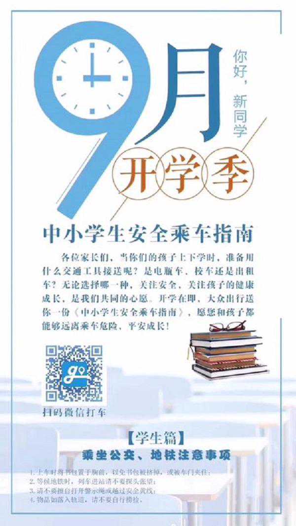 新民晚报讯(首席记者曹刚)明天开学首日,送学车流增多,叠加早高峰通勤车流,交通压力将明显加大。上海公交和出租车行业积极应对,多措并举,全力保障学生出行。 公交行业从9月开始取消夏令时刻表,暑假停开、降低发班密度的线路已恢复正常营运,并根据道路拥堵等实际情况,适时增加备车。其中,浦东公交上南公司优化调整576路、780路、980路等多条途经学校的线路时刻表,共计划增加307个班次;金高公司对130路、815路、大桥四线等10条途经学校的线路,恢复正常运能及实施增能,并调整浦东32路车型,提高载客量;南汇公司对川芦专线、龙东专线、沪南线等16条线路恢复正常运能,并针对轨交接驳和客流增长较快的线路实施增能。 图说:大众出行平台制定了《中小学生安全乘车指南》 各出租汽车企业电调中心认真做好“送学”订单预约和车辆调派落实。其中,强生出租通过经济奖励和积分政策,充分调动驾驶员积极性,尽力做好供车保障;大众出租结合旗下“大众出行”平台,在电话调度和APP软件内同时接受“送学”订单,并落实800多辆专属车辆,自动接受相关指定订单。此外,大众出行平台还制定了《中小学生安全乘车指南》,从学生乘车安全须知到家长接送孩子“四不要”,细致入微地为学生安全出行提供保障。
