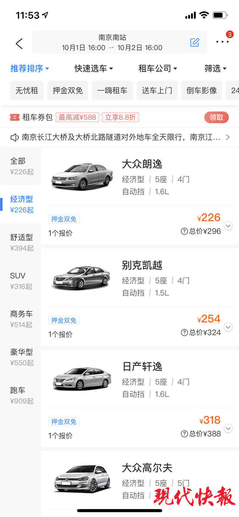 现代快报讯(记者季雨潘荣)秋天一到,南京很多地方就开启了高颜值模式,这时候不论对于南京本地人,还有外来的游客,都适合开车去兜兜风。现代快报记者了解到,时值国庆,这几天租车的客户明显增多,有些租车平台舒适型车都被一借而空,只剩下经济型、商务型和豪华型。而不仅可供选择的车型变少了,就连价格也水涨船高,有的经济型车租赁价格涨了4倍。 租车平台可供选择车型变少,租金也跟着涨了起来 国庆假期让旅游业再次迎来“黄金周”,受疫情的影响,市民的出游方式也发生了改变,自驾游成了不少人青睐的出游选择。 △9月底租车平台租车价格 现代快报记者留意到,9月底某租车平台上,租车的车型还比较丰富,经济型、舒适型、SUV、商务车、豪华型、跑车、房车应有尽有。可是到了10月1日,该平台上的商务车、房车的租赁业务就下架了。到了10月3日,只有经济型、豪华型和舒适型车辆可供租赁了。 △国庆期间租车平台租赁价格 不仅是可供选择的车型减少了,就连价格也跟着“水涨船高”起来。9月底,以雪佛兰迈锐宝、大众帕萨特、大众迈腾为代表的舒适型轿车,它们的日租金约在87元-296元不等;10月3日,这几款车型不但“一车难求”,剩下唯一一款可供租赁的舒适型轿车,别克GL8的日租金也涨至1338元。记者经过对比,发现节日前与节日中各平台租车的价格普遍上涨了3-4倍。 虽然租车价格上涨,但也没有削弱市民的热情。倩倩的老家在句容,但是平时在南京禄口工作生活,这个国庆她规划好了租个车带着家人在南京周边转转。“我租了三天,300多块钱一天,算起来租金要1000块钱。”倩倩坦言,虽然租金有点贵,但是一家出行还是开车更便捷。“我们准备去郊区农家乐转转,景点和景点离得比较远,家里4口人,打车肯定没有自驾来得方便,时间上也更自由点。” 婚嫁、亲子游学、越野自驾,今年国庆订单较2019年增长120% △朱先生提供的婚车服务 “国庆期间每天的车都排满了。”元安婚车租赁服务有限公司的负责人朱先生告诉记者,在国庆结婚潮的带动下,婚车租赁十分紧俏,接受记者采访时他正在外边做婚车服务。他介绍,除提供婚车租赁外,还提供商务、会议等用车。国庆假期,部分选择与朋友、家人一同出游的客户没有选择公共交通,选择时间安排更为灵活的租车出行,“店内的7座商务车也很受欢迎,主要是客户租出去玩。” 玄武区珠江路附近一家汽车租赁店的工作人员介绍,每年国庆假期都是租车的旺季,“基本从10月2日之后就租不到车了。”他表示,客户通常会选择空间较大的车型,人多出游时的乘坐体验也比较好些,店内车辆以中高端为主,租赁价格从二三百元到两千多元不等。 携程发布的《2021国庆旅游预测数据报告》显示,预订国庆景区门票的订单量与去年同期相比增长超三成,周边酒店的订单占比高于去年同期。随着周边游趋势越来越明显,旅游市场也涌现出一批新鲜“遛娃”方式,华东区域亲子游学、越野自驾、自然探索等周边主题产品的国庆订单量,比较2019年同期增长120%。 一嗨出行研究院发布的国庆出游趋势报告显示,由于疫情得到控制,暑假被压抑的异地游需求迅速复苏,异地自驾游的订单占据国庆订单总量的73%,相较今年中秋市场增长超14%。临近高铁站点租车订单量占比呈逐年攀升,今年国庆有望达到高峰。神州租车数据显示,其全国超过2500家服务网点预订量均呈现上涨态势,北京、上海、广州、深圳、天津、成都、西宁等热门城市近一周的订单量攀升更为明显。 市民租车时也要留个心眼,注意事项了解一下 租车行业涨价,是否有违规的嫌疑呢?江苏舜点律师事务所律师衡晓春表示,像酒店、租车这种行业,实行的自主定价机制,属于市场调节价的范围,会随着市场需求的变化而变化。在一定程度上说,节假日涨价属于他们的行业行为。“当然涨价也是有前提的,酒店、租车节假日涨价要做到明码标价,在旅游在线平台上要清晰地标明出来,确保消费者的知情权和选择权。同时,要保证节假日期间服务质量不打折,让消费者享受到货真价实的服务。如果消费者认为酒店、租车公司的行为不规范等,也可以拨打相关部门的投诉电话,进行投诉举报。” 在签定车辆租赁合同时,也有不少要注意的事项以免踩坑。业内人士提醒,首先要了解车的日限公里数和超出限数后的计费标准。其次,为防止有事不能及时还车,还应认真了解续租规定及租赁超时的计费规定,以免事后与租赁公司之间发生矛盾。另外在取车时,还要对车况进行检查。外观上要检查车体有无划痕,车灯是否完整,车锁是否正常等。然后打开车盖,查看冷冻液、机油、电瓶的状况,均无异常后,即可进入驾驶室内,检查油表、刹车、空调的运行状况,并进行试驾,判断车辆的基本状况。
