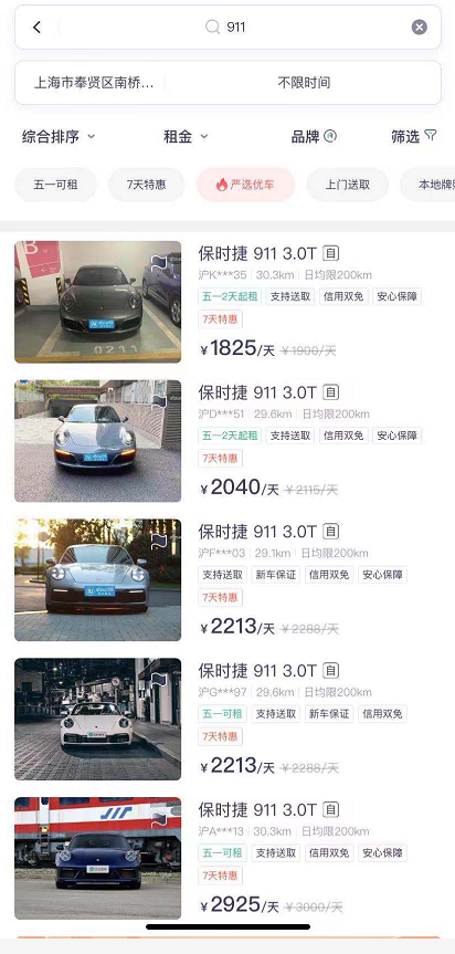 但其实这离我的用车需求还有些不同,毕竟我不是只想要一台车代步,而是能把气氛哄上去的感觉。当时我翻应用商店的时候还看到两个APP,一个叫凹凸,一个叫悟空。这两个平台就有点意思了,他不像传统租车公司,他上面展示的车辆皆是个人车主的车,平台在这其中扮演的是风控和取送车的角色。这次2系敞篷我就是在凹凸上租的,可以看到,这个APP上连保时捷911也有这么多,可能是我在上海的缘故。
