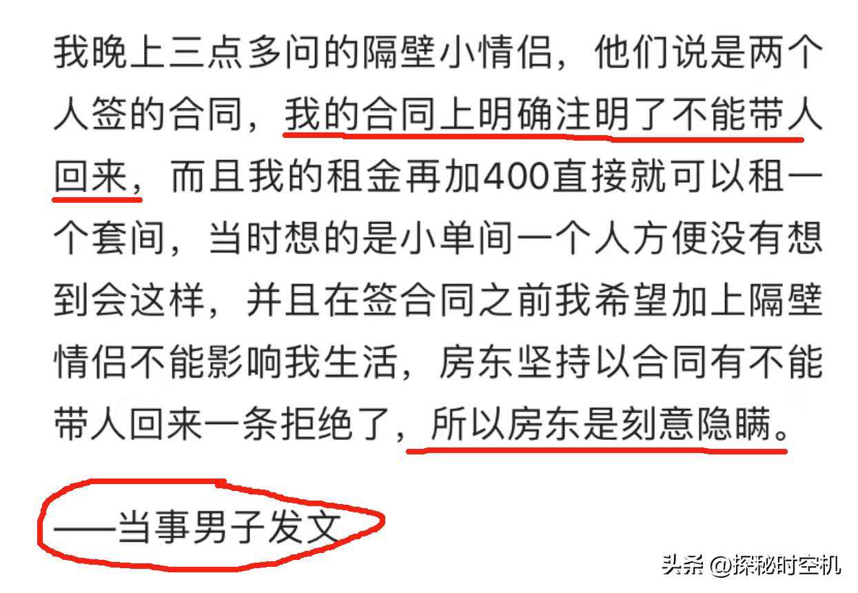看完标题先别笑,这确定不是一则笑话…… 在河南郑州,还真发生了这么一桩奇闻异事。 正在准备考研的李先生,不堪忍受隔壁一对情侣每日凌晨的噪音干扰,为了退租甘愿向房东下跪磕头! 李先生今年准备考研,为了这一影响自己未来人生的大计划,他也是下了血本,在一小区内单独租了一间屋子复习准备。 考虑到左邻右舍的干扰,李先生租房前再三向房东确认——邻居不能是动静太大的人,不然自己不租! 当时房东言之凿凿,告诉他隔壁住的是一个女孩,也是要考研的,安静的很…… 然而,刚刚住进来一个月,李先生就已经整崩溃了! 每到了深夜凌晨,隔壁屋子便发出一对情侣的各种噪音。 由于房屋隔音条件不怎么好,李先生不堪其扰,终于在一天晚上凌晨1点报了警…… 警察到达现场,李先生和隔壁的租客当场对峙。 双方在说到租房合同时,对方的一句话让李先生大吃一惊。 这对情侣明确的告诉他,当初他们两人是一起去和房东签的租房合同,房东当然知道是情侣租房! 李先生愤怒的发现,自己被房东欺骗了! 考研对自己相当重要,李先生不敢有丝毫闪失。 然而一个月以来的噪音干扰,他的精神已经濒临崩溃,自己还去医院做了检查,得到了“轻度抑郁”的诊断结果! 这房子,真的是住不下了…… 可是,李先生又面临一个新的问题——刚入住一个月就要退租,房东能够轻易答应并返还押金吗? 李先生情绪激动的和房东对峙,质问她为什么要隐瞒隔壁租客是情侣的情况? 房东自知理亏,开始顾左右而言他…… 或许是感觉到自己退租举步维艰,李先生忽然做出了惊人之举! 扑通一声,李先生跪倒在房东面前! “我给你磕头!我给你磕头!” 现场的气氛瞬间变得尴尬。 谁也没有想到小伙子会崩溃到这个地步,不就是退租金嘛,真的可以舍下“男儿膝下有黄金”的尊严吗? 网传有一段发文,据说是李先生曝光该事件时写下的…… 从这段文字我们还可以整理出一些细节信息: 1、李先生应该是租的合租房,和那对情侣在一个套房内的两间屋子。 2、合同上明确写了隔壁不能带人回来。 3、房东是刻意隐瞒真实情况。 想来,李先生也是挺让人同情的。 显然,李先生是被逼急了,这才做出了下跪求退租的举动。 最终,房东也是被这阵仗给吓住了,终于同意退房,一切顺利解决! 这事儿,听起来有点奇葩,不过站在考研小伙的角度想,却也能理解…… 考研是人生大事,未来成败在此一举,因此他格外看重。 但是,房东为了利益隐瞒关键信息,造成了他近一个月的噪音干扰导致神经衰弱,相当于浪费了一个月的复习时间呢! 多宝贵的学习时间啊……