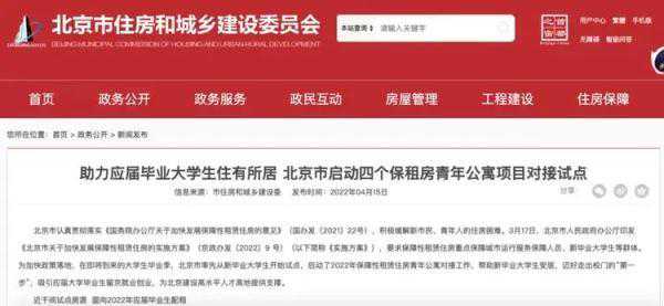 为助力新毕业大学生安居 吸引应届大学毕业生留京就业创业 北京市于今年4月启动了 首批保租房青年公寓试点项目 4个试点项目 分处朝阳、海淀、房山、昌平四区 近1000间房源 均为全装修交新房 配置家具家电 租金均低于市场水平 受到毕业生的热烈欢迎 累计登记2983人 人房比达3:1 目前试点项目已全部办理入住 项目试点是如何选定的? 首批保租房青年公寓试点项目选择在海淀、朝阳、房山、昌平四个区,因为试点区域高校聚集,有良乡大学城、沙河大学城及海淀众多高校,毕业生规模大,同时又拥有中关村科学城、未来科学城、中关村房山园、CBD等就业比较聚集的功能区,有助于职住平衡。 试点房源的数量、配置、租金如何? 4个项目试点房源共653套、近1000间,既有集体土地租赁住房,也有重点功能区配套的人才住房,均为全装修交付新房,配备家具家电,毕业生可以“拎包入住”。 同时,试点房源户型多样,既有26-35平方米的单间公寓,也有两居室、三居室分租房屋。大部分项目月租金在2000元至3000元,最贵的月租金不超过4800元。 海淀区田村山樾嘉园项目实景图 朝阳区平乐园项目实景图 房山区西潞街道夏庄村保租房项目实景图 昌平区未来融尚项目效果图 试点项目是如何开展的? 今年6月底,4个试点项目启动了配租登记。有意向且符合条件的2022年新毕业生,通过登录北京保障房中心有限公司网站,详细了解房源情况,在登记并通过审核后进行选房和看房,毕业季结束后陆续签约入住。 拎包入住,自选室友租金比同地段便宜千元 作为唯一的市级统筹项目,朝阳区平乐园项目由市保障房中心建设持有,目前已为114人办理了入住。 该项目位于朝阳区劲松地区,距离周边商场及地铁九龙山站约300米,地理位置优越,周边配套设施齐备,共为大学毕业生提供206套、489间房源,均为两居室、三居室分租房屋。 朝阳区平乐园项目小区环境图 房屋全装修交付,实行按间分租,每名毕业生租住1间卧室,客厅、餐厅、卫生间和厨房为公共区域,同时配备冰箱、电磁炉、空调、床、沙发、书桌、衣柜、宽带网络等基本生活设施。 大部分房间租金在2600至4800元之间,低于周边同地段、同品质市场租赁住房租金,其中包含物业费、家具家电租赁费、供暖费及网费,实行动态调整。 除此之外,小区在首层配备共享休闲区,包括运动健身区、书吧阅读区、共享会客区、休闲娱乐区四大功能区。 配租对象范围将扩大京外院校毕业生也有份 “十四五”期间,北京市计划建设筹集保租房40万套(间),重点保障新毕业大学生、城市运行服务保障人员等群体。 市住建委表示,在总结首批大学生公寓试点经验的基础上,第二批次的项目也即将推出。值得一提的是,配租对象范围将扩大到在京毕业3年内的学生,以及京外院校毕业、在京就业的学生。 未来,还将推出更多优质项目,帮助大学毕业生、青年人实现“安居梦”,为北京建设高水平人才高地提供支撑!