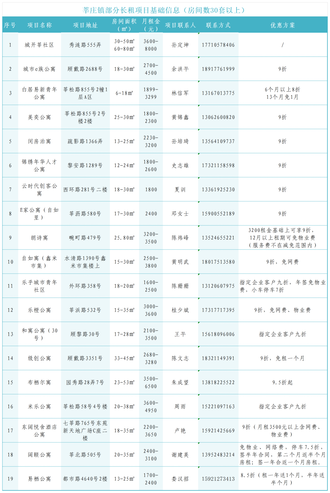 公司离家近、通勤时间短,这是许多上班族梦寐以求的生活环境。随着城市的发展和居民需求的变化,如今,住房形式变得越来越多样化,各类配套服务也在不断完善,长租公寓为都市的寻梦人提供了一个个温暖的栖息地。 莘庄镇为解决本镇企业员工住房难的问题,营造更优营商环境,连同镇招商服务中心整理了莘庄镇内的优质长租公寓,希望能为你的租房选择提供帮助。 乐橙公寓 乐橙公寓位于闵行区莘浜路532号,地理位置优越,出门即莘庄公园,步行15分钟可达凯德闵行商业中心,距离1号线莘庄地铁站骑行仅需7分钟,地铁30分钟直达人民广场,23分钟直达徐家汇。 公寓为电梯房,有一居室和Loft两种户型,房间面积在23—38平方米,月租金为2600—3600元不等。每个房间都有超大外窗,独门独户,不仅有独立卫生间、洗衣机、品牌家电设施齐全,还有电信光纤单独入户。 此外,公寓还提供全天候的楼道门禁系统、电子门禁系统、24小时贴心管家保安服务,居民还可选择在线支付水电费。 Loft户型 一居室户型 交通配套:距离1号线莘庄地铁站1.9千米,步行500米可乘坐公交700路、闵行31路、150路、166路等。 生活配套:附近商圈有凯德闵行商业中心、美莘商业广场。1.5千米内有闵行区中心医院以及中国、民生、农业等多家银行支行,2千米内有莘松市集菜市场。 生活费用:电费1.3元/度,水费6元/吨。 付款方式:季付月付均可,月租长租随意租。 白居易新青年公寓 (闵行莘松路店) 白居易新青年公寓位于闵行区莘松路855号,公寓主打Loft户型,装修风格现代明亮、清新精致,目前有小户型、朝北外窗Loft型和F区衣帽间户型3种房型可供选择。房间面积6—18平方米,月租金为1899—3299元不等。 公寓的每个房间都配备智能门锁,一客一锁,安全感直接拉满。床、桌椅、独立卫浴、家电家具等设施齐全,轻松实现拎包入住! 交通配套:距离1、5号线春申路地铁站3千米、莘庄地铁站1.9千米,步行500米可乘坐公交125、153、松莘线、松莘线B线、闵虹1线。 生活配套:附近商圈有美莘商业广场、亚繁亚乐城、凯德闵行商业中心,1.5千米内有莘松市集菜市场,2千米内有中国银行、民生银行和招商银行,距离闵行区中心医院1.6千米。 生活费用:冷水7.5元/吨,热水50元/吨,电1.2元/度,网费50兆60元一个月,100兆90元一个月。 付款方式:押一付一,押金原价。 自如寓 (近鑫米市集) 自如寓位于闵行区水清路1390号鑫米市集2号楼,步行17分钟(或骑行6分钟)可到达12号线虹莘地铁站2号口,步行20分钟可达12号线七莘路地铁站,乘坐公交闵行8路可直达上海南站。 公寓房间均为Loft户型,房间面积在15—30平方米,月租金为2500—3800元不等。在公寓的公共区域,配套有健身区、休闲区、台球桌、乒乓球桌等,满足居民的一切娱乐需求。 为保证居民的居住安全,每间房间的居住人数不得超过两人,房间内的所有人都需进行实名登记。此外,房间内禁止大油大烟、使用明火以及电瓶充电,房间门口及楼道内禁止堆放任何个人物品。 交通配套:距离12号线七莘路地铁站1.3千米、12号线虹莘地铁站2千米,步行300米可乘坐公交闵行8路、137路和759路。 生活配套:出门即鑫米市集,周边100米内有港澳购物中心和闵莘茶城,500米可到达莘庄社区卫生服务中心。 生活费用:水费6.5元/吨,电费1.05元/度 值得一提的是,莘庄镇还与各大长租公寓携手推出了限时优惠活动,具体内容如下: 莘庄镇招商服务中心 地址:七莘路1189号莘海科技园6号楼3楼 时间:8:30—11:00,13:30—17:00