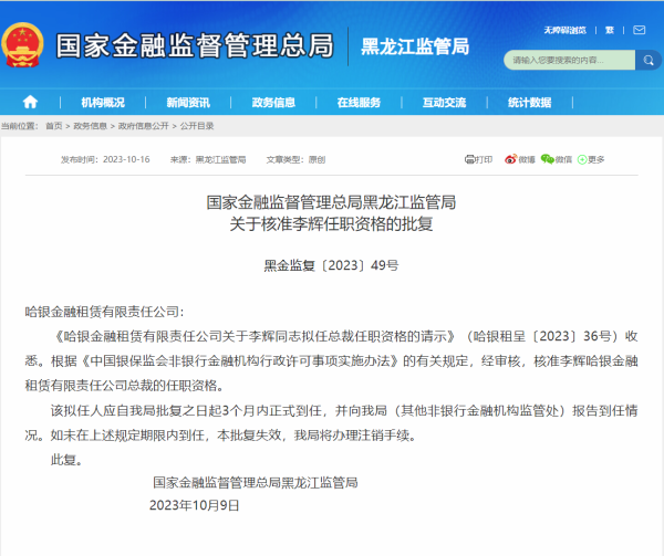 中国网财经10月16今日,金融监管总局官网公布一则批复信息显示,哈银金融租赁拟任总裁李辉任职资格获国家金融监管总局黑龙江监管局核准,批复时间为2023年10月9日。 以下是相关批复正文: 哈银金融租赁有限责任公司: 《哈银金融租赁有限责任公司关于李辉同志拟任总裁任职资格的请示》(哈银租呈〔2023〕36号)收悉。根据《中国银保监会非银行金融机构行政许可事项实施办法》的有关规定,经审核,核准李辉哈银金融租赁有限责任公司总裁的任职资格。 该拟任人应自我局批复之日起3个月内正式到任,并向我局(其他非银行金融机构监管处)报告到任情况。如未在上述规定期限内到任,本批复失效,我局将办理注销手续。 此复。 国家金融监督管理总局黑龙江监管局 2023年10月9日 (责任编辑:谭梦桐)